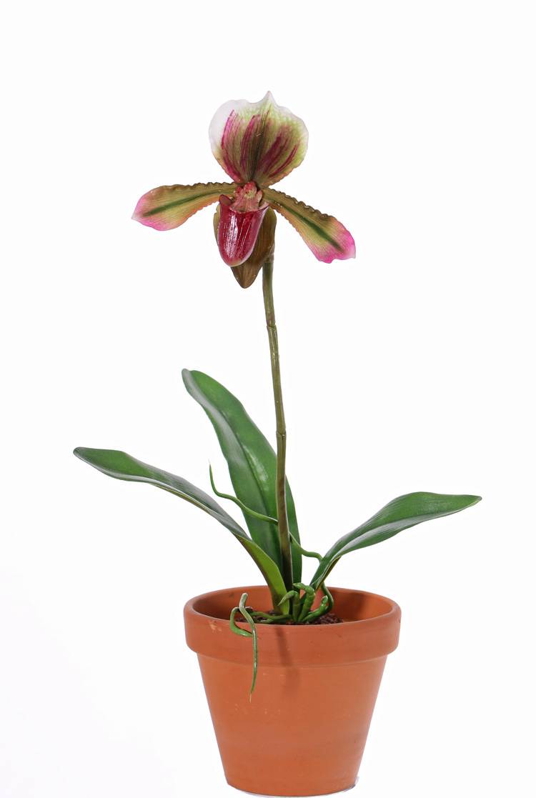 The Paphiopedilum faux orchid VELANA convinces with its natural coloured blossom made of real touch material.