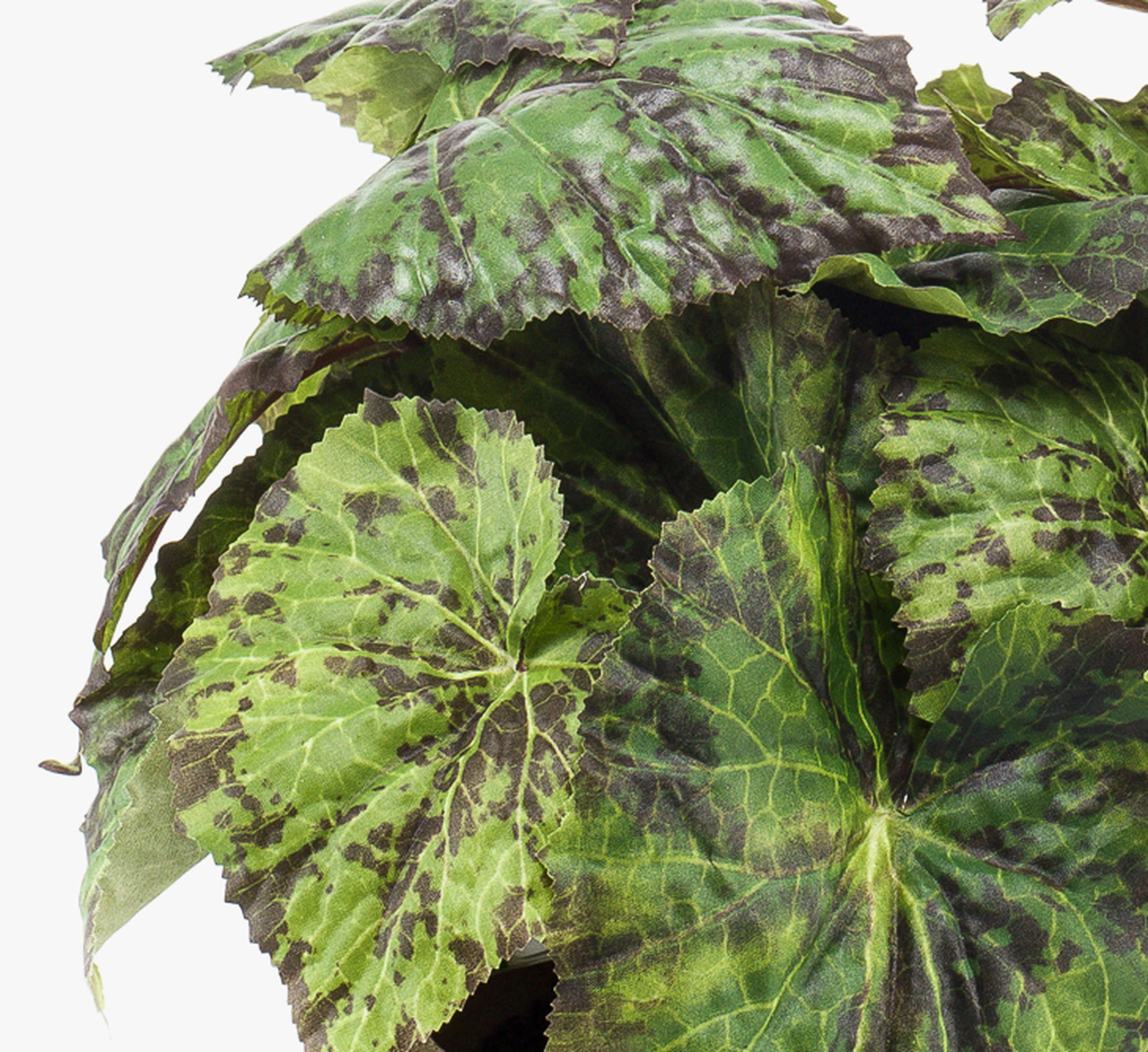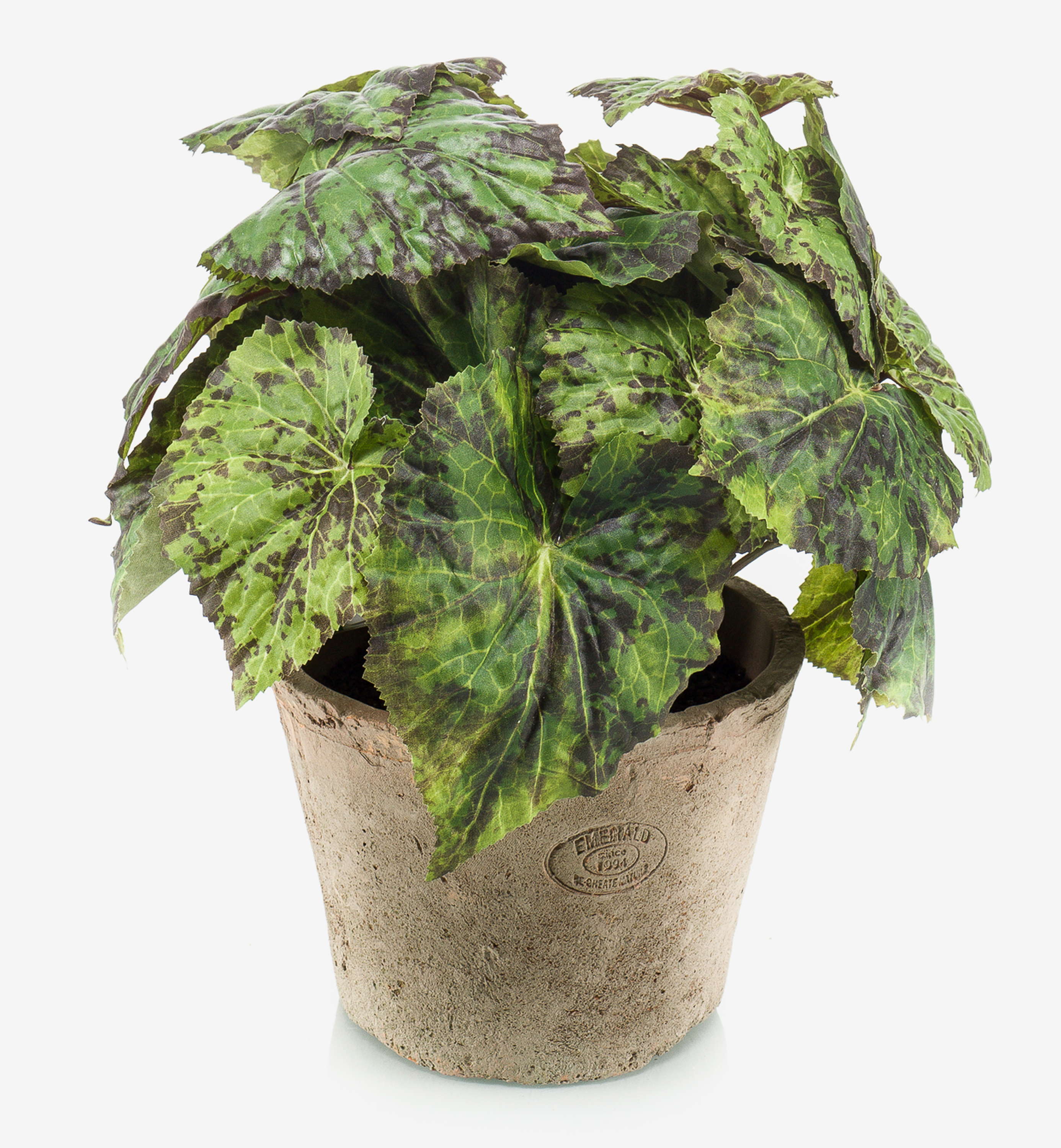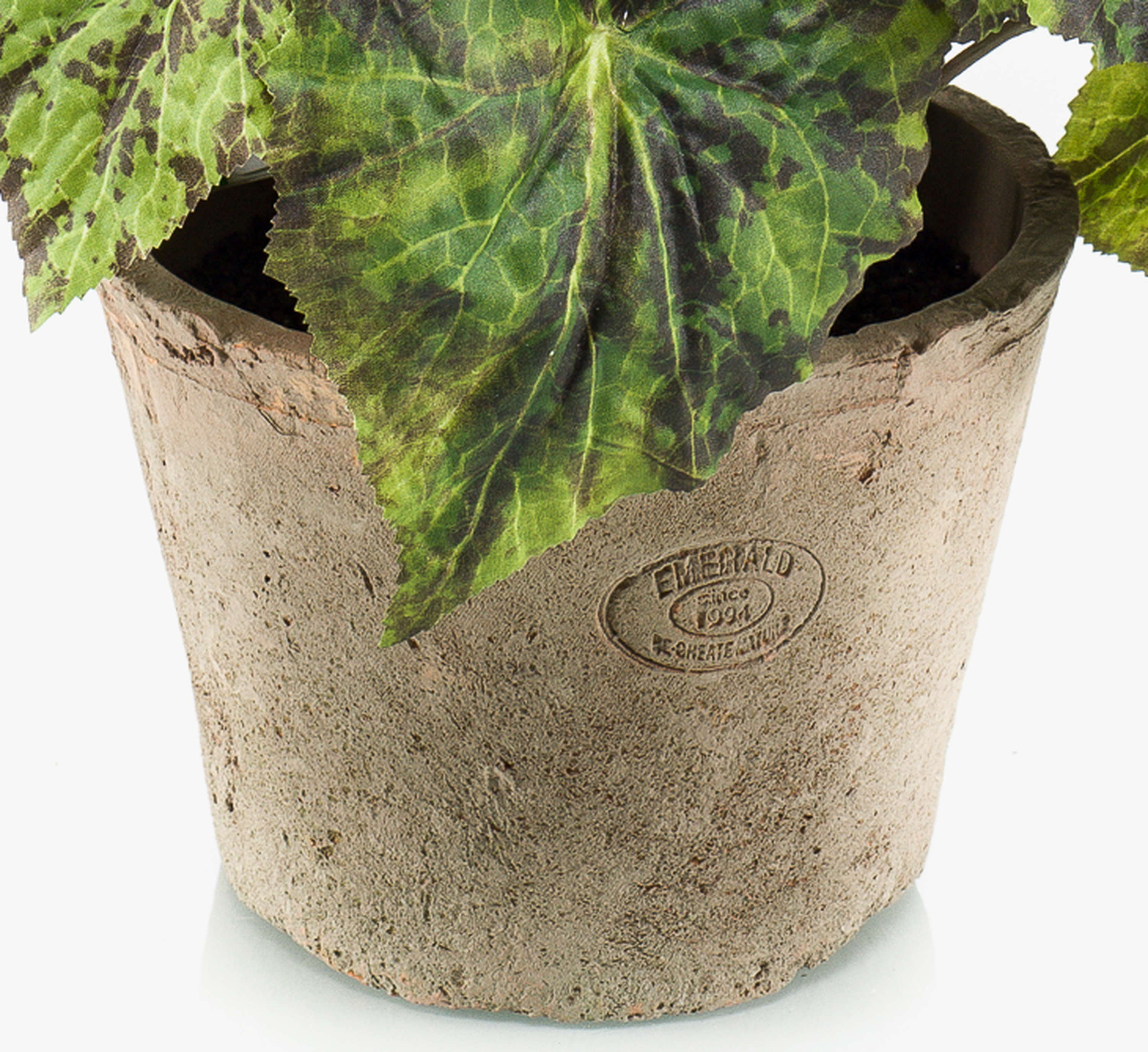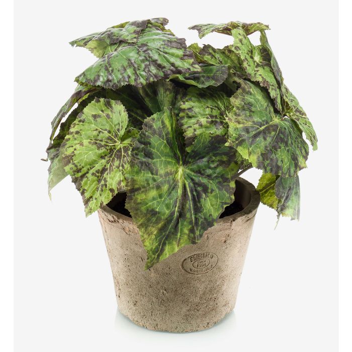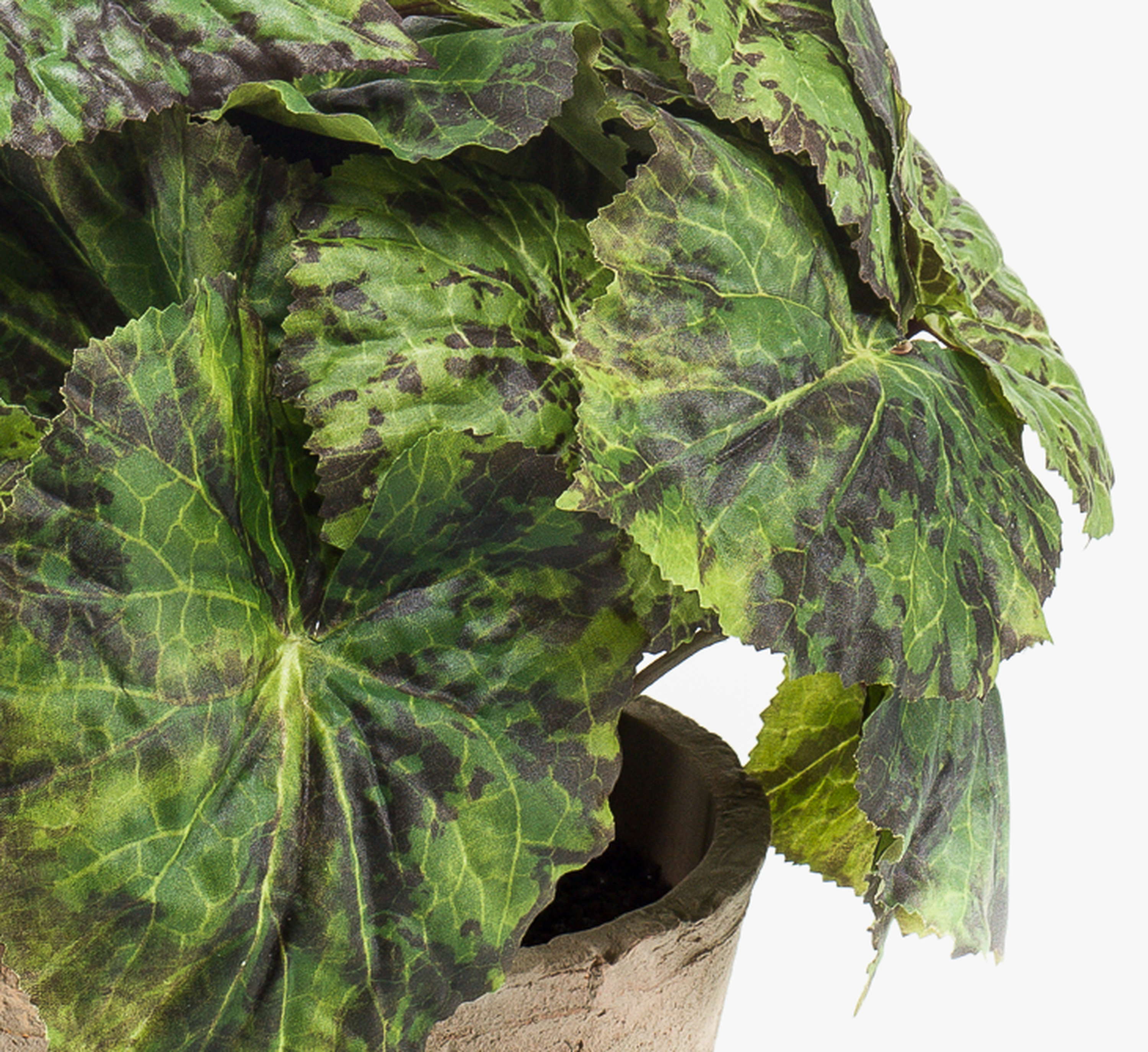 Artificial painted leaf begonia MEIRA in terracotta pot, bushy, green-black, 10"/25cm