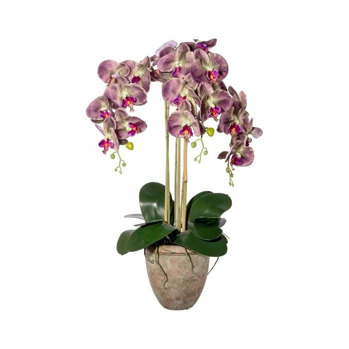 Artificial Phalaenopsis orchid FRIMTOR in terracotta pot, roots, green-purple, 30"/75cm