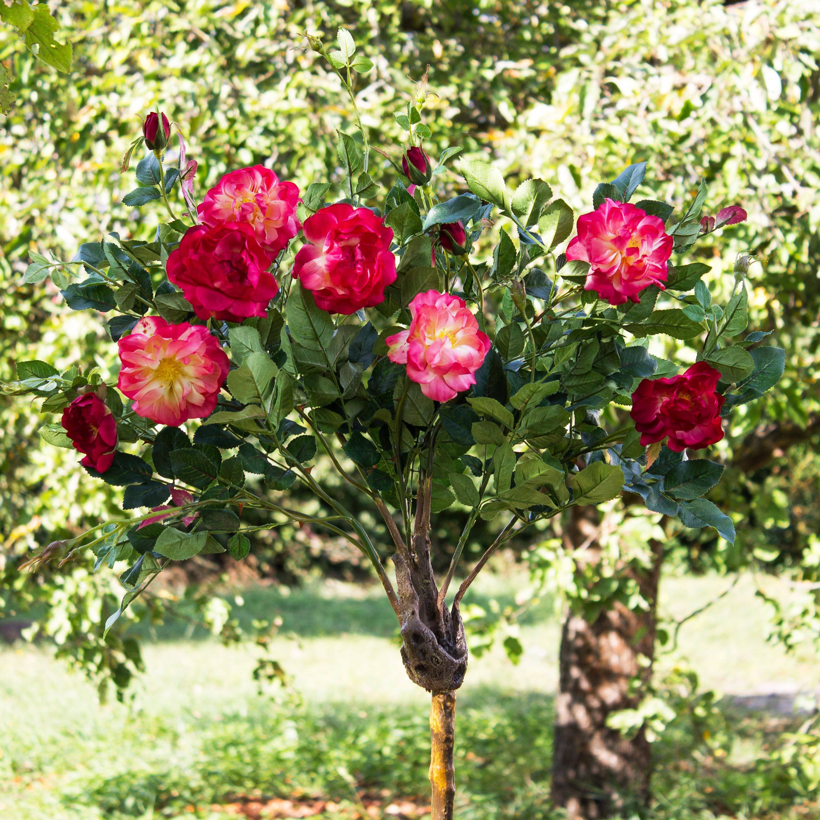 Artificial rose ball tree will impress with 8 blooms and 4 buds. The rose ball tree is approx. 4ft/135 cm high and has a flexible artificial stem.