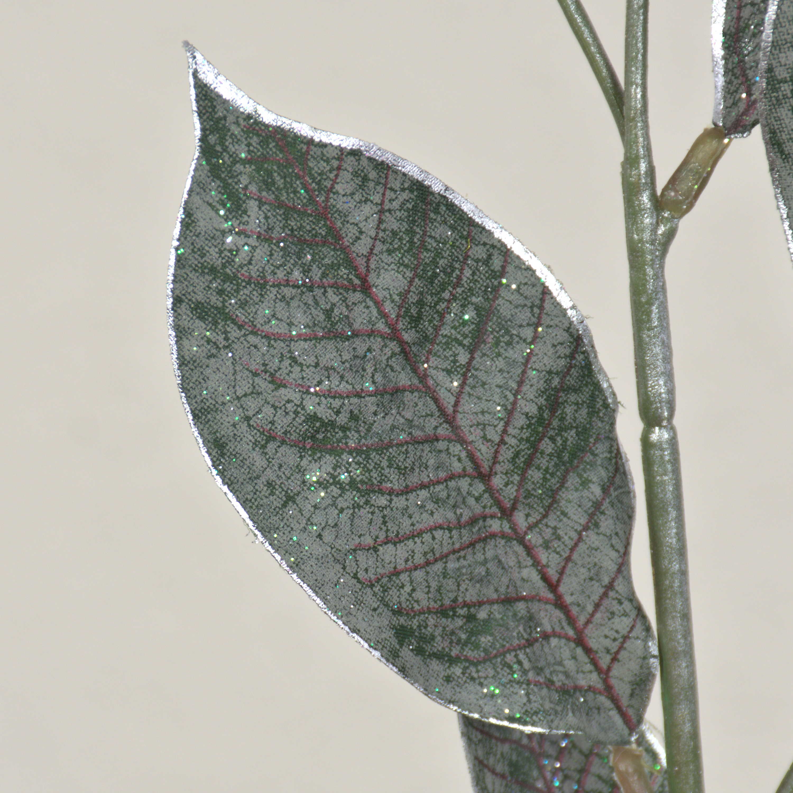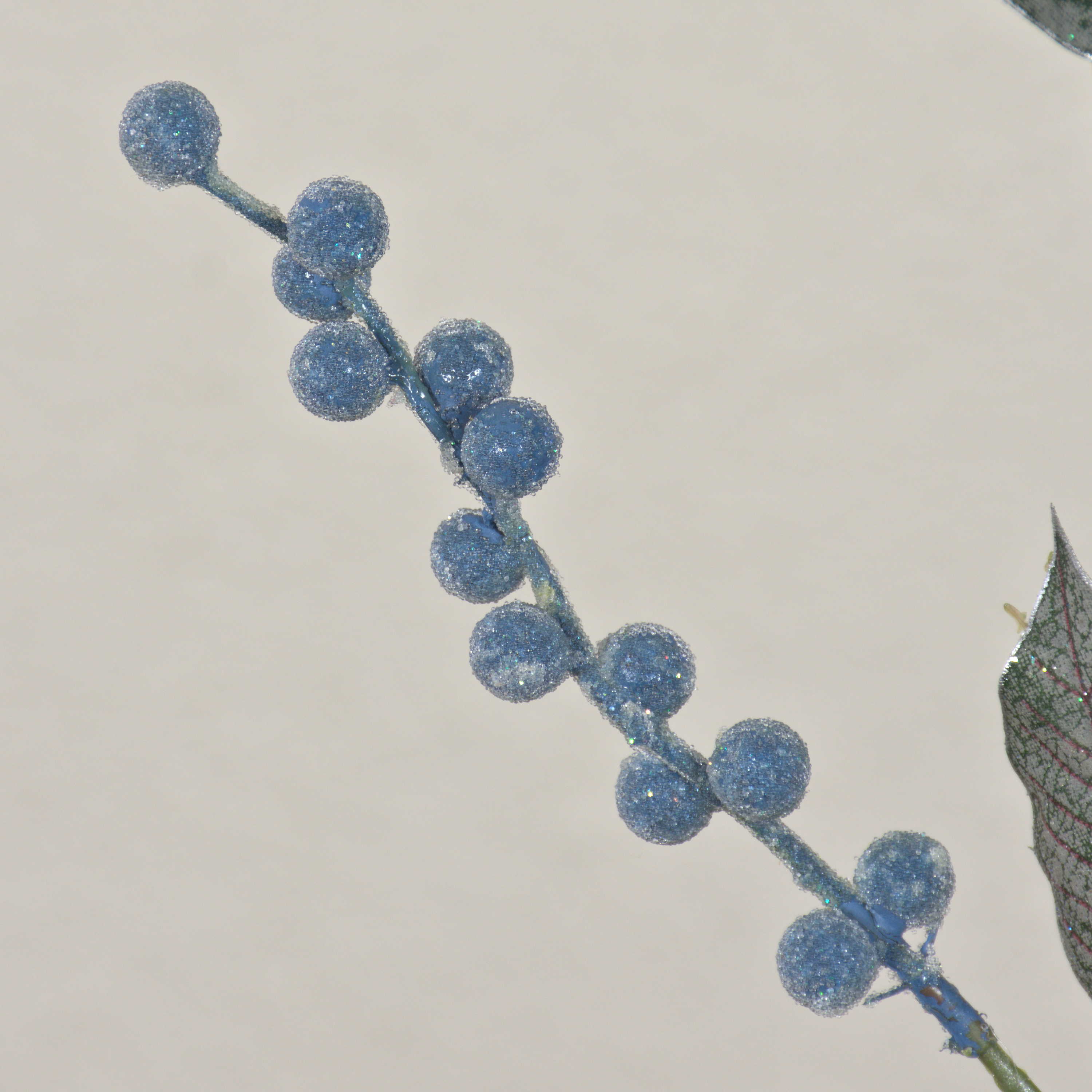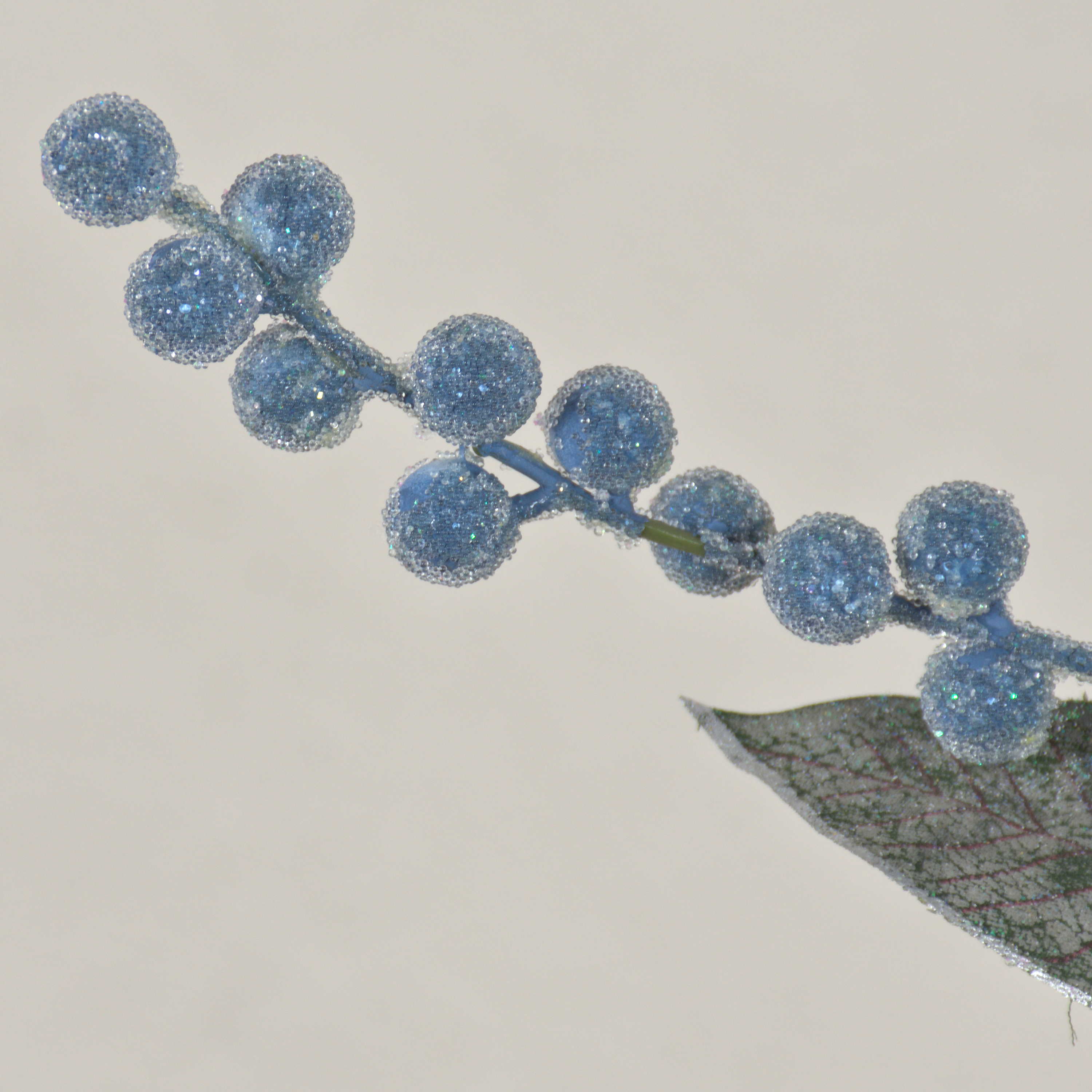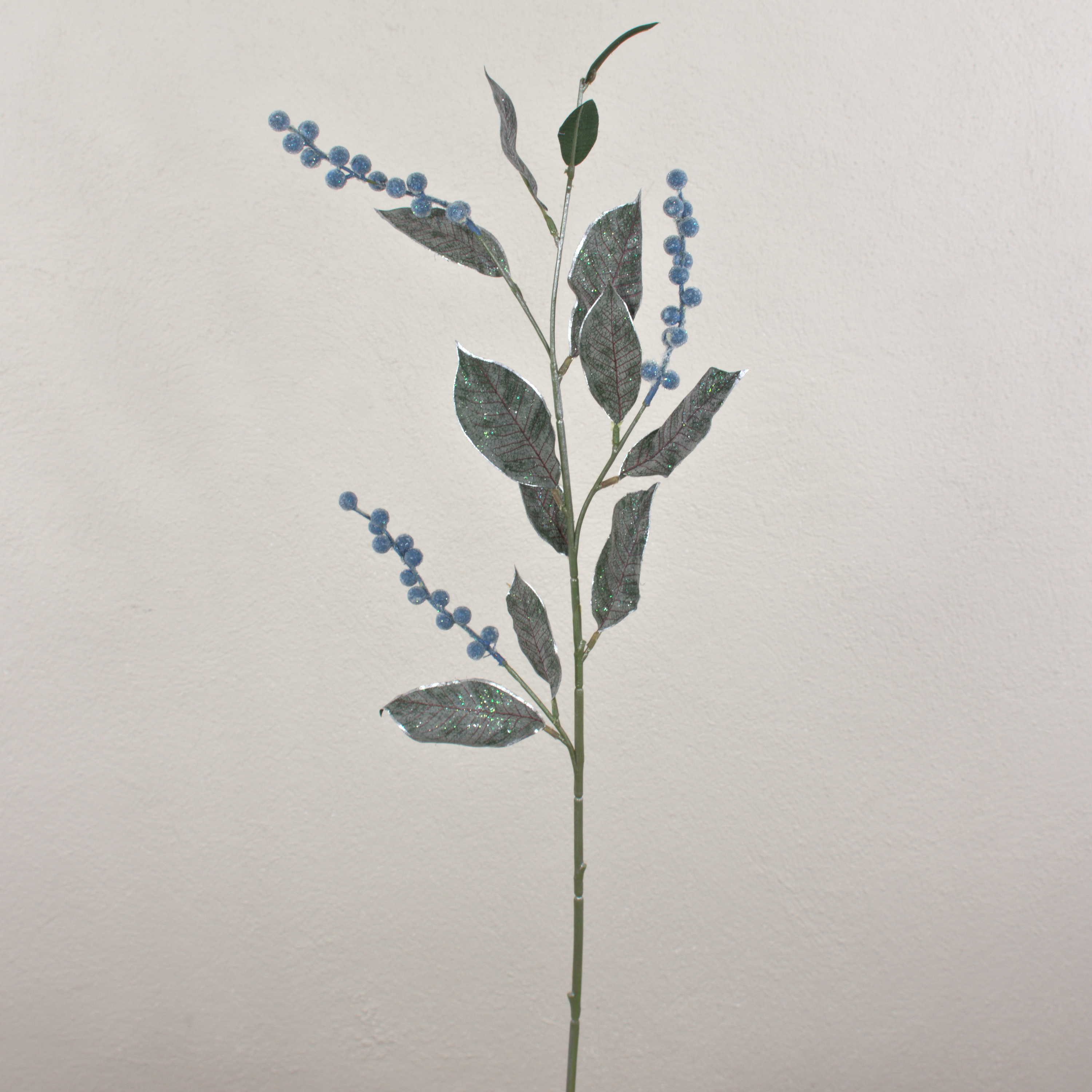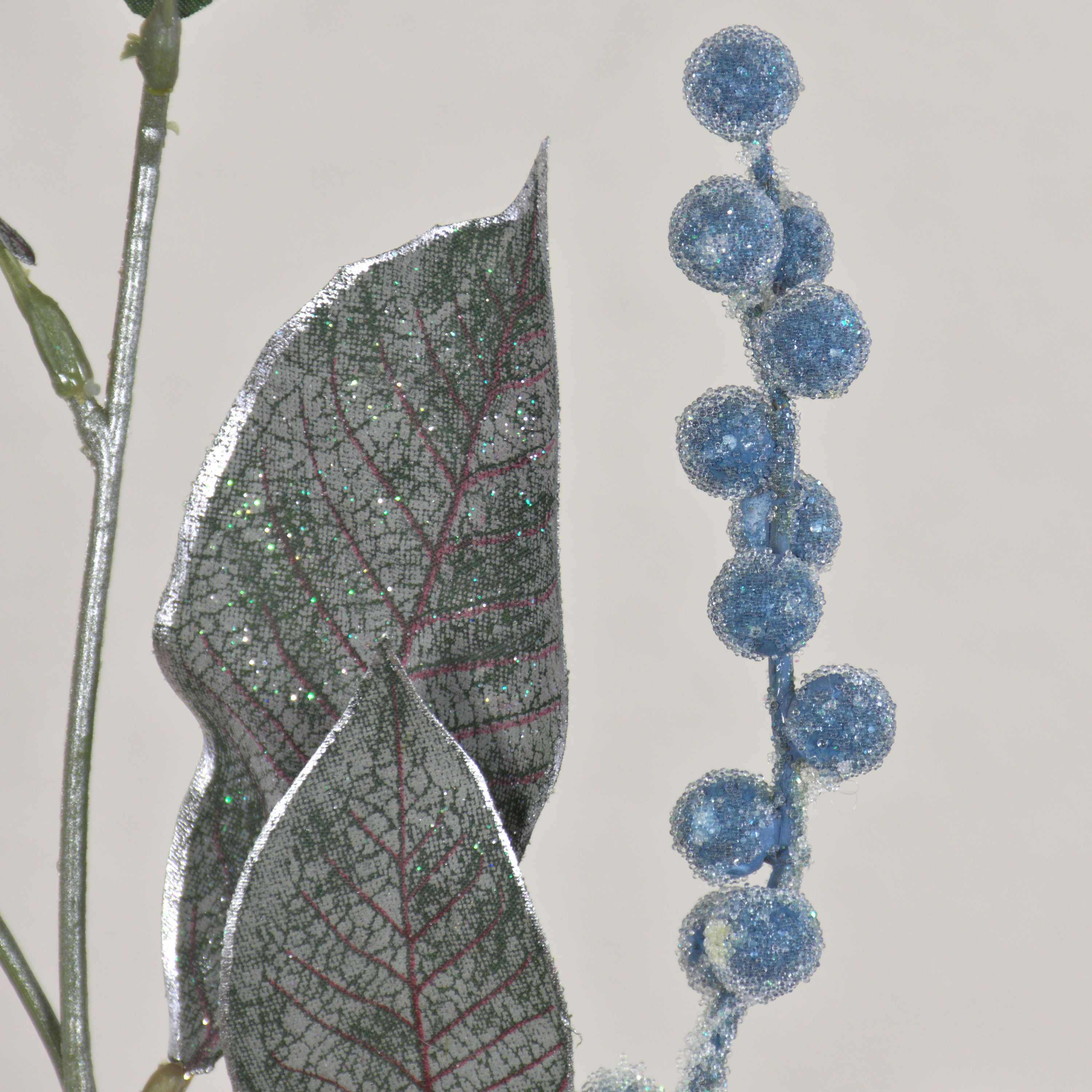 Wintry artificial berry branch ELYSA with silver framed leaves and glitter particles for a frosted look.