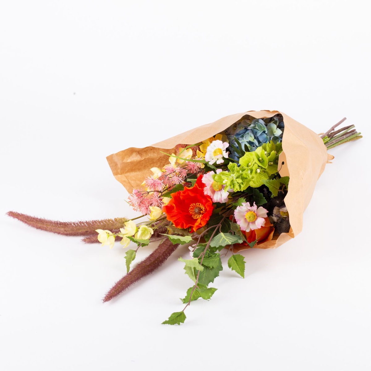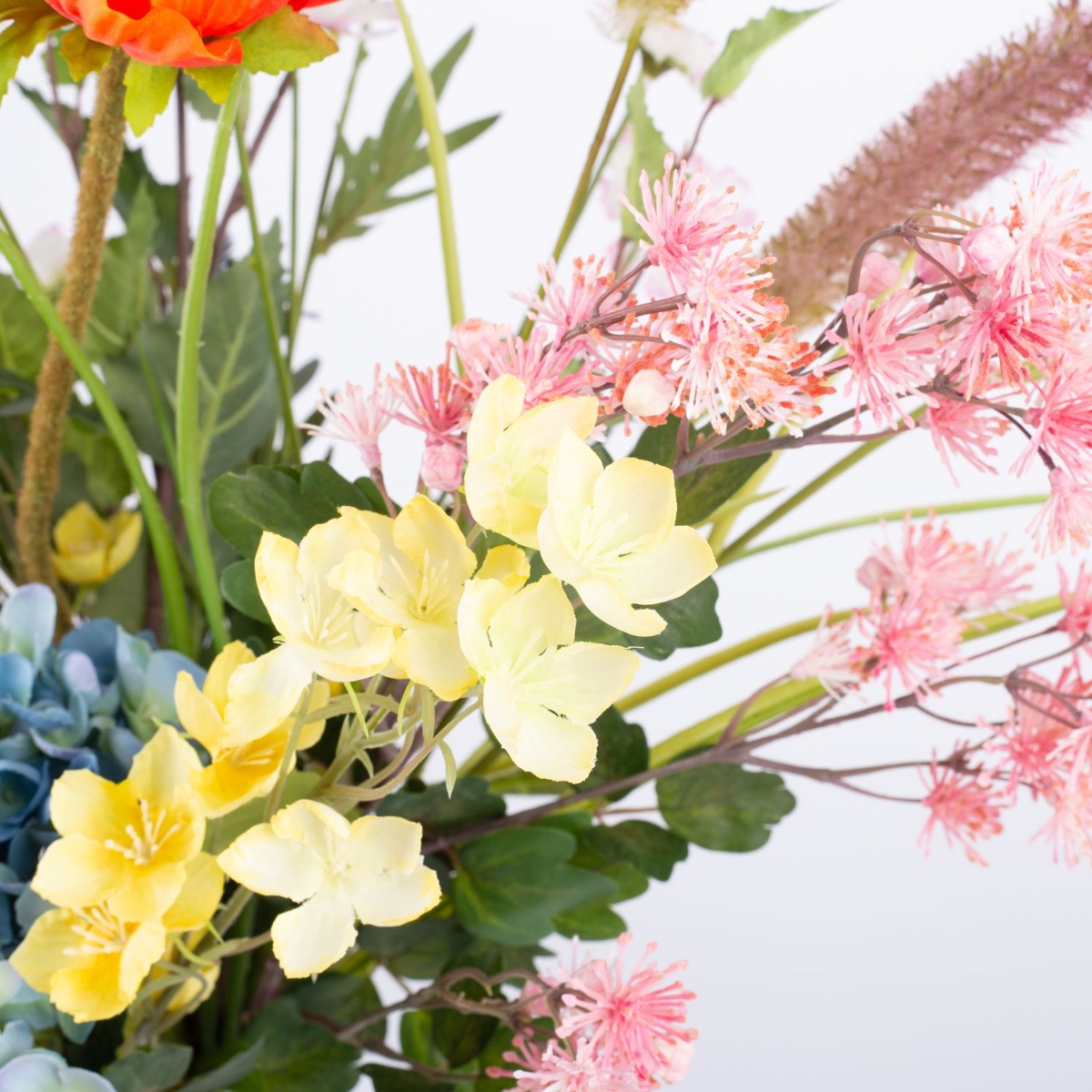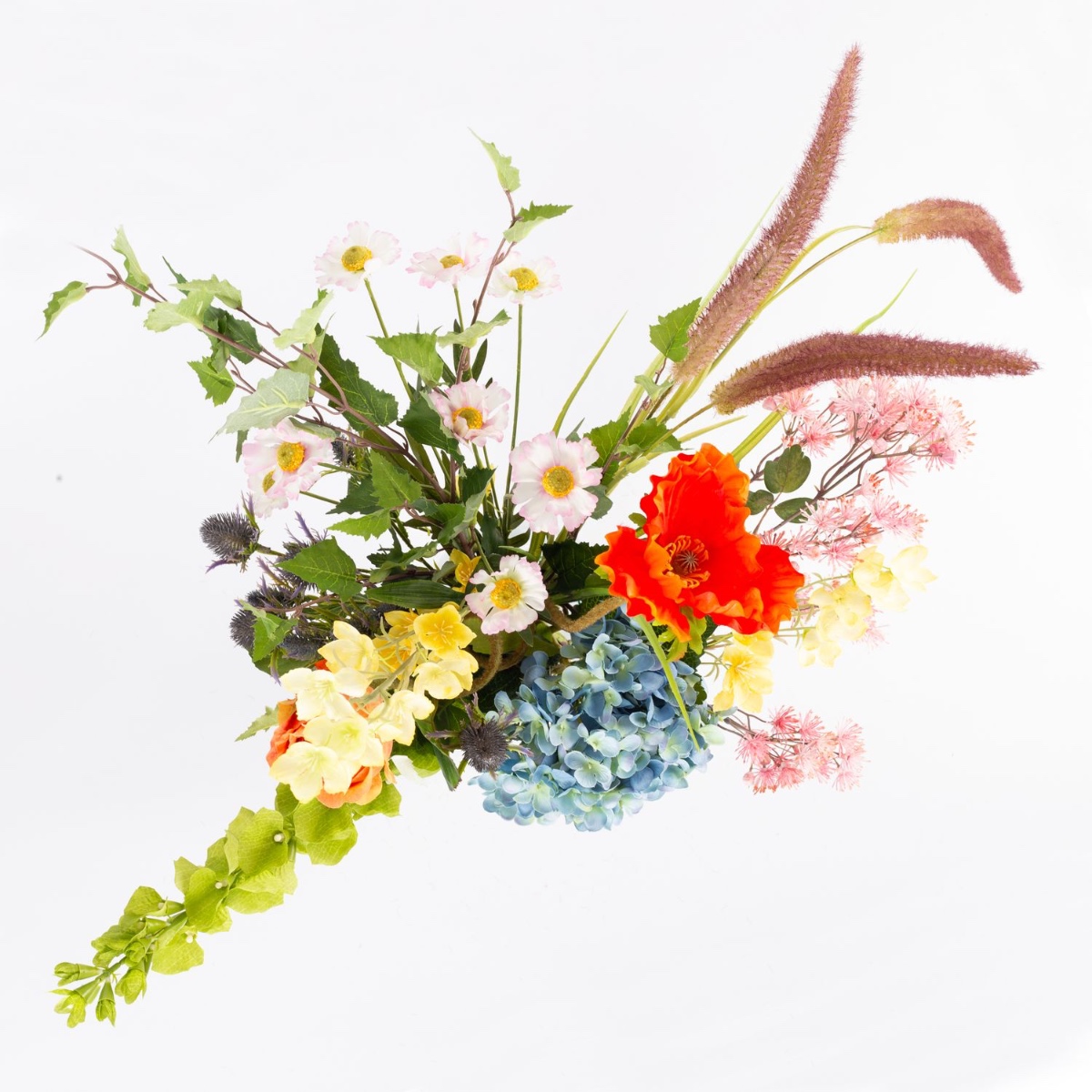 - Artificial bouquet JOLENA consisting of the following or at least equivalent products: lush hydrangea, elegant rose, delicate poppy, long-stemmed shellflower and buttercup, prickly thistle, pretty meadowsweet, dainty daisy and foxtail grass as well as birch as an accessory
