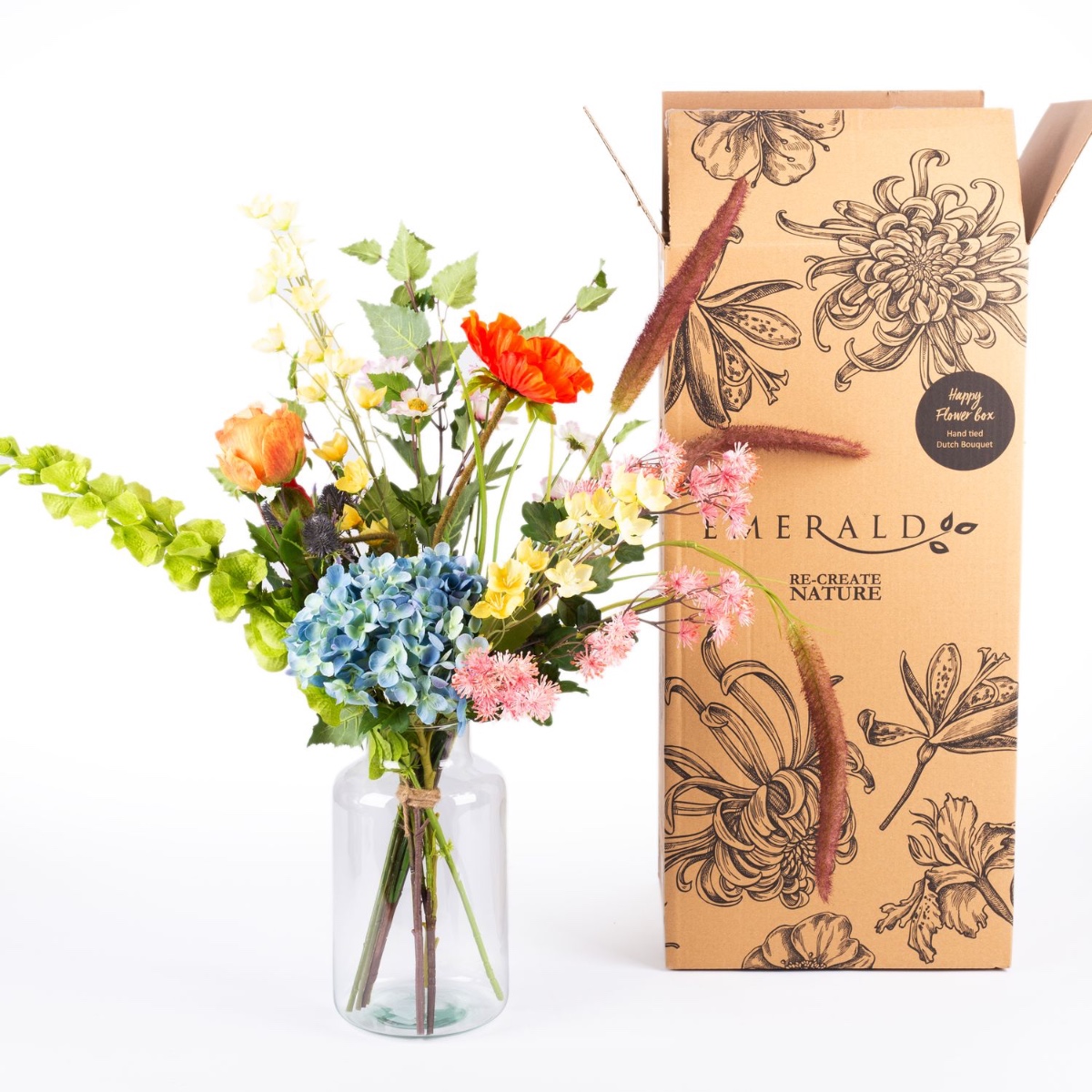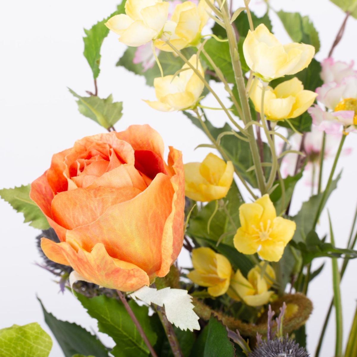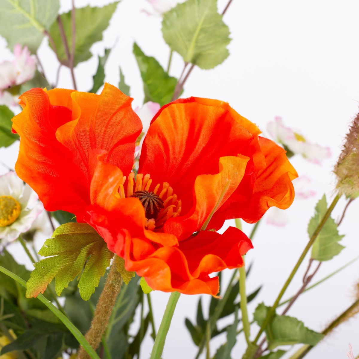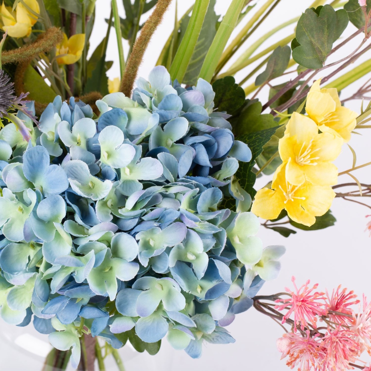 - Artificial bouquet JOLENA consisting of the following or at least equivalent products: lush hydrangea, elegant rose, delicate poppy, long-stemmed shellflower and buttercup, prickly thistle, pretty meadowsweet, dainty daisy and foxtail grass as well as birch as an accessory