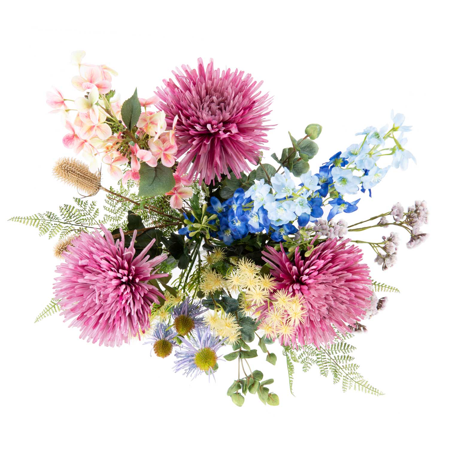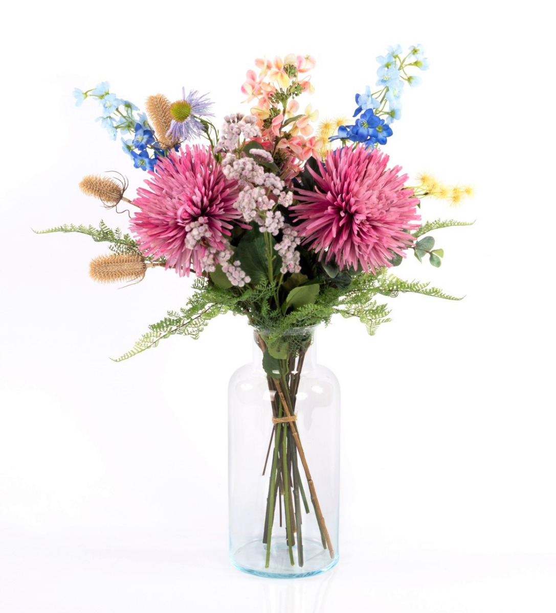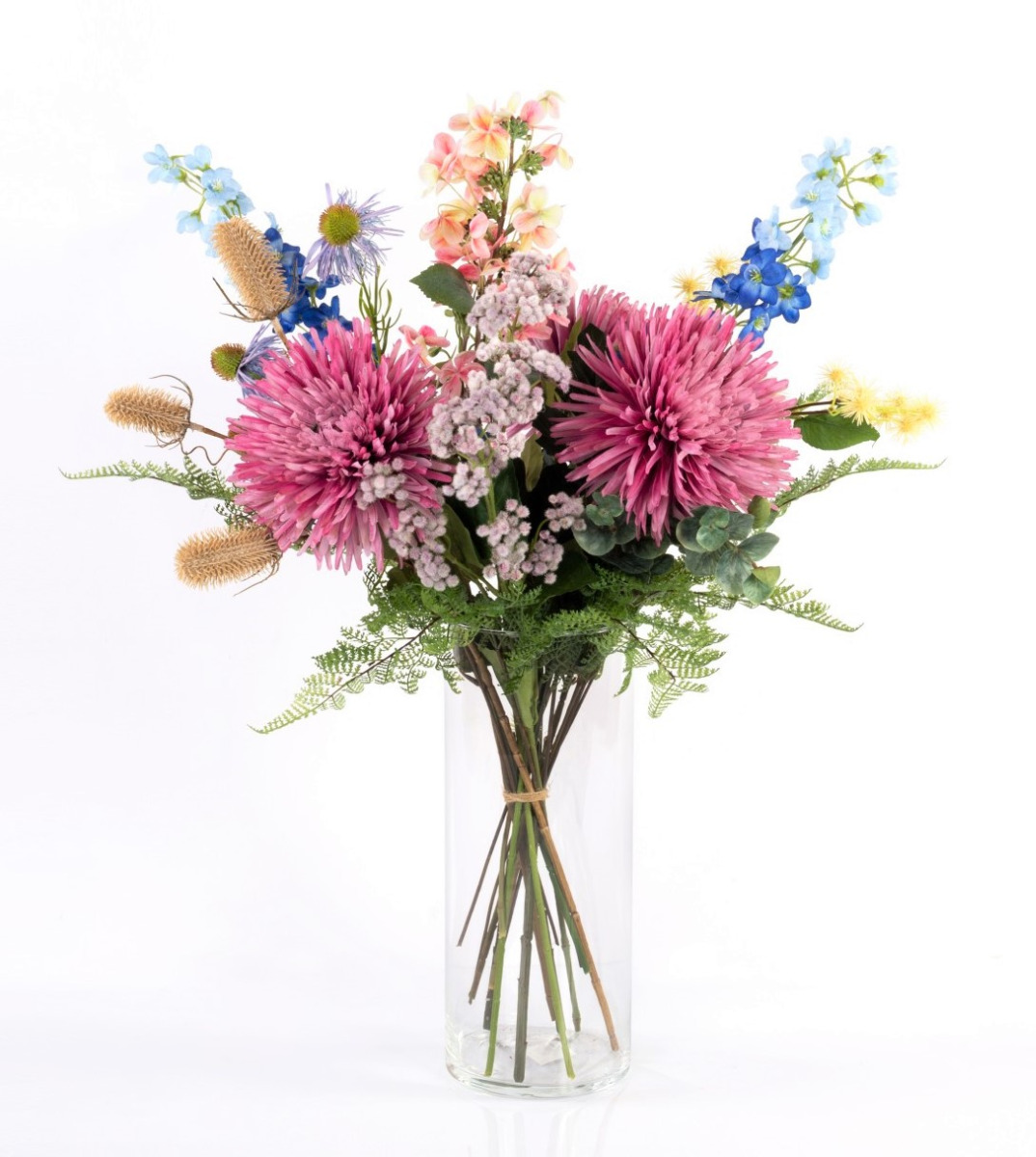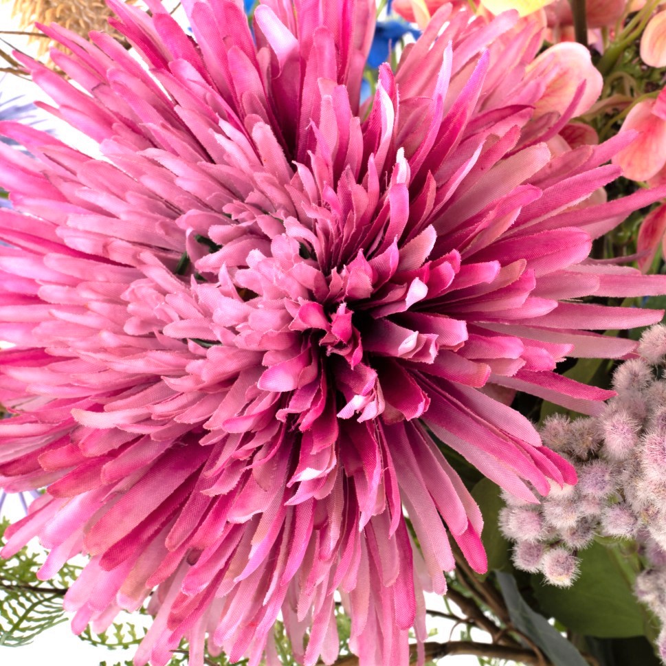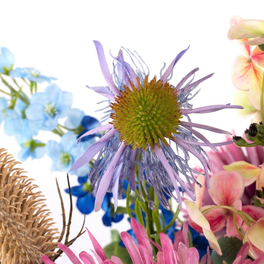 This artificial bouquet LOLANA is an enchanting summer greeting. Alongside lush chrysanthemum, playful coneflower and friendly wild cardoon, delphinium and panicle hydrangea stand out from the floral ensemble.