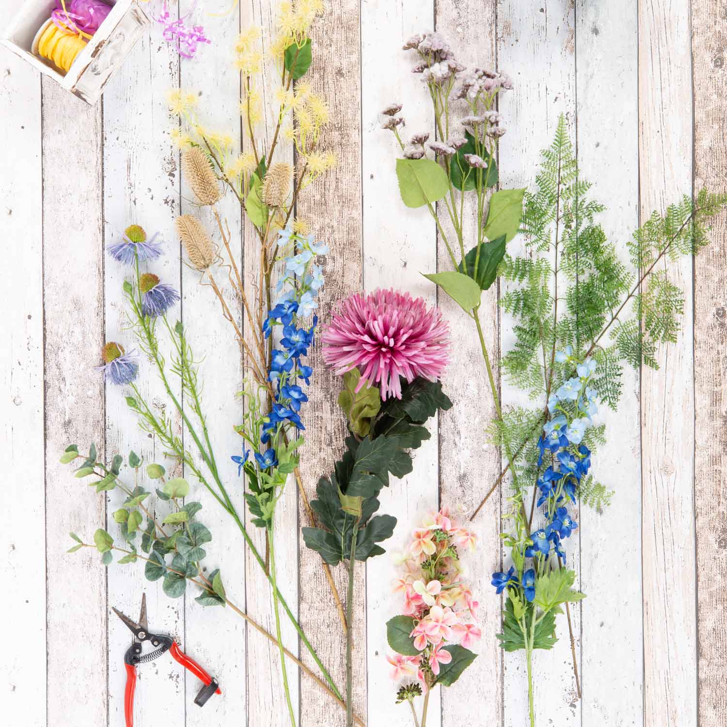 | Other names | Chrysanthemum, delphinium, hydrangea, wild teasel, coneflower, eupatorium, castor bean, eucalyptus, shield fern |
