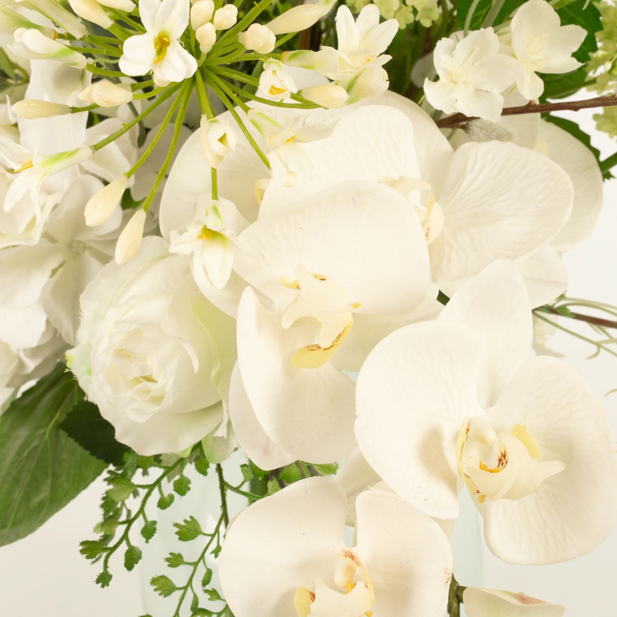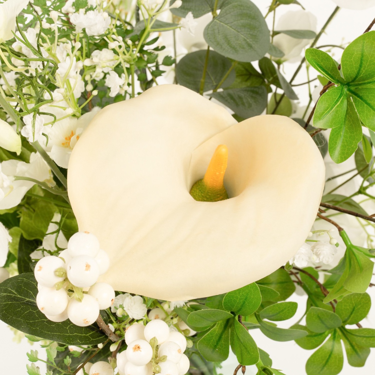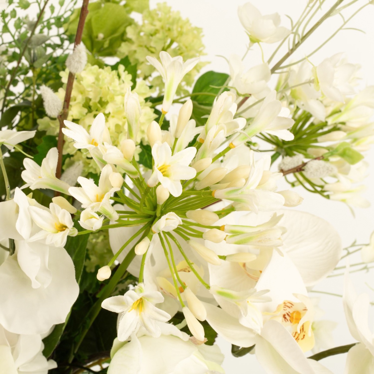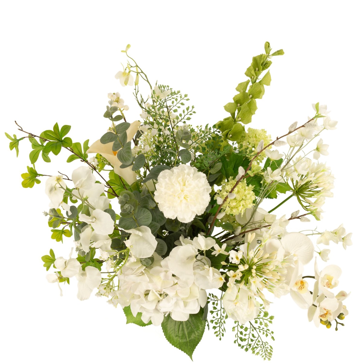 - Artificial bouquet FUYUKO consisting of the following or at least equivalent products: snowball-like agapanthus, snowberry and snowball blossoms, classy calla and rose, lush hydrangea, classic carnation, long-stemmed shellflower and larkspur, elegant orchid, delicate lathyrus and buttercup, fine gypsophila, fluffy willow catkin and fern, eucalyptus and canary creeper as an accessory