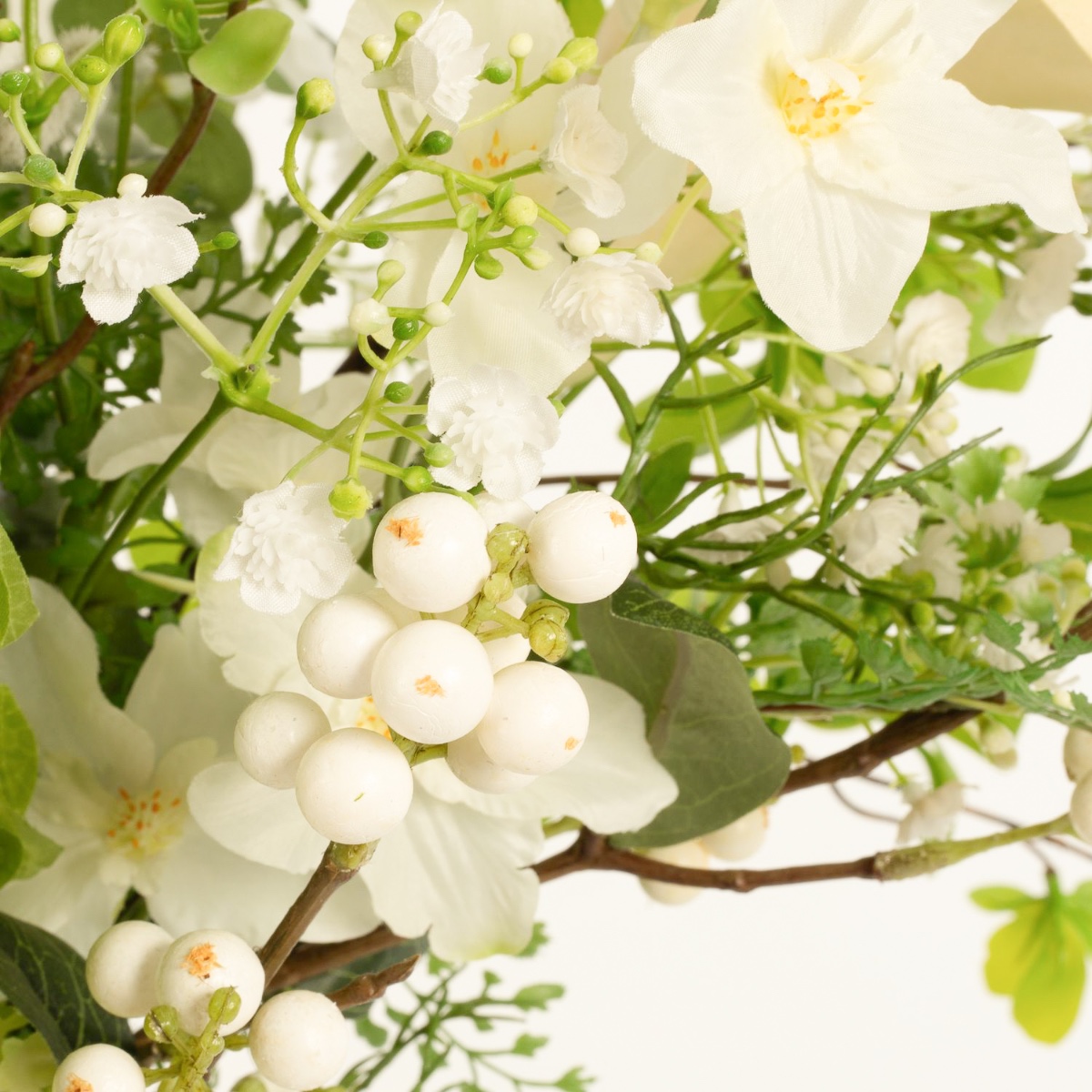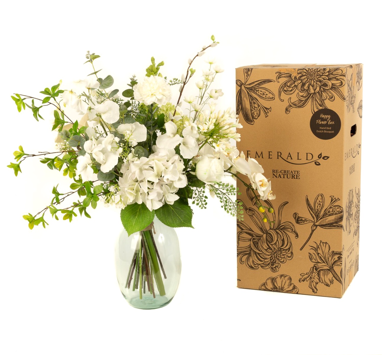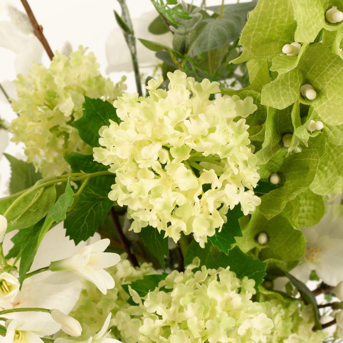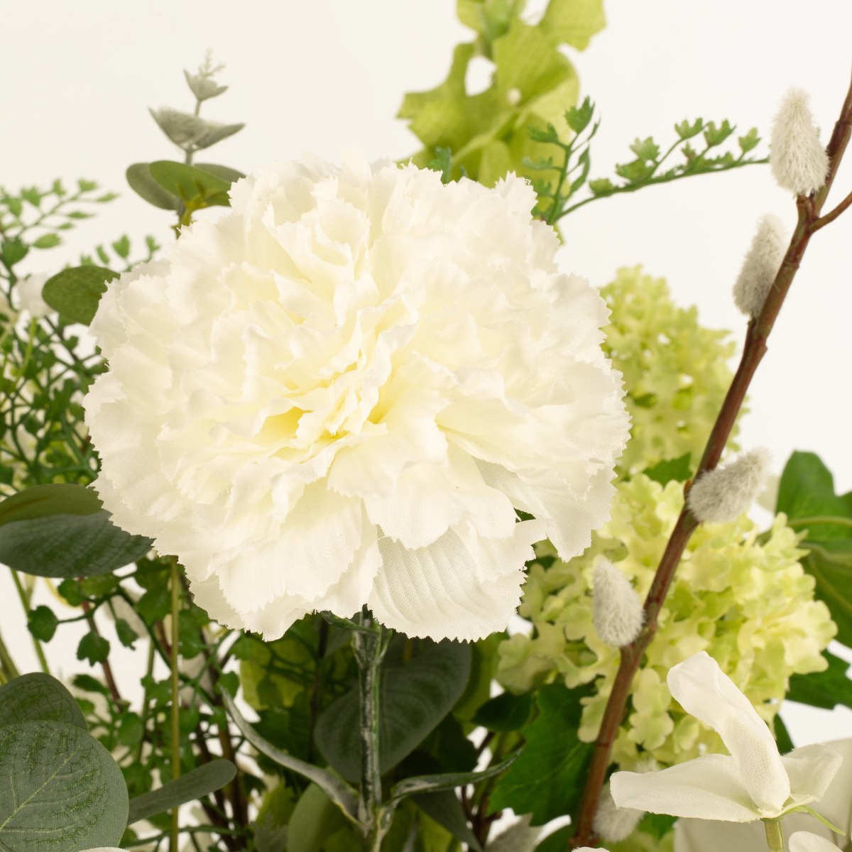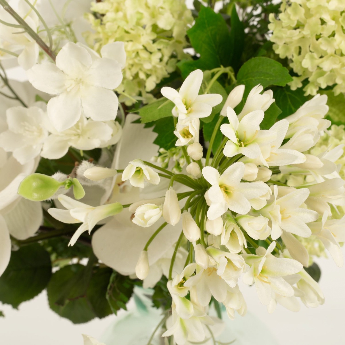 - Artificial bouquet FUYUKO consisting of the following or at least equivalent products: snowball-like agapanthus, snowberry and snowball blossoms, classy calla and rose, lush hydrangea, classic carnation, long-stemmed shellflower and larkspur, elegant orchid, delicate lathyrus and buttercup, fine gypsophila, fluffy willow catkin and fern, eucalyptus and canary creeper as an accessory