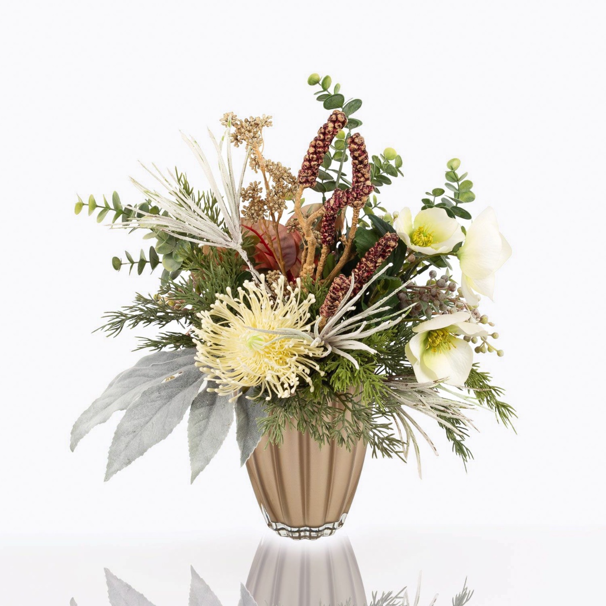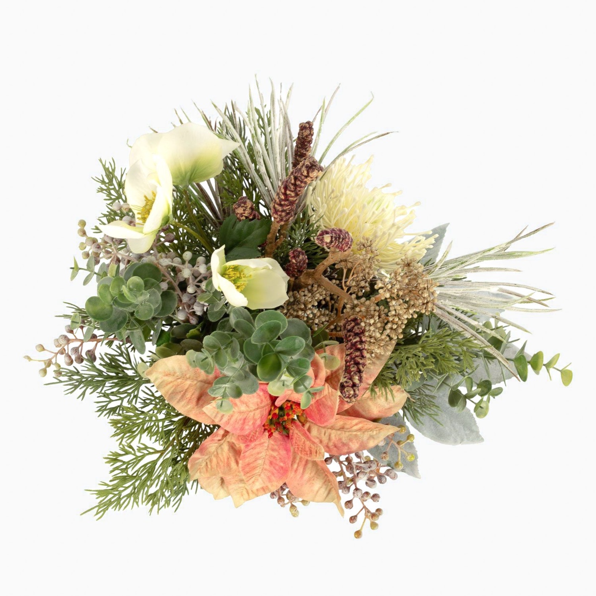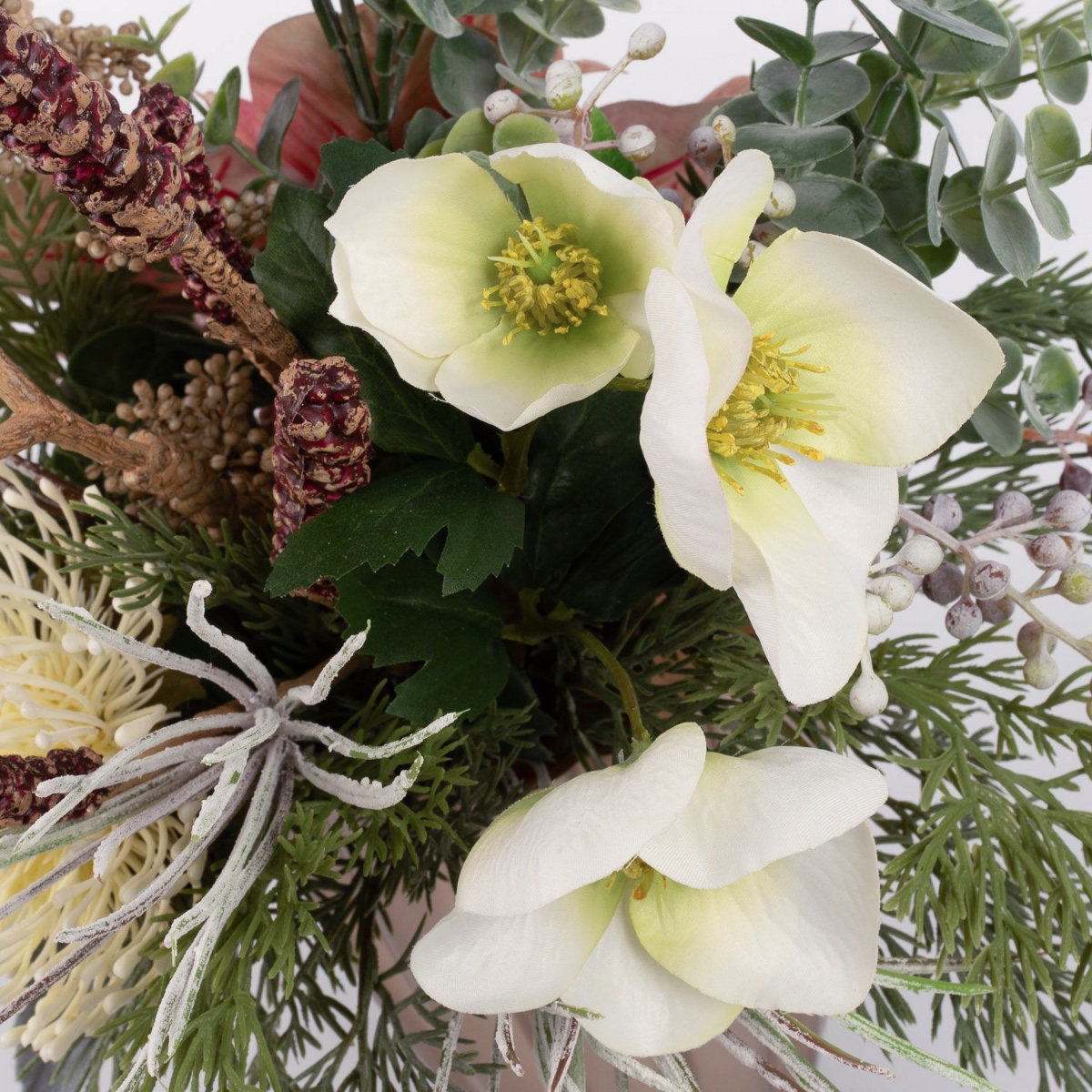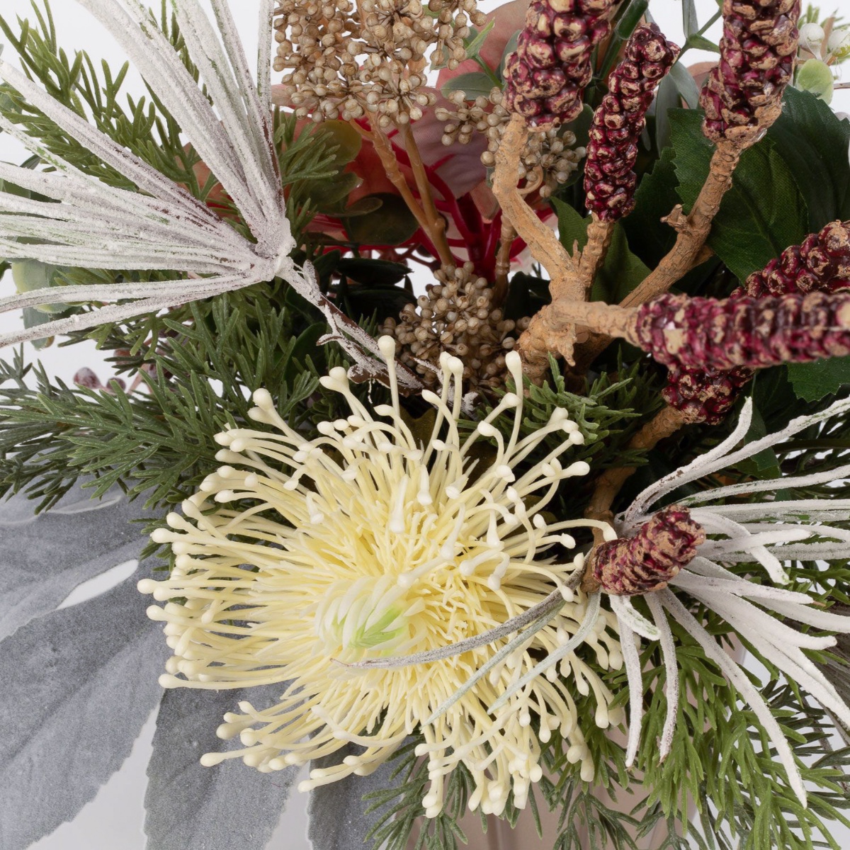 This artificial flower bouquet NOANA is an enchanting winter greeting. Alongside lush christmas star, playful protea and friendly Christmas rose, eucalyptus and cedar stand out from the floral ensemble.