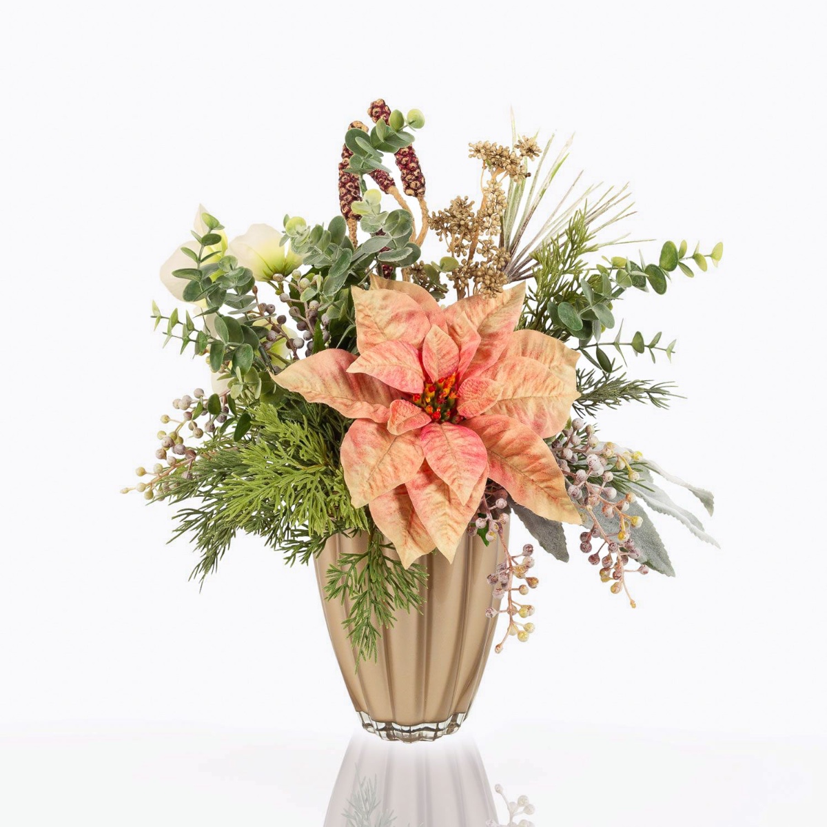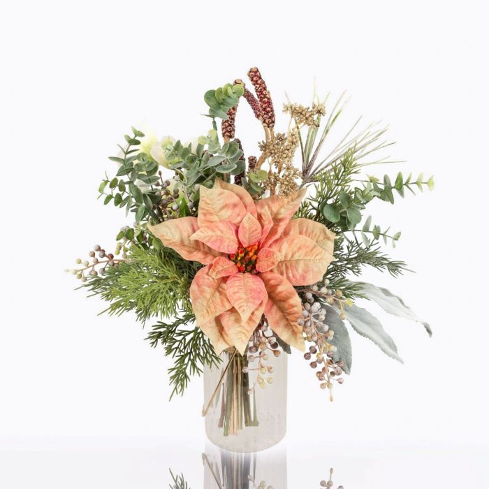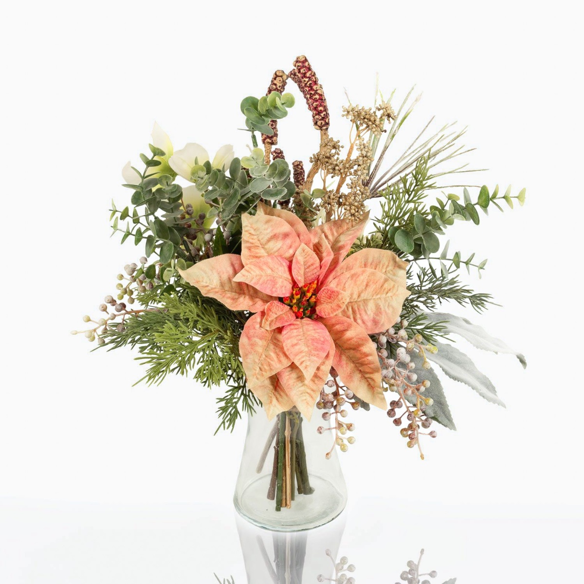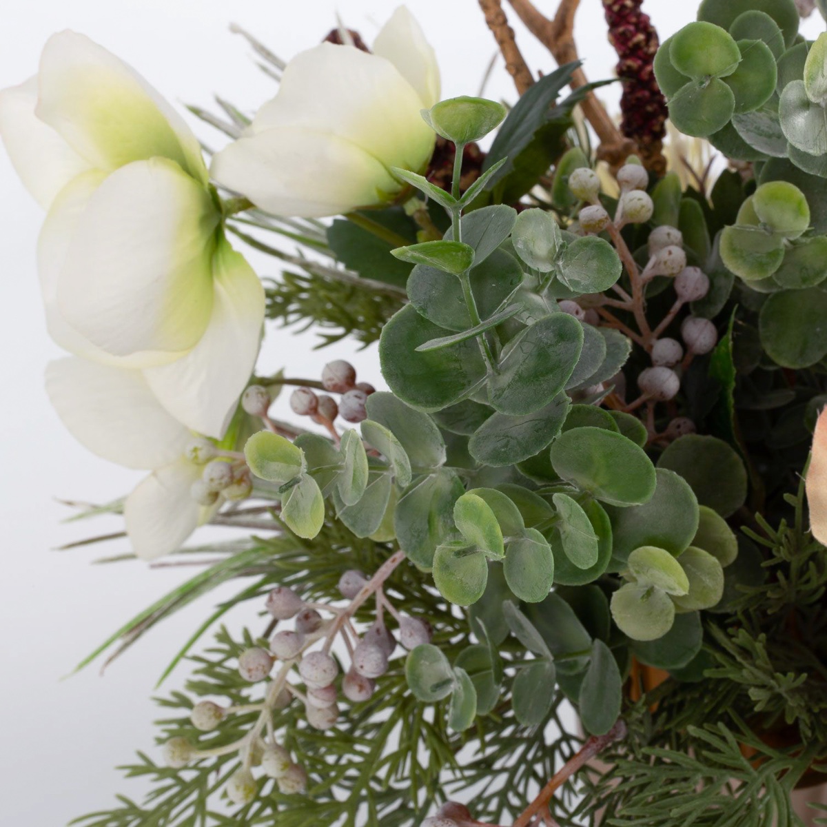 This artificial flower bouquet NOANA is an enchanting winter greeting. Alongside lush christmas star, playful protea and friendly Christmas rose, eucalyptus and cedar stand out from the floral ensemble.
