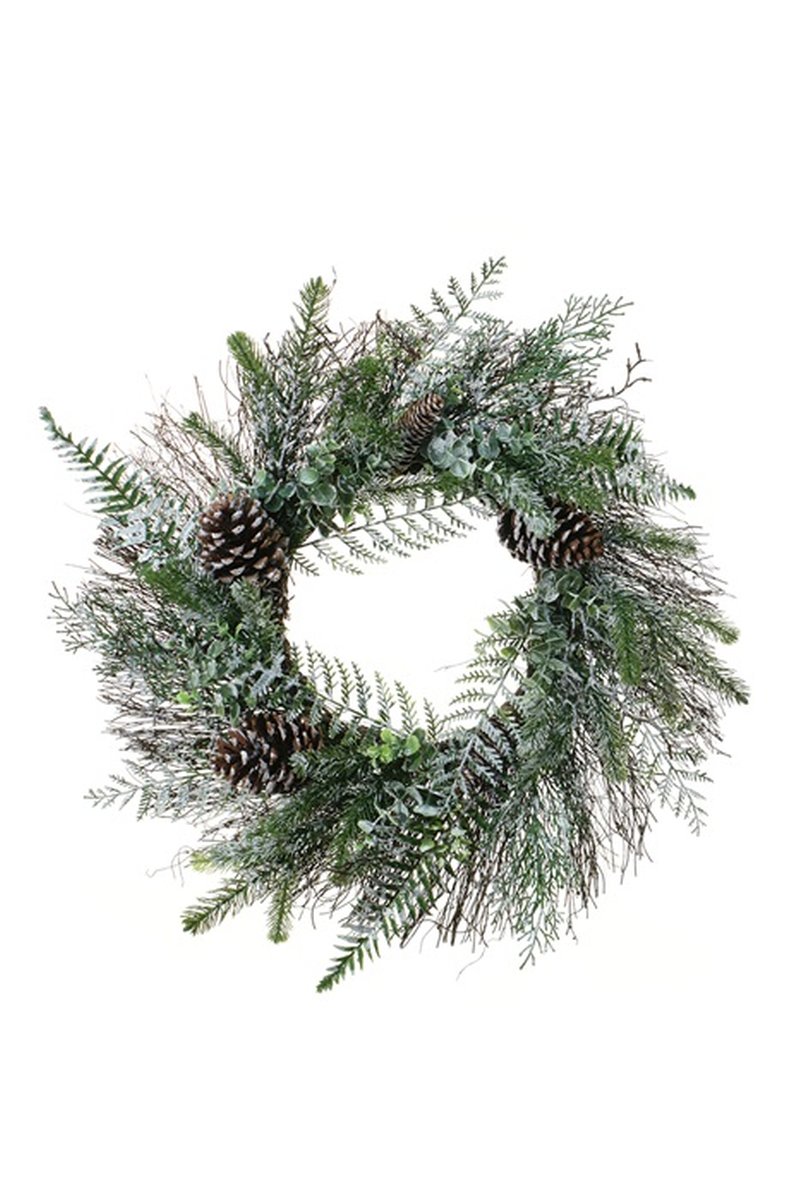- Consisting of pine, eucalyptus, fern, twigs and cones in frosted look