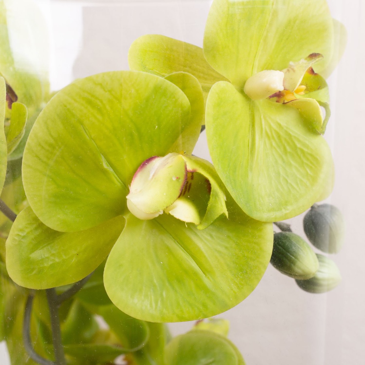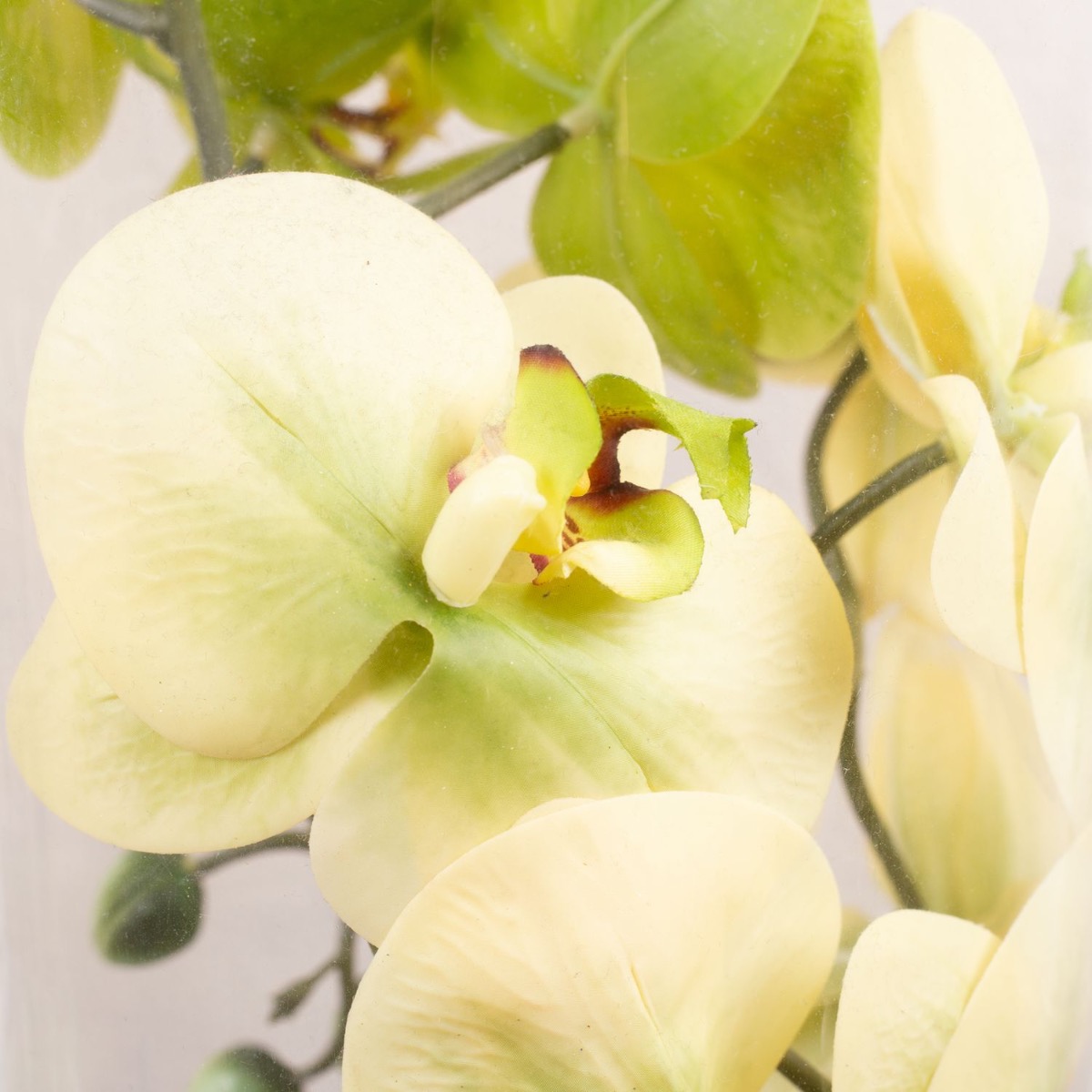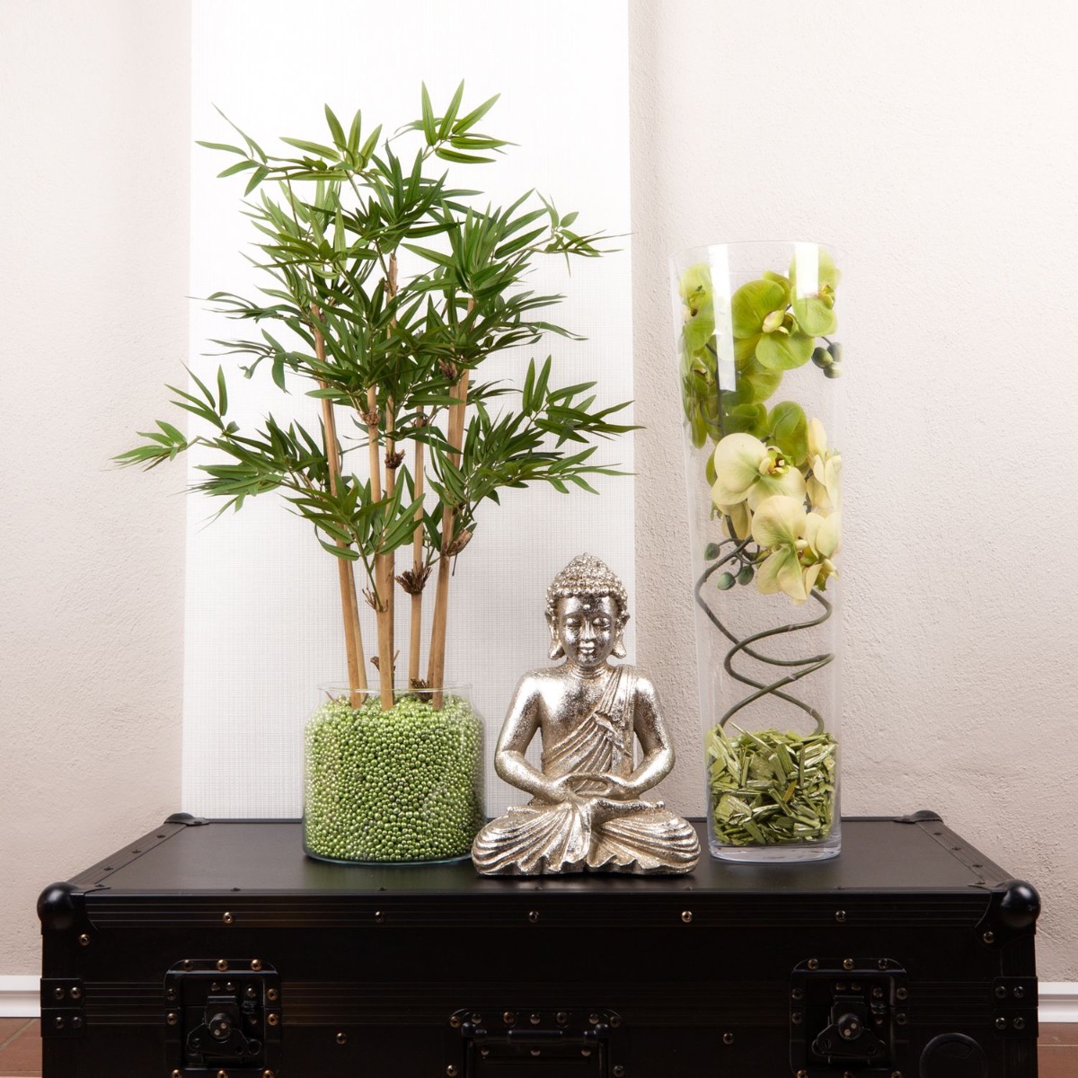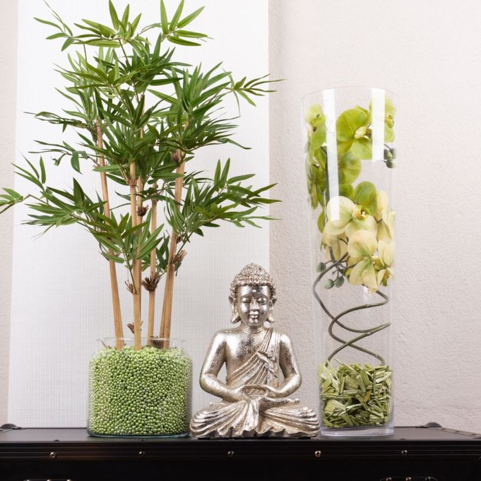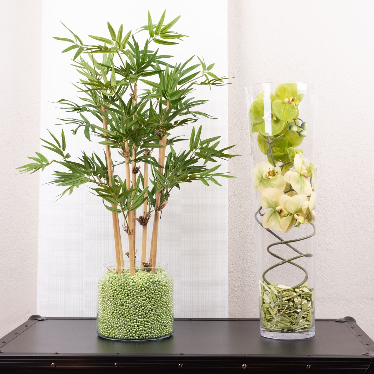 Design tip: Place the bamboo plant in the glass and fill with coloured decorative beads. Bend the orchids into a spiral shape and adjust them to the large vase. The coloured bark mulch covers the ends of the orchid branches.