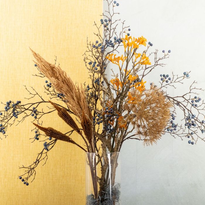Earth colours and sky tones! Autumn can be grey and dirty, but it can also be beautiful and colourful. The colours that nature has to offer are particularly evident in autumn. When the sky is clear, there is no better way to enjoy them. From the delicate beige of pampas grass to the reddish brown of bulbinella, brown has an incredible number of facets. Our kangaroo paw shines in its rich saffron yellow among the autumnal branches, adding a colourful accent to the look. Shop the look!