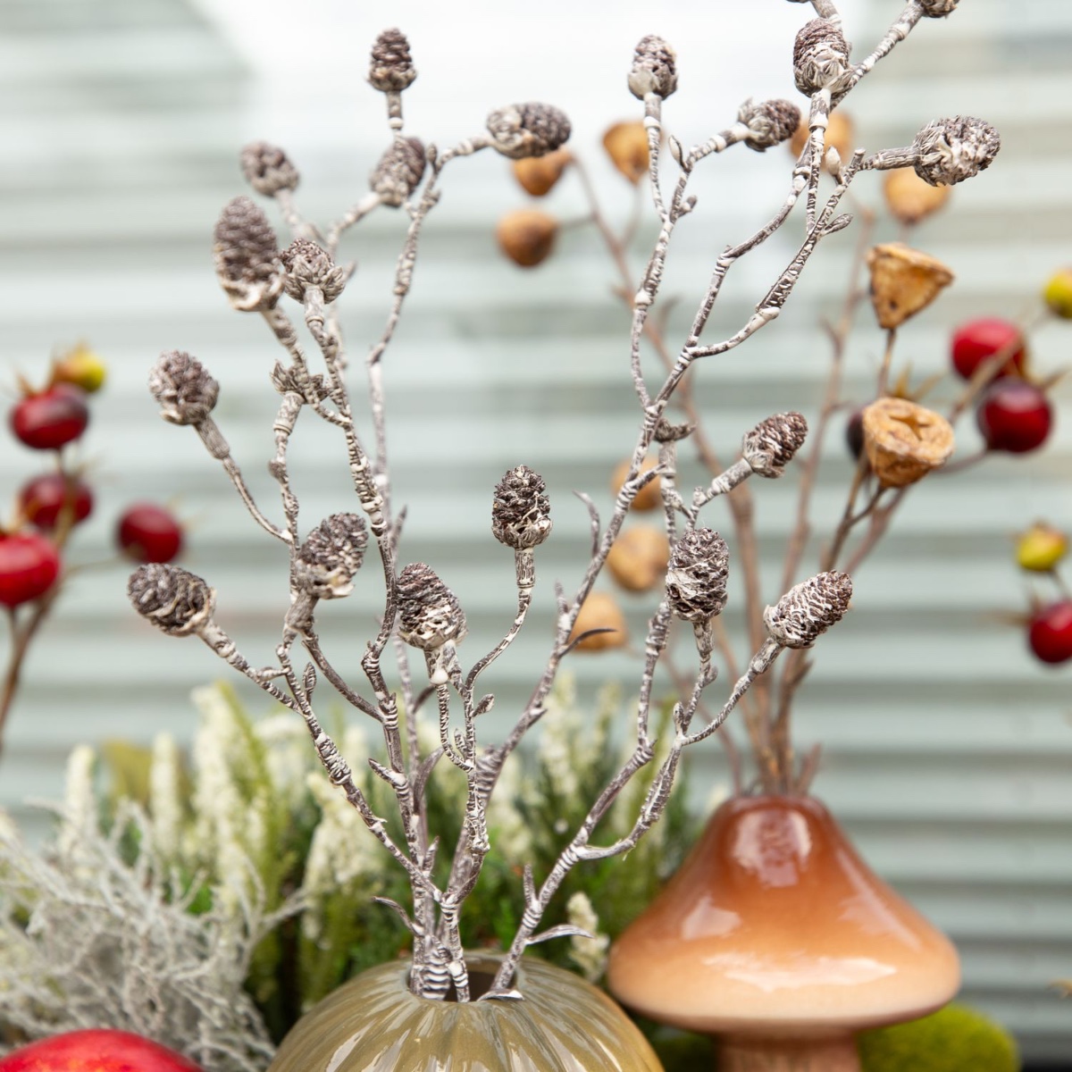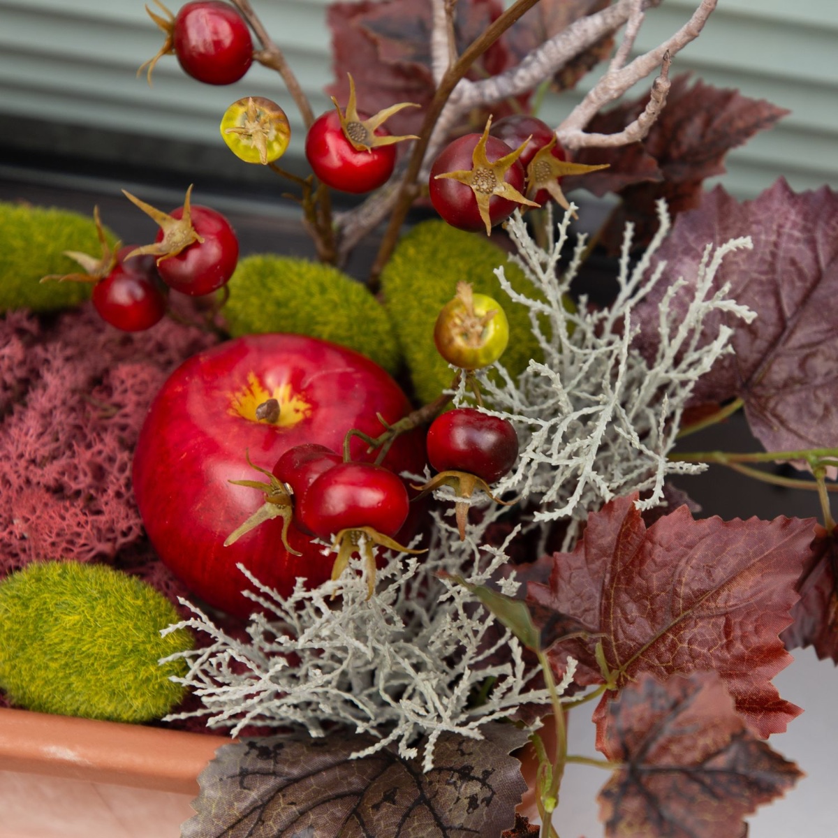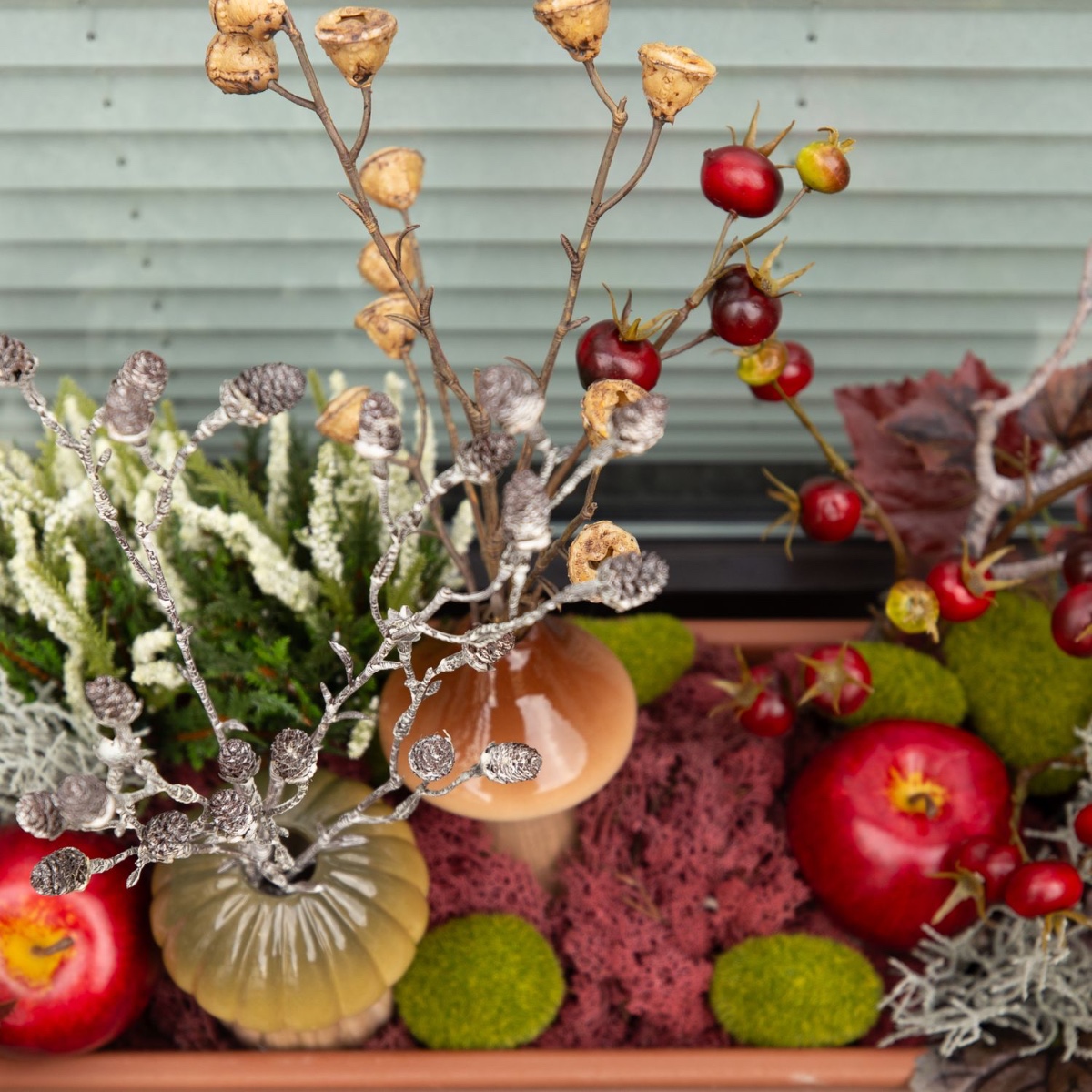 Brown, green and dark red! Our plant boxes are ideal for creating beautiful decorations that match the season. They are large enough to create a whole little world inside. The mushroom-shaped ceramic vases give our look a real autumnal feel and can be filled with pretty twigs. Artificial apples and reddish vine tendrils are reminiscent of the harvest season. The red natural moss covers the bottom and adds a splash of colour to the autumnal scene. Shop the look!