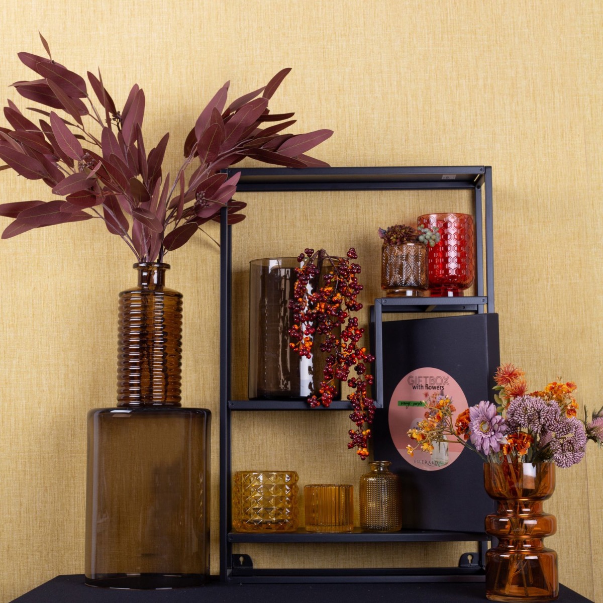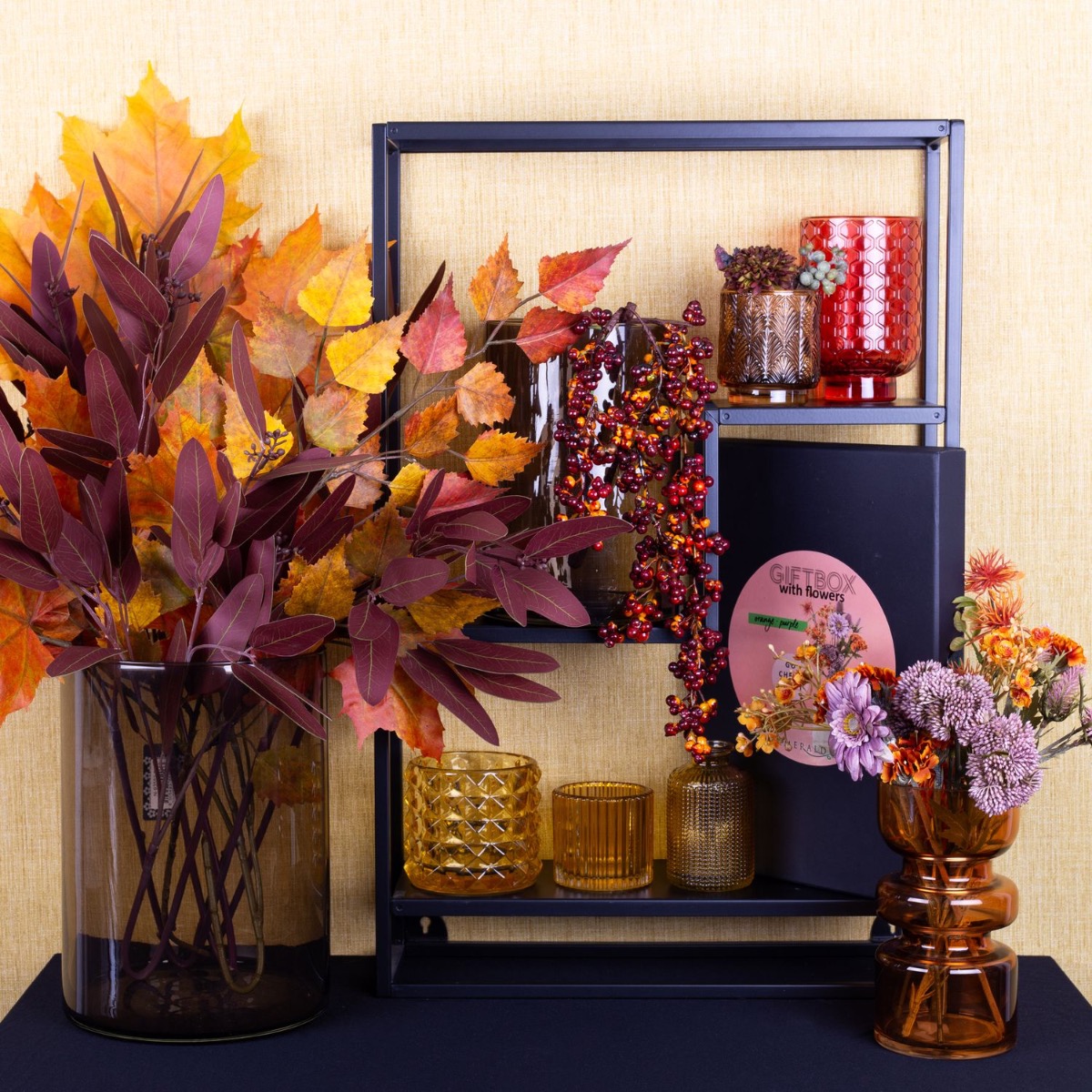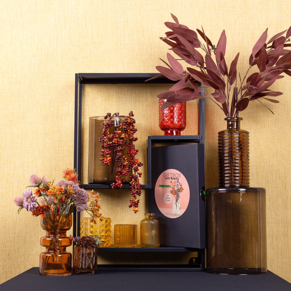 Red, brown and yellow! The end of summer has arrived and the last flowers are blooming. Time for a fresh decoration! A cute little DIY bouquet from Emerald adorns the brown and orange vase. In our large selection of colourful bottles and glasses, we were able to easily combine the beautiful autumn tones. Bright yellow, warm orange, vibrant red and a rich brown. These are the colours of autumn. Shop the look!