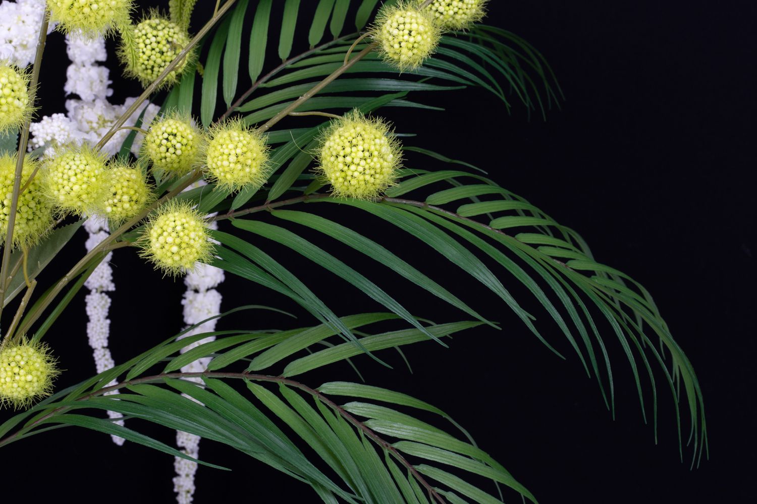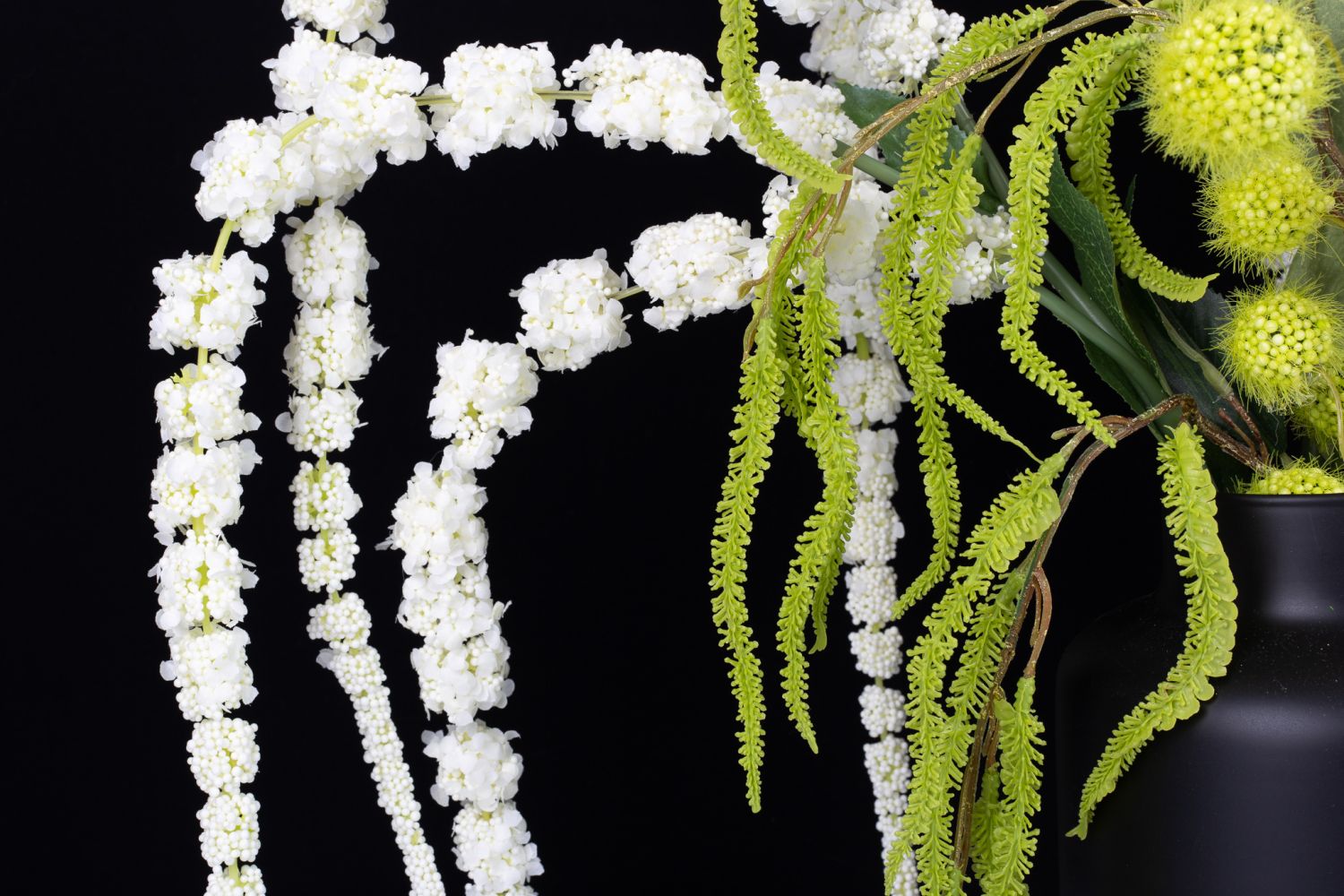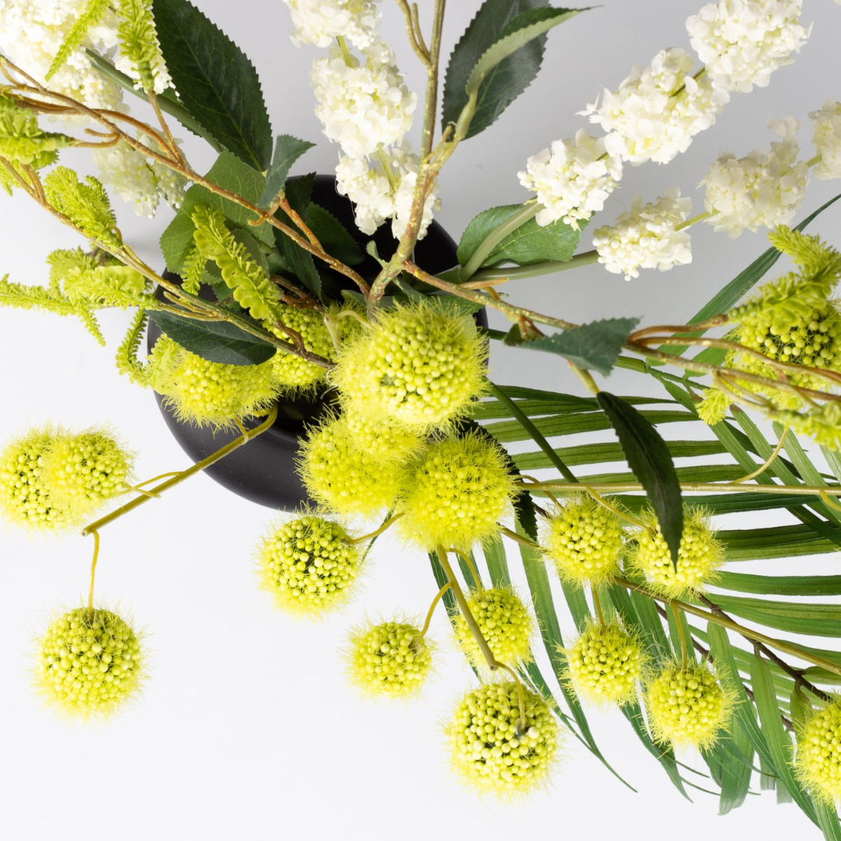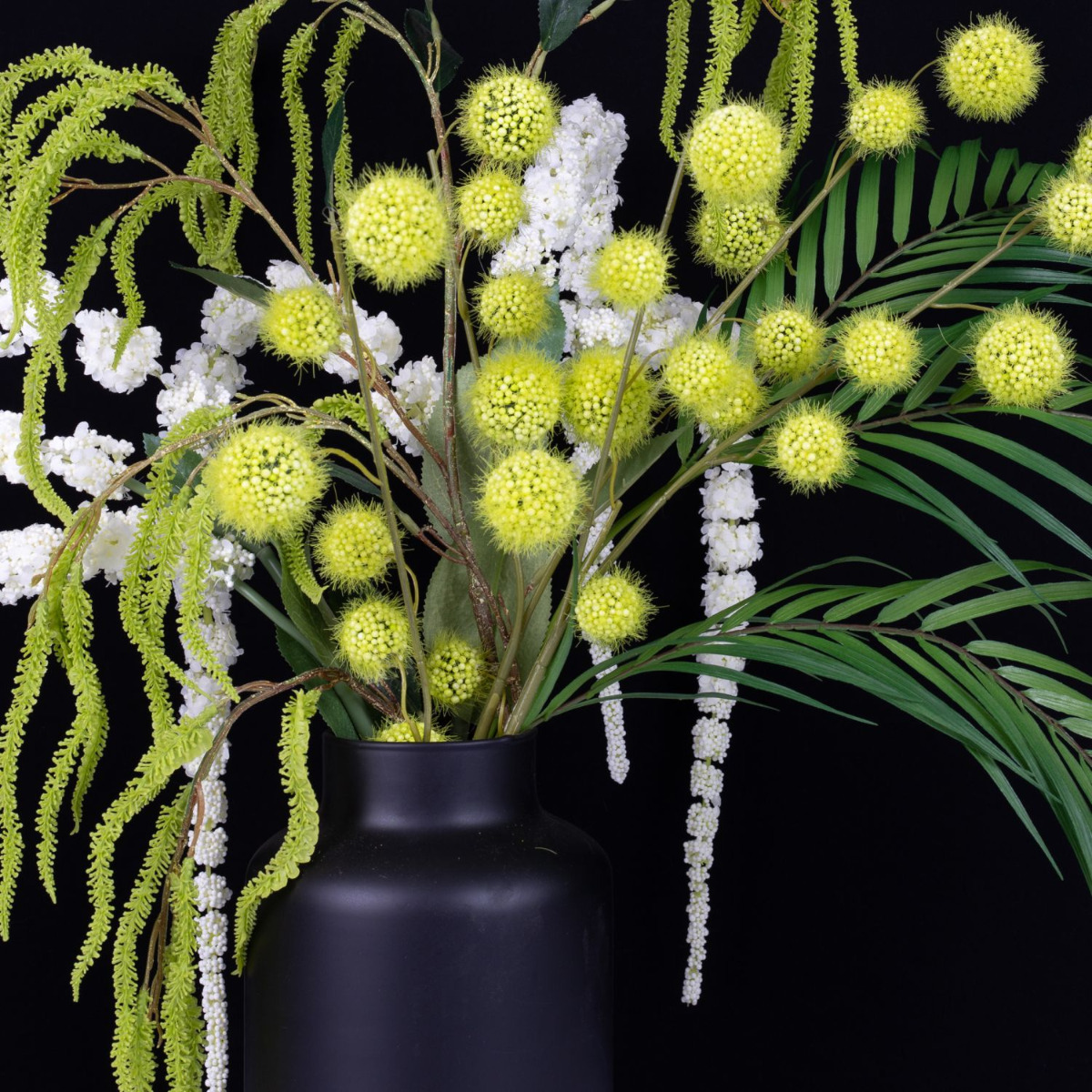 Exotic flower explosion! Like the peacock's fan-like tail feathers, our flower arrangement is also an eye-catcher. The bright colours of the flowers and their arrangement are reminiscent of Brazilian carnival or impressive fireworks. The glass vase in a simple, matt black will draw your eye to the bouquet. White and green amaranth and the bamboo palm frond surround the bouquet. The spherical blossoms of the balloonplant are arranged in the middle, contrasting with the panicles. Do you also want to give your living space a new shine? Shop the Look!