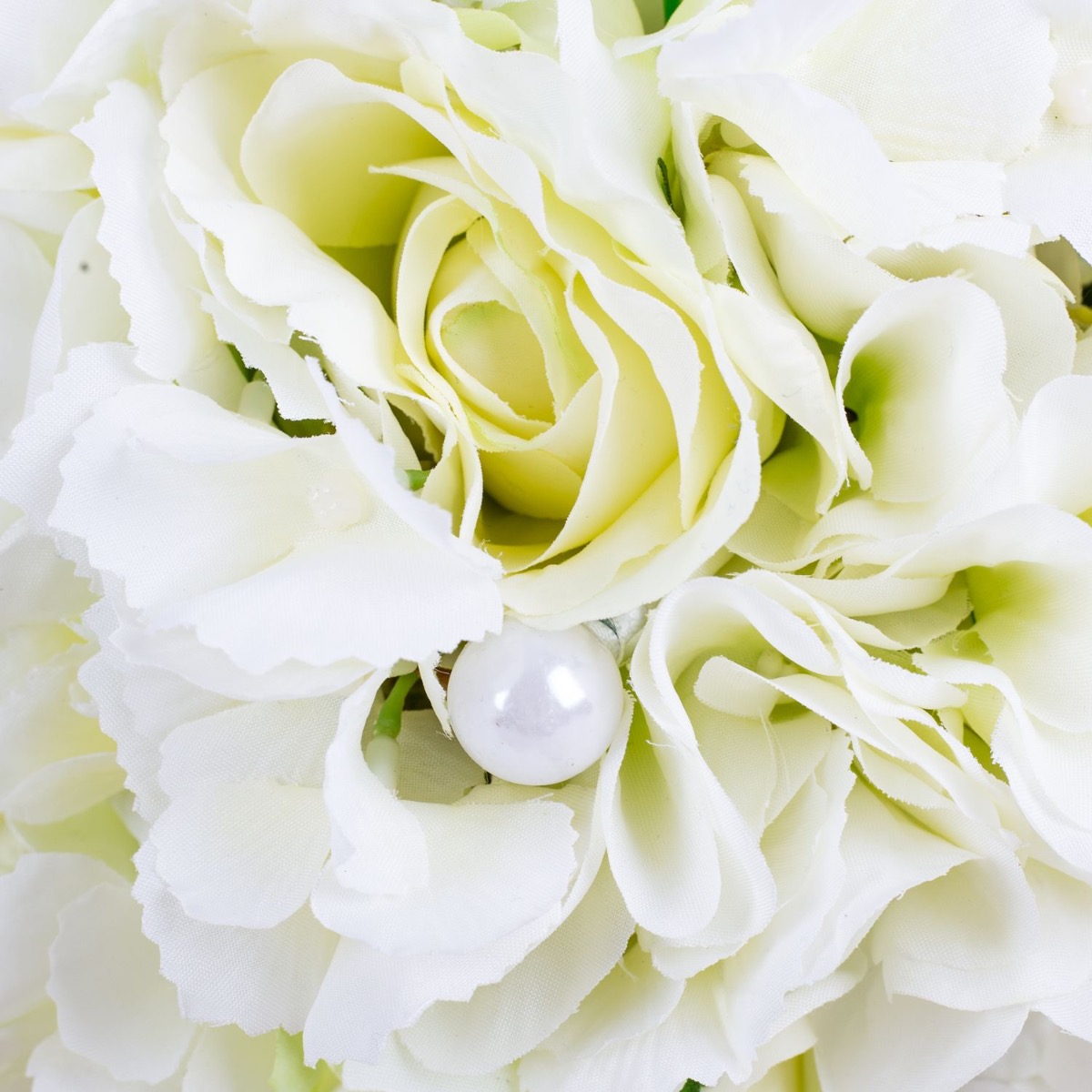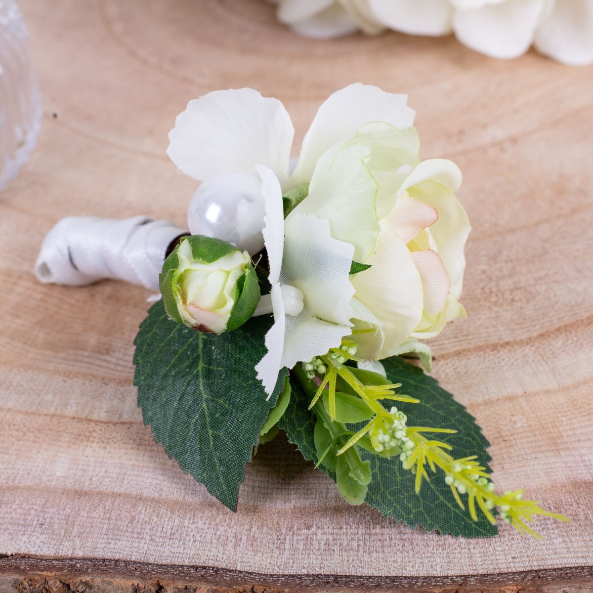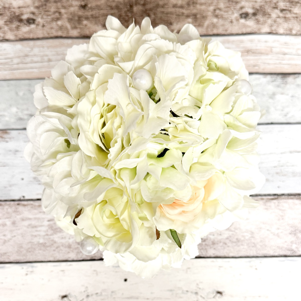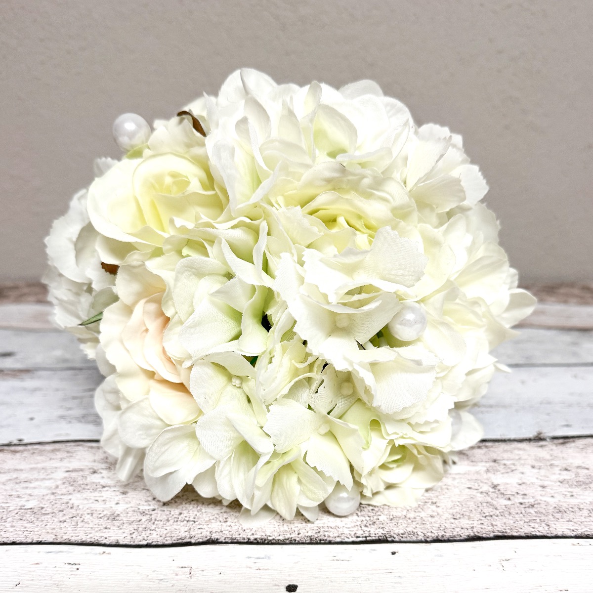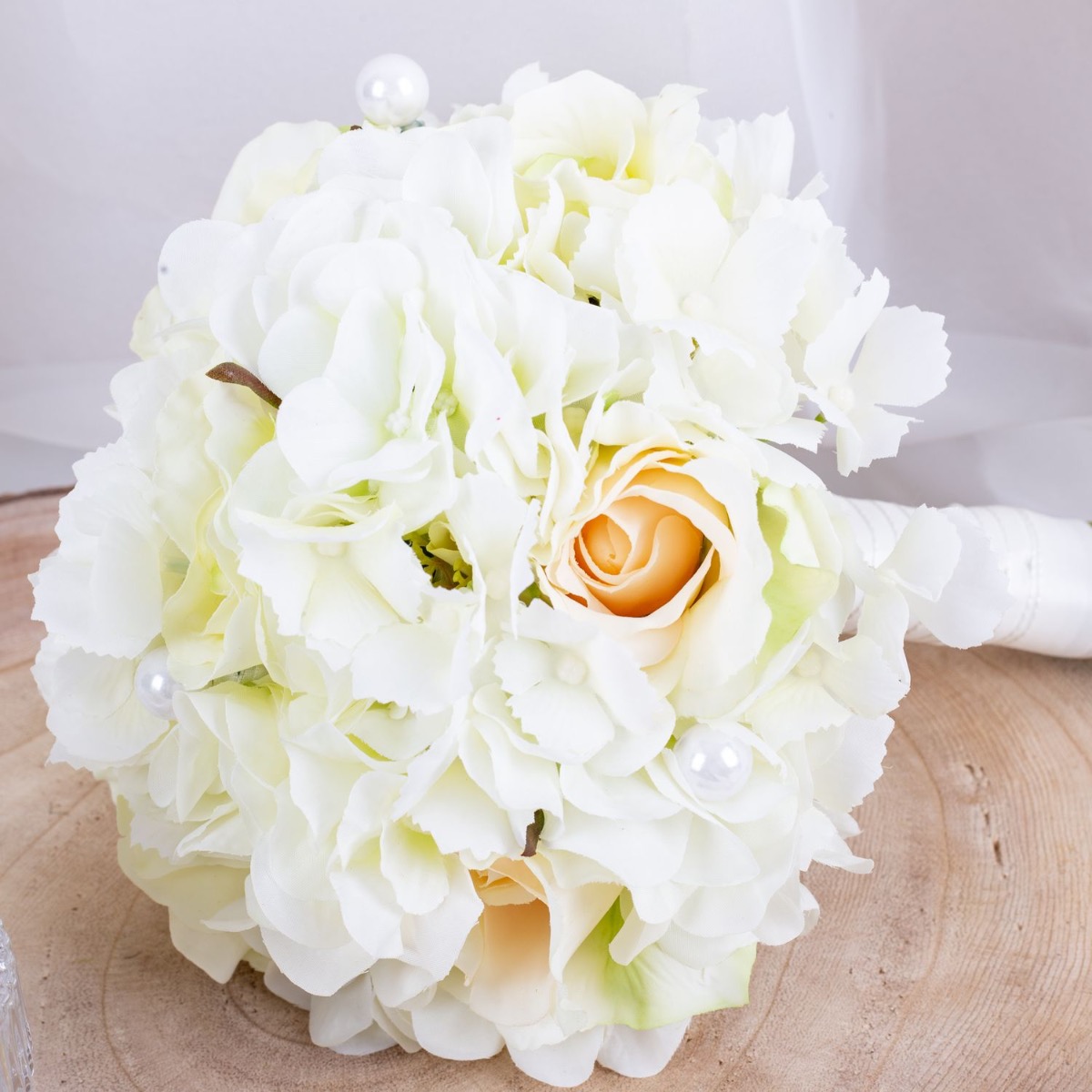 Glamorous passion! The delicate roses and cream-coloured hydrangeas blend harmoniously together and lend the bouquet a romantic touch. The pearls incorporated into the bouquet add a subtle but luxurious touch. They shine softly in the light and give the bouquet a hint of glamour and sophistication. Matching the bridal bouquet, the groom wears a buttonhole consisting of a cream-coloured rose, delicate hydrangea blossoms and a pearl. These coordinating details subtly unite the bride and groom and complete the elegant look of the wedding party. Overall, this bridal bouquet exudes an aura of romance and elegance that touches the heart and enchants the eyes. A truly enchanting companion for the bride on her way to the altar. Do you also want an artificial wedding bouquet? Shop the Look!