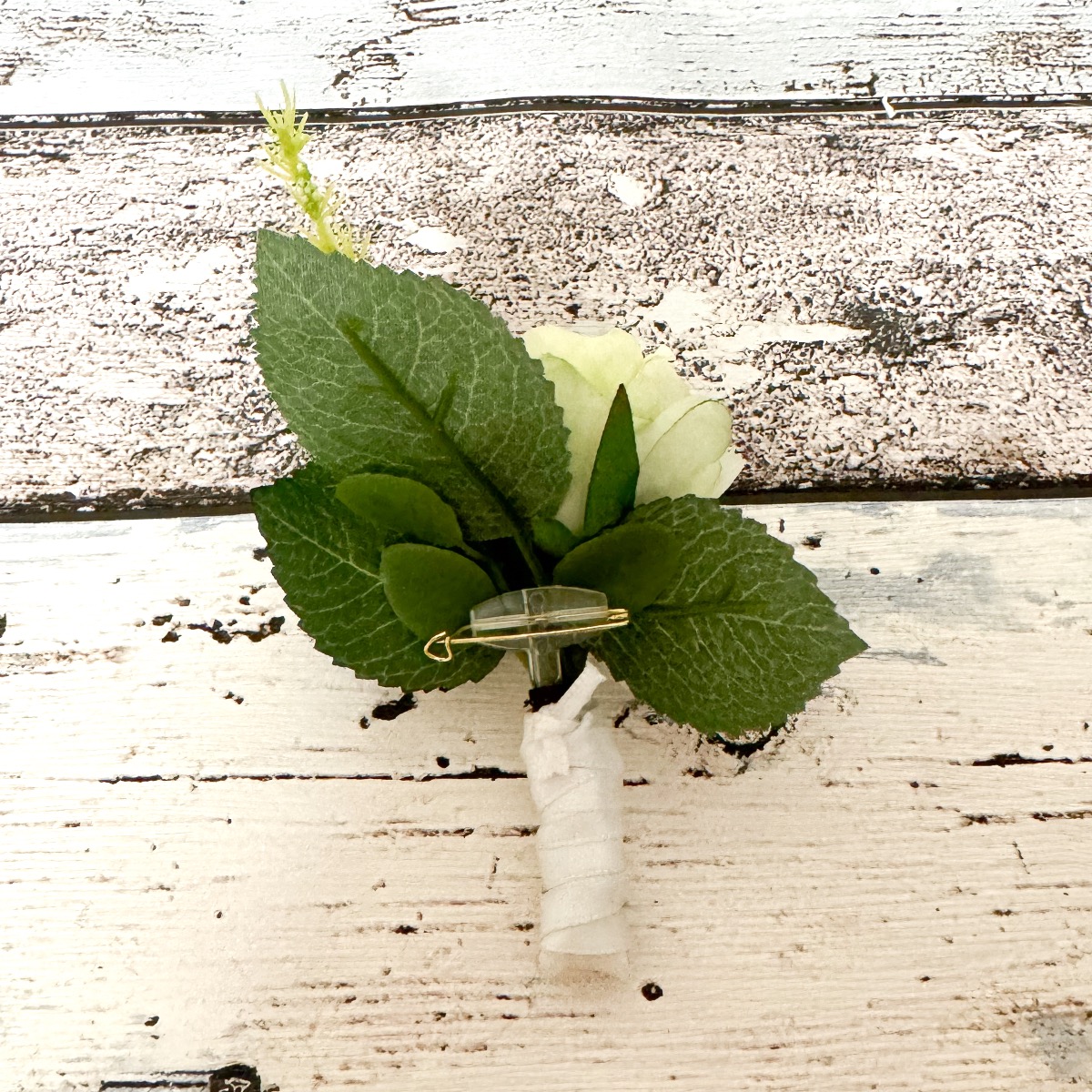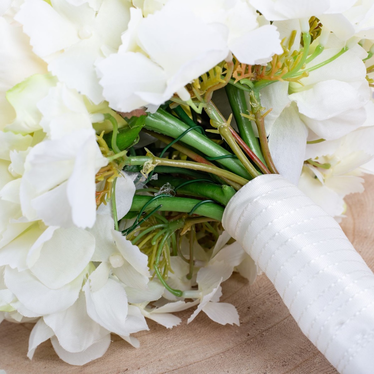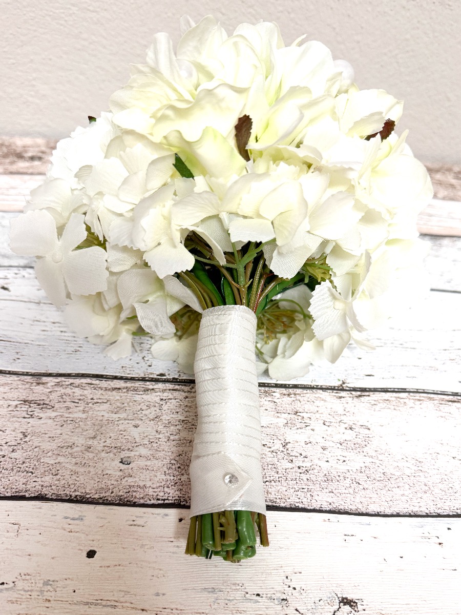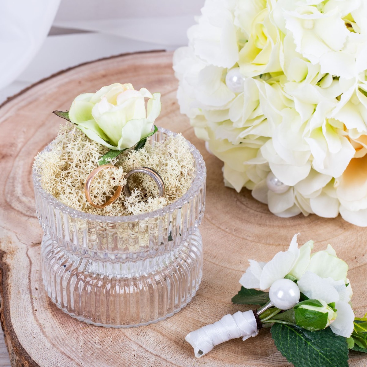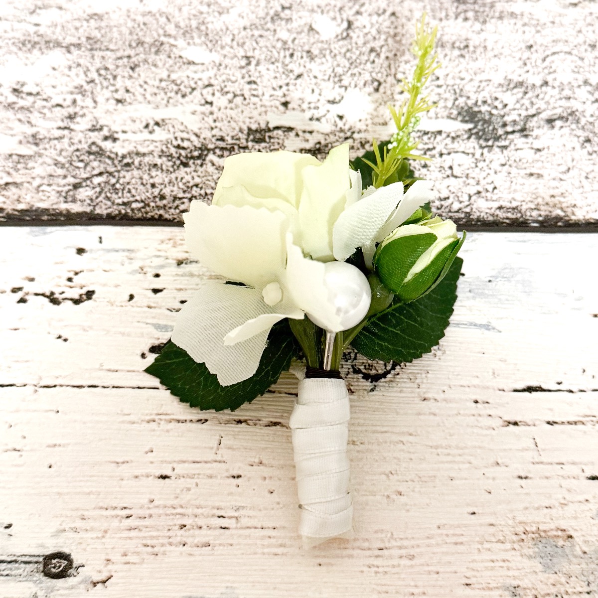 Glamorous passion! The delicate roses and cream-coloured hydrangeas blend harmoniously together and lend the bouquet a romantic touch. The pearls incorporated into the bouquet add a subtle but luxurious touch. They shine softly in the light and give the bouquet a hint of glamour and sophistication. Matching the bridal bouquet, the groom wears a buttonhole consisting of a cream-coloured rose, delicate hydrangea blossoms and a pearl. These coordinating details subtly unite the bride and groom and complete the elegant look of the wedding party. Overall, this bridal bouquet exudes an aura of romance and elegance that touches the heart and enchants the eyes. A truly enchanting companion for the bride on her way to the altar. Do you also want an artificial wedding bouquet? Shop the Look!