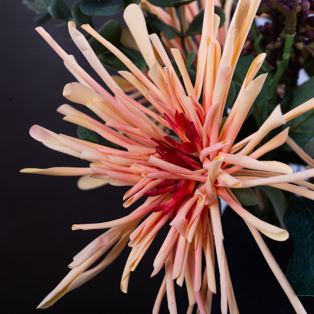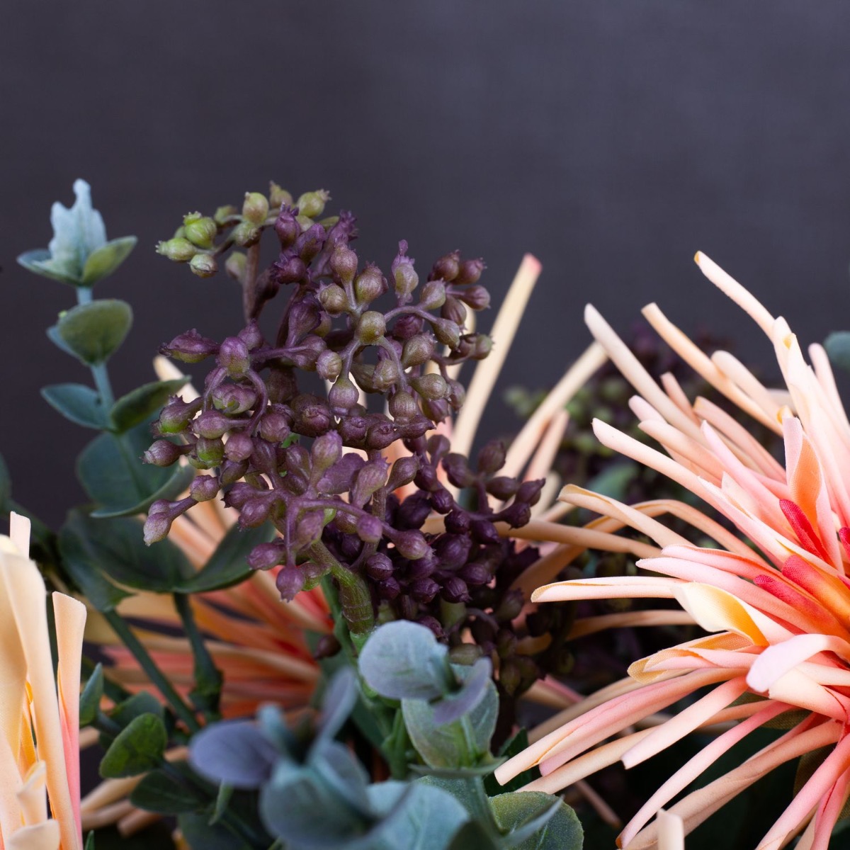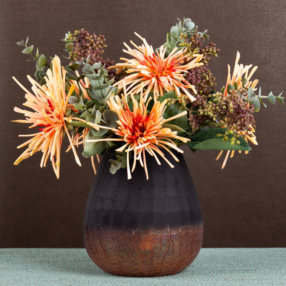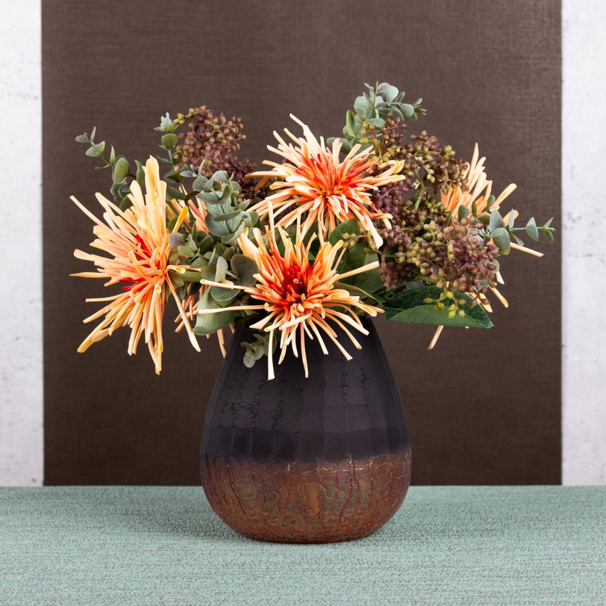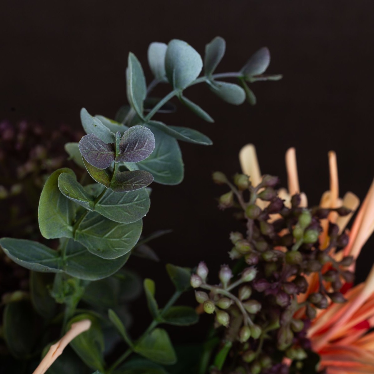 Orange and brown! These are the striking colours in this look and show how well they go together. The dark brown of the vase takes a back seat and lets the colours of the chrysanthemums shine. The flowers are perfectly complemented by laurustinus and eucalyptus. This bouquet will brighten up your home. Shop the look!