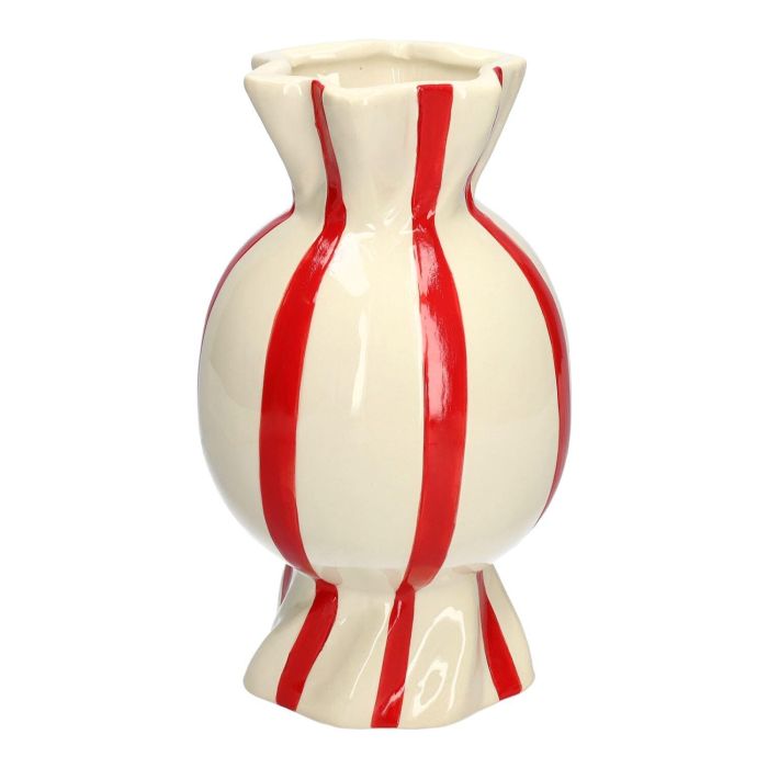 Bulbous single stem vase in the shape of a sweet AMIEL made of ceramic, with vertical stripes, red-white, 10"/24,7cm, Ø5.5"/14cm