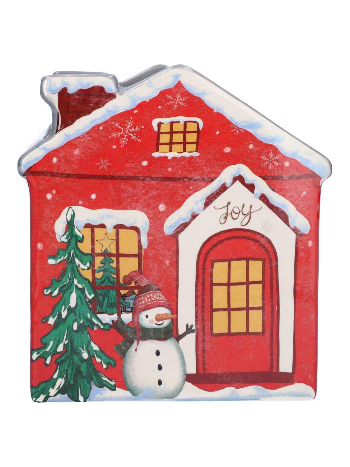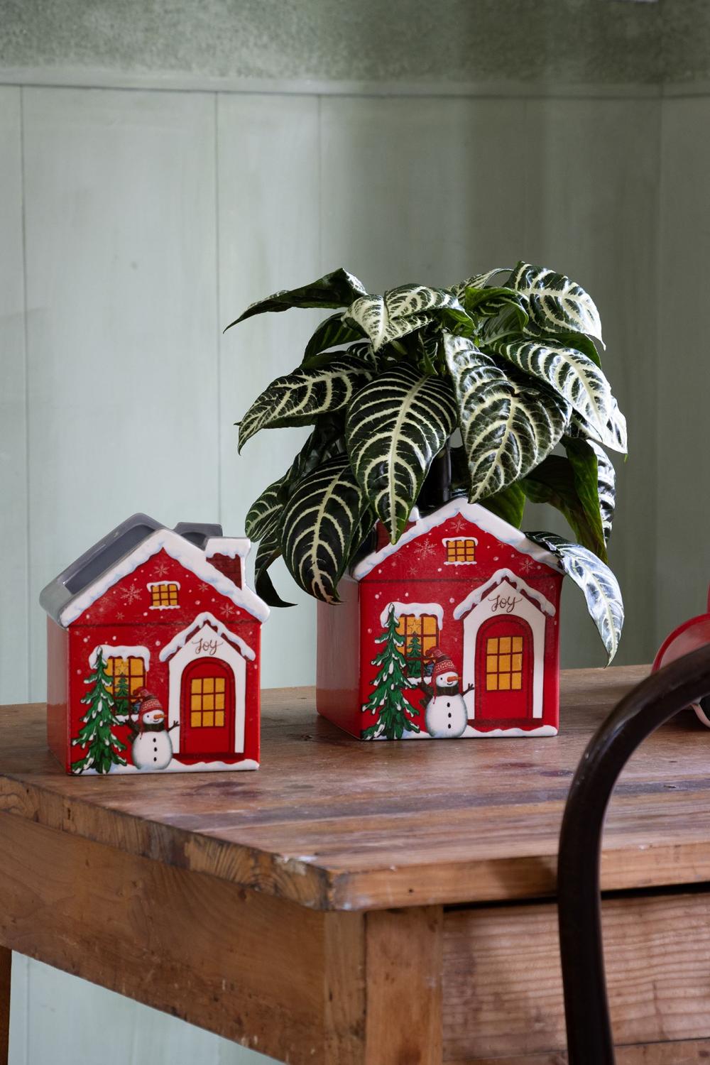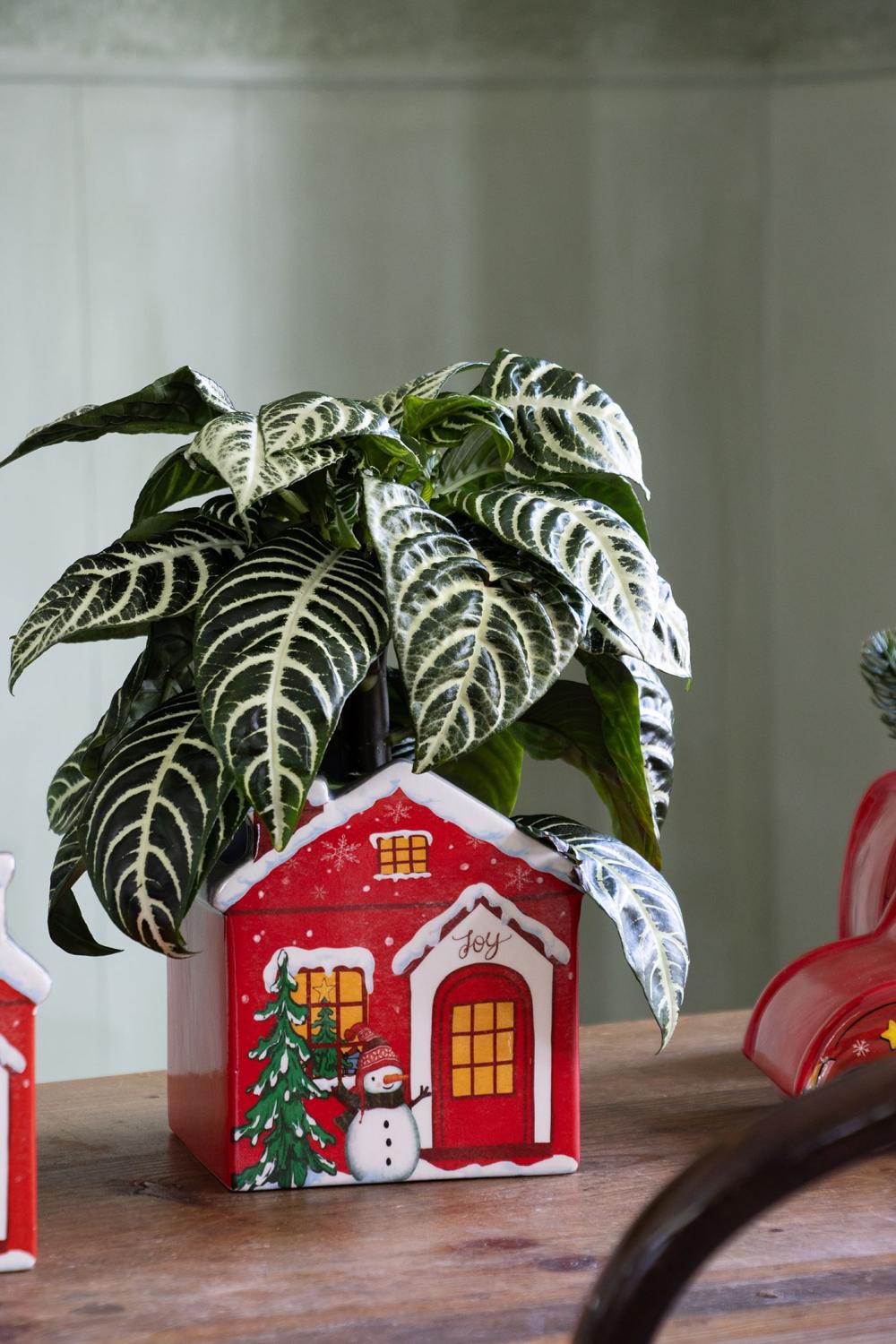 Ceramic plant pot in house shape ARMAS, christmassy, red-white, 13x13x15cm