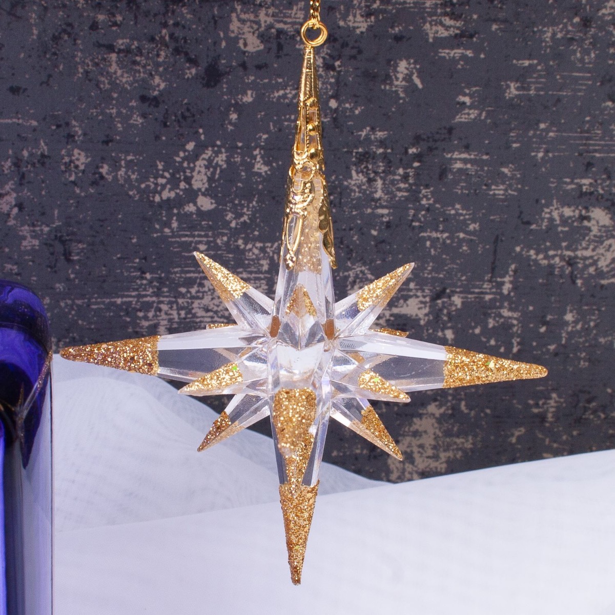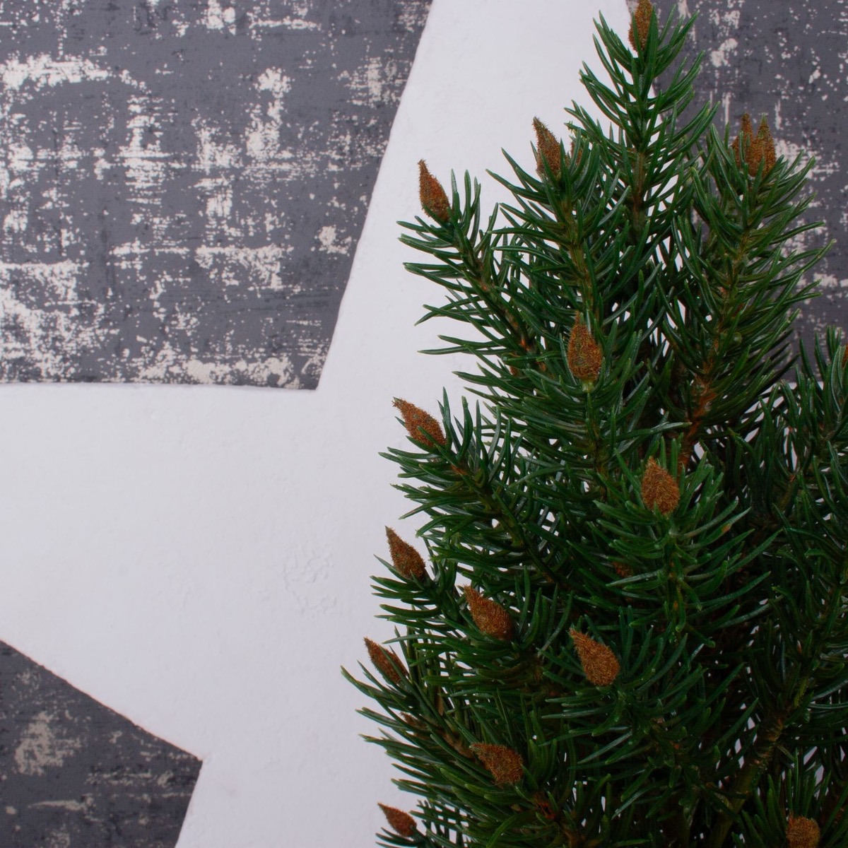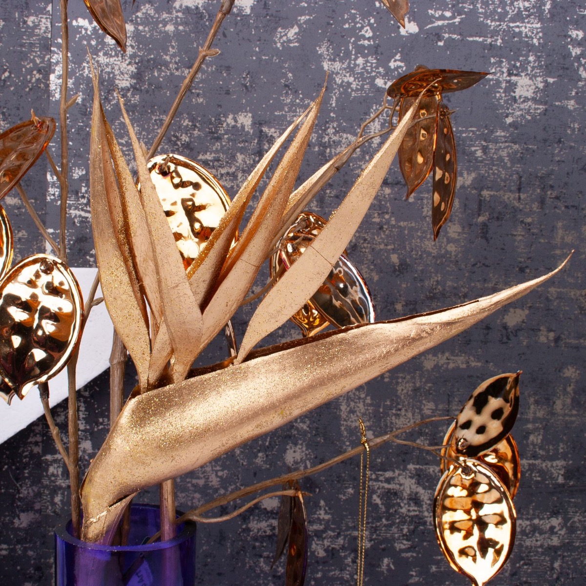 Violet and gold! A colour combination with royal appeal. The violet vase from the ORESTINO series has been decorated with golden artificial plants in this look. Even tropical plants, such as the golden strelitzia, look really Christmassy here. Our acrylic baubles on a golden cord have been wrapped around the vase like a scarf. A delicate Christmas tree placed in front of a polystyrene star rounds off the Christmassy look perfectly. Shop the look!