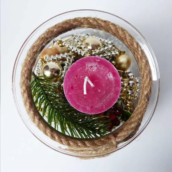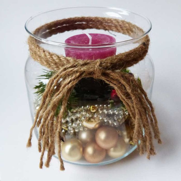 Design tip: Firstly, distribute the decoration in the glass, then place the candle holder and candle on top. If necessary, shorten the fir branch a little or cut it into individual twigs.