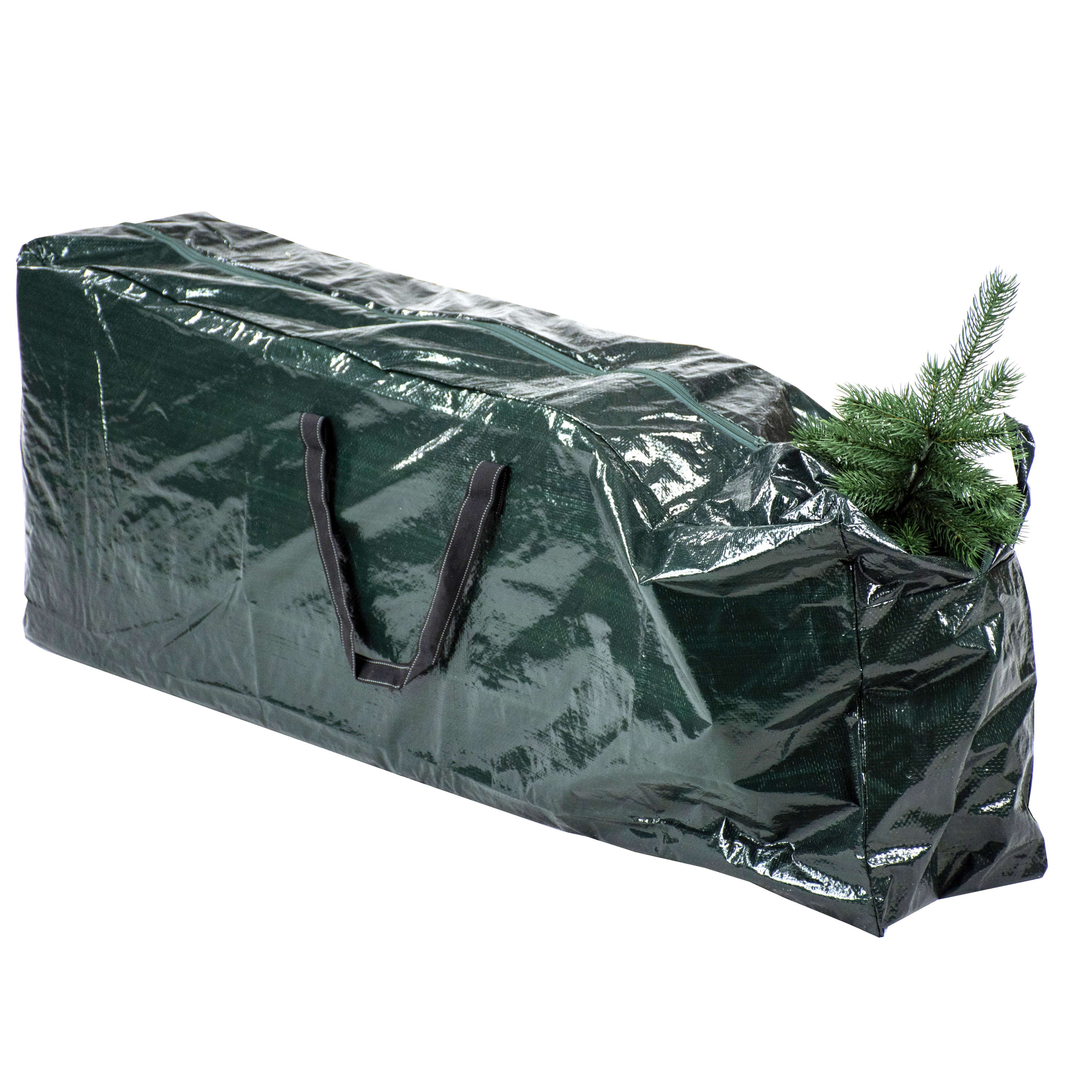 The fibre bag (100% polypropylene) with handles in colour green is provided with an integrated zip for stowing trees up to a maximum height of 120 cm.