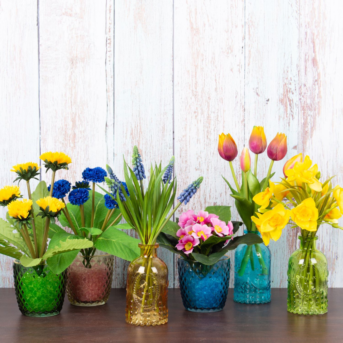 Coloured and cheerful! This is how spring must look. Colourful bottles and glasses combined with the typical early bloomers quickly chase away the winter blues. Daffodils, tulips, primroses, hyacinths, bellis and even the dandelion, which is actually considered a weed, go well with this spring decoration. How beautifully spring shines, you too can bring the bright colours of spring into your home! Shop the Look!