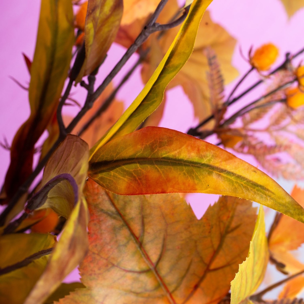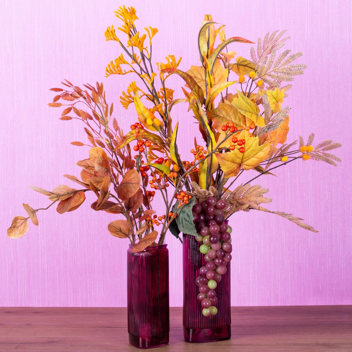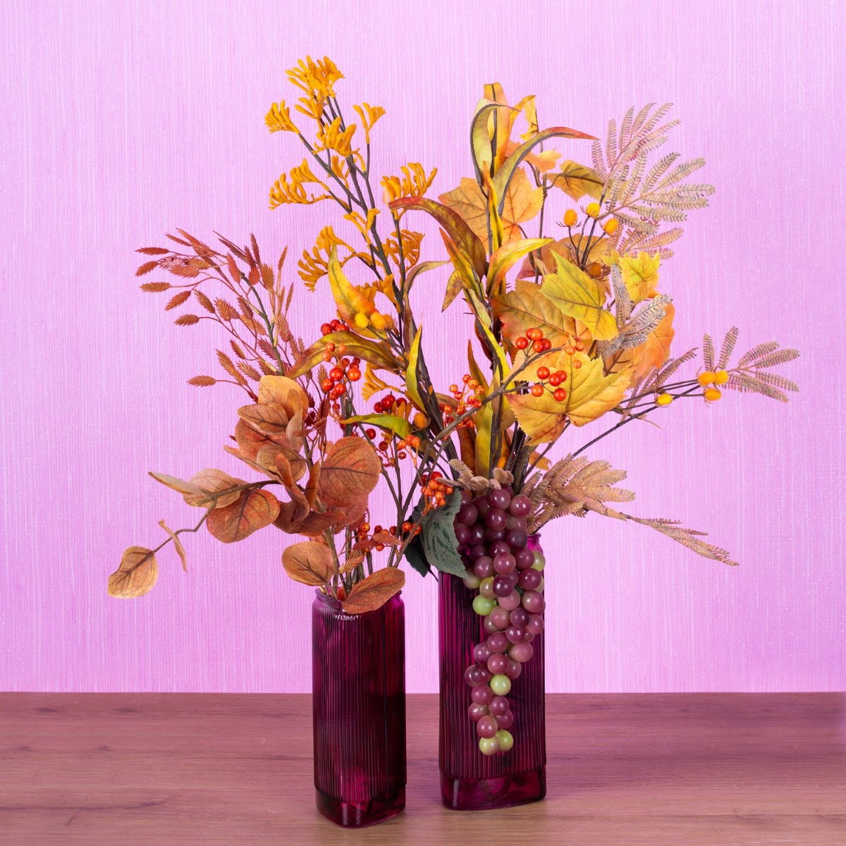 Yellow, orange and fuchsia! Our large selection of autumn leaves always makes us want to create a new look. This time, we have combined fuchsia vases from the NEROLANIK series with a fuchsia background. This makes the autumnal branches look as if they are set against a wonderful evening sky after a sunny autumn day. The yellow maple leaves, bright orange berries and eucalyptus leaves dance in the vase and create a cheerful atmosphere. Brighten up your home too. Shop the look!