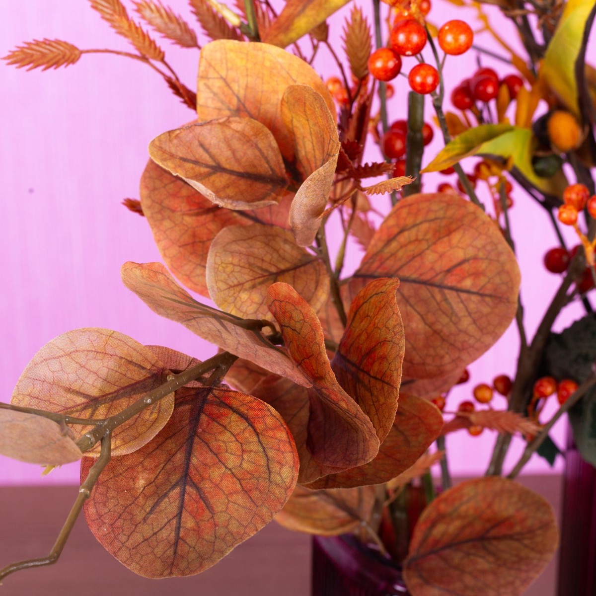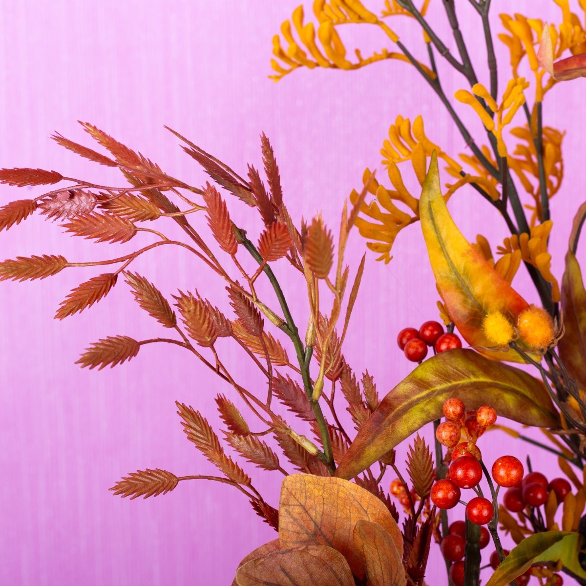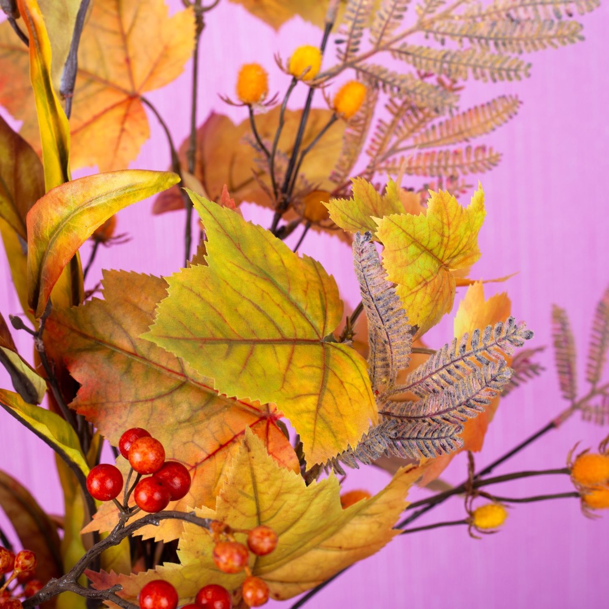 Yellow, orange and fuchsia! Our large selection of autumn leaves always makes us want to create a new look. This time, we have combined fuchsia vases from the NEROLANIK series with a fuchsia background. This makes the autumnal branches look as if they are set against a wonderful evening sky after a sunny autumn day. The yellow maple leaves, bright orange berries and eucalyptus leaves dance in the vase and create a cheerful atmosphere. Brighten up your home too. Shop the look!