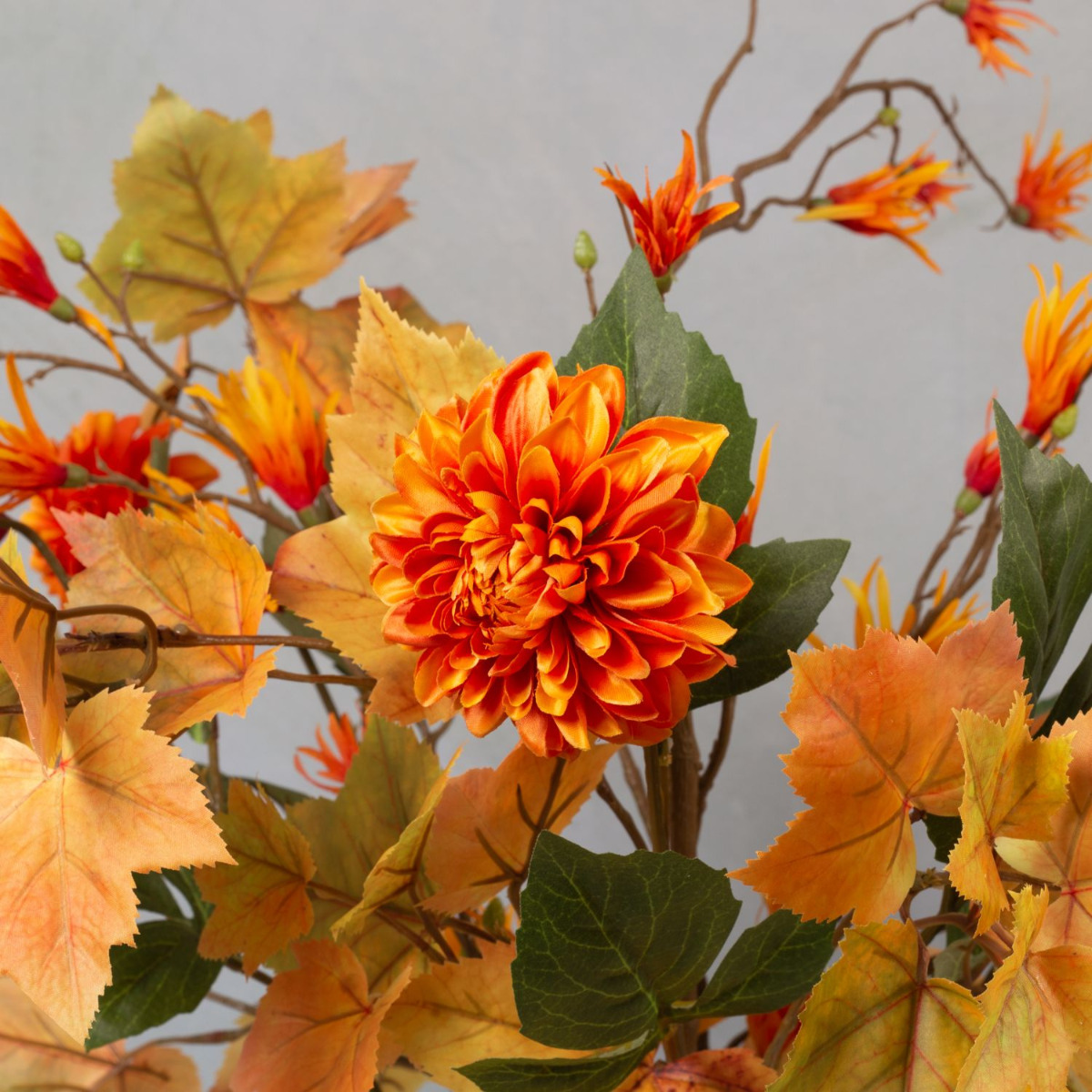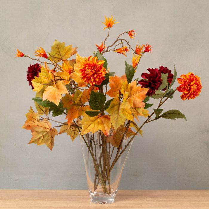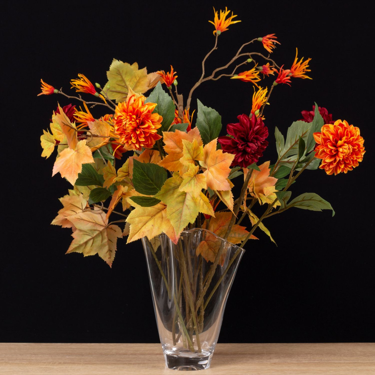 Nature's colour explosion!You can't make autumn more classic. Yellow-orange autumn leaves dance around the bright dahlias in red and orange. This bouquet looks as if it had been picked during an autumn walk. Except that this one will last longer. The colourful maple leaves simply go with any autumnal arrangement and brighten up any room. Shop the look!