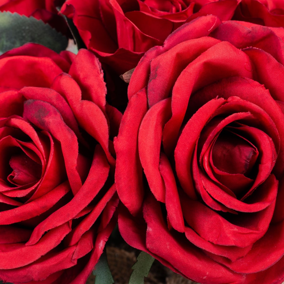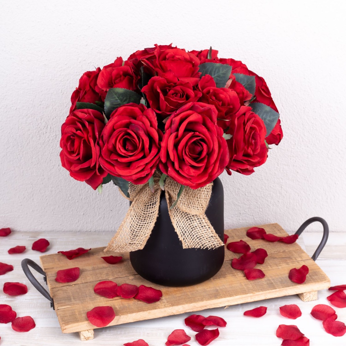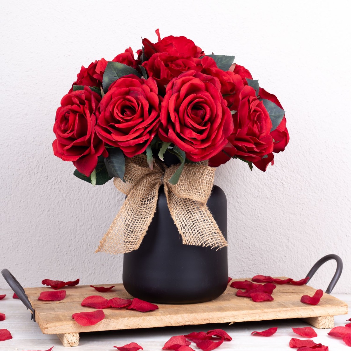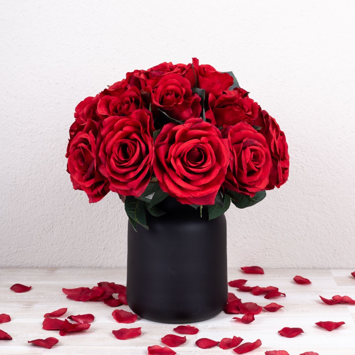 Red and black! A classic colour scheme that looks modern and romantic thanks to the jute bow. The high-quality, fiery red fabric roses are almost indistinguishable from real roses. Only these do not fade and can therefore be a sign of everlasting love and admiration. A great gift for mums, girlfriends, wives and all the lovely people in the world. Shop the Look!
