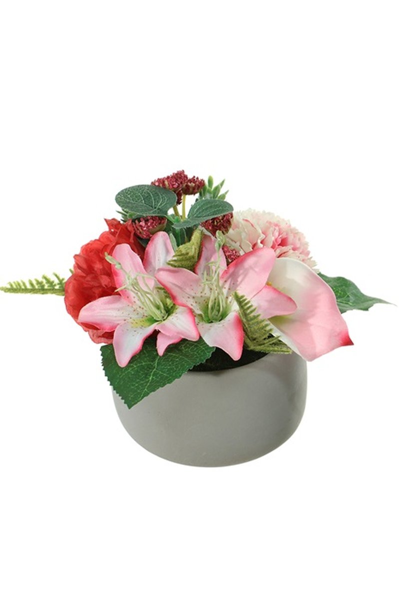 Decorative arrangement of lily, calla, peony and carnation ALFARA, decorative pot, pink-cream-red, 7.5"/19cm, Ø 8"/20cm
