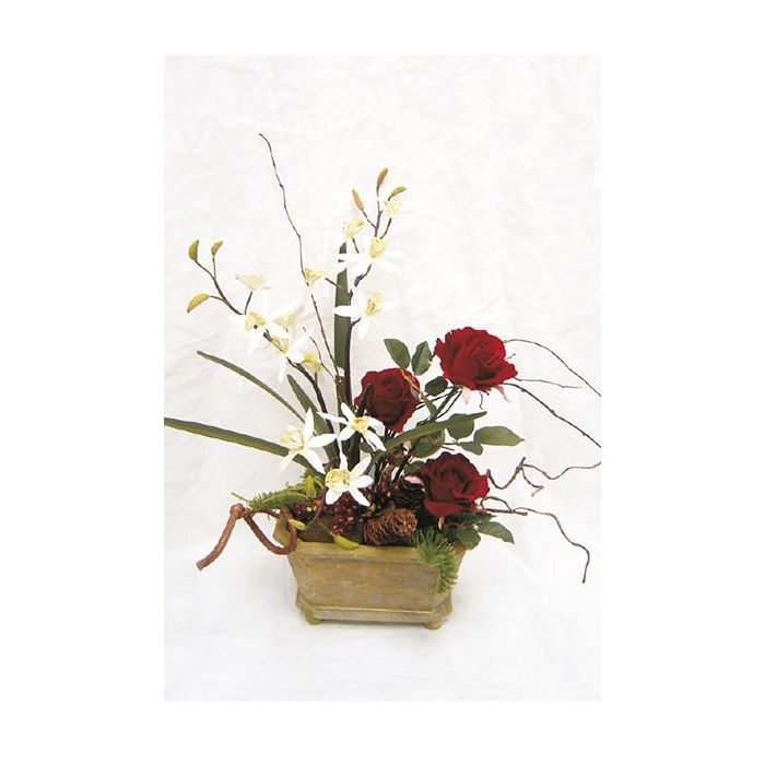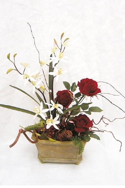 - With roses, dendrobium orchid, corkscrew willow, fir, cones and berries