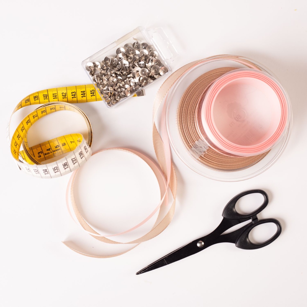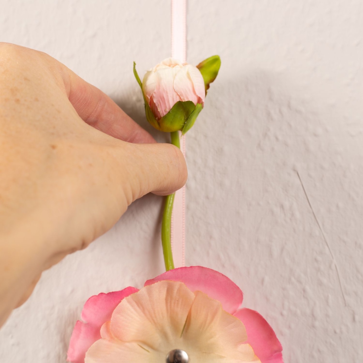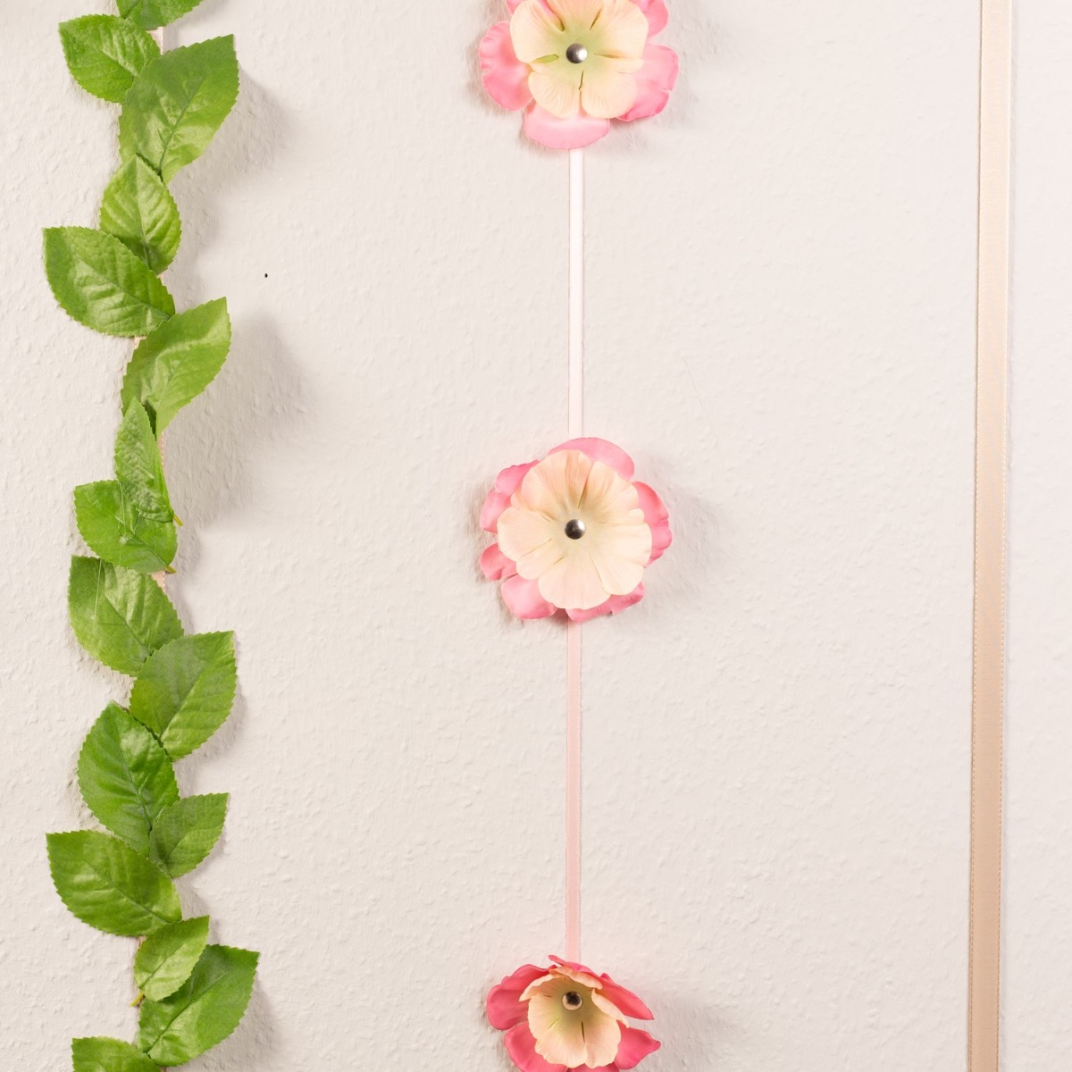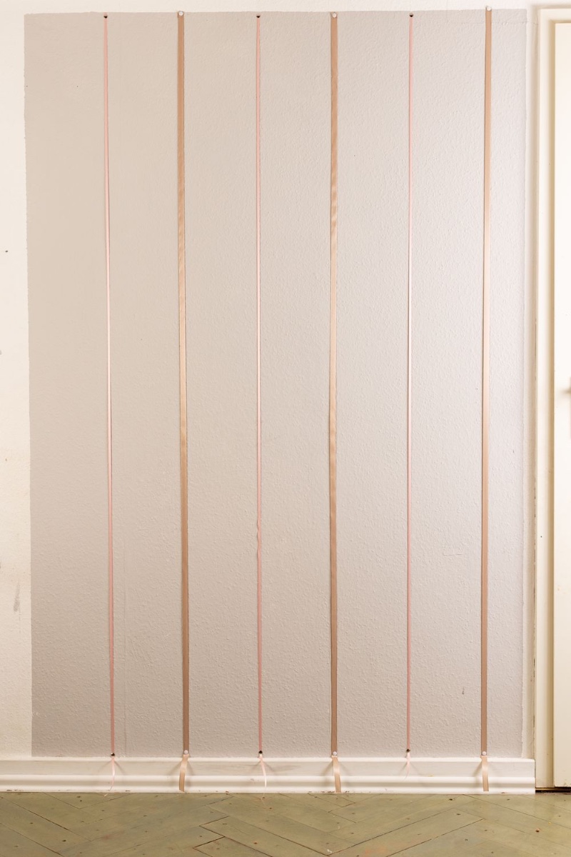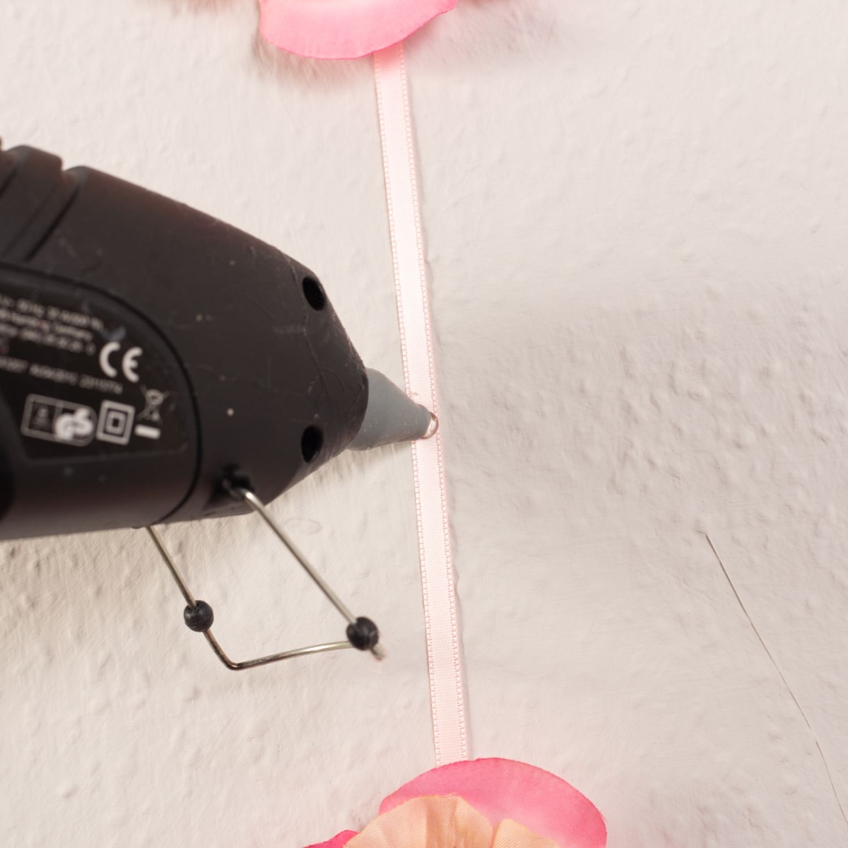 Design tip: First, determine the area where the wall design will be placed. Use a tape measure to mark the spacing between the individual rows, both at the top and bottom. We spaced the rows 20 cm apart. To make it easier later on, we covered the rows with satin ribbons and simply attached them with drawing pins. This has the advantage that the rows will look straight later on and can be easily removed when the decoration is no longer needed. For a row 2 metres long, we needed 10 petals, which were attached to the wall at intervals of 20 cm. Mark the intervals in advance with a tape measure.