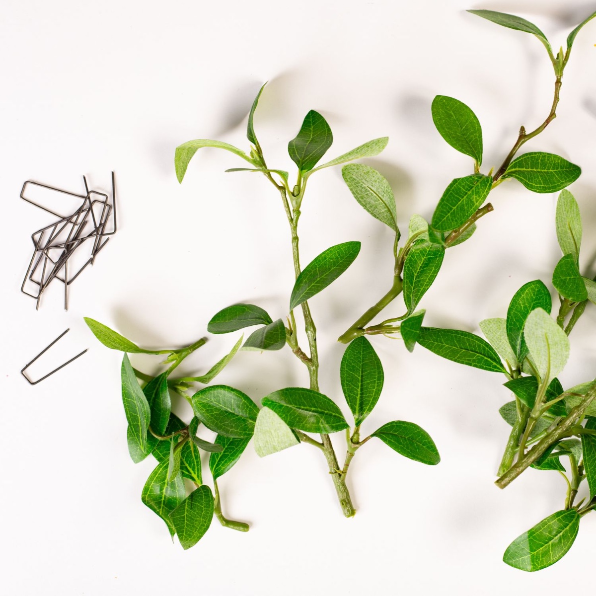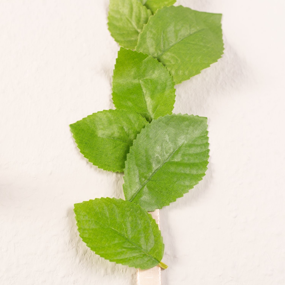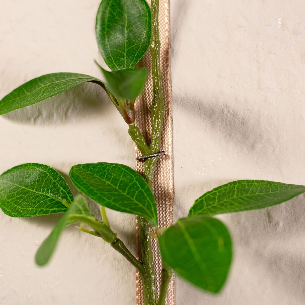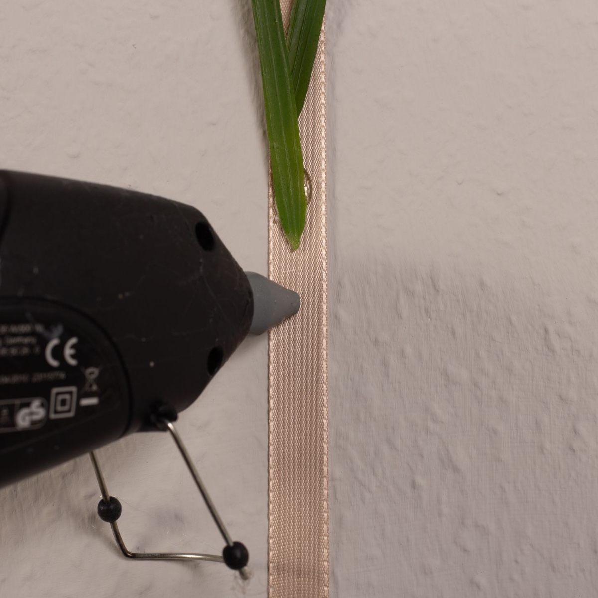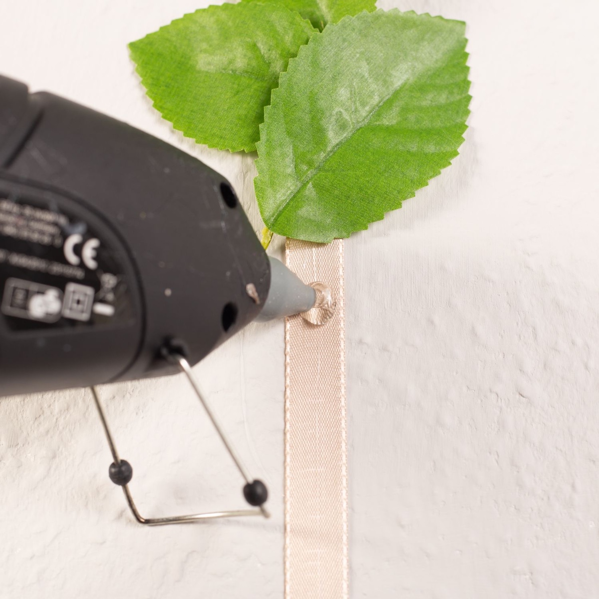 Cramps: We attached the leaf tendrils to the satin ribbons with hot glue, which was a very simple and quick solution. Start with the leaves from top to bottom so that they overlap nicely.