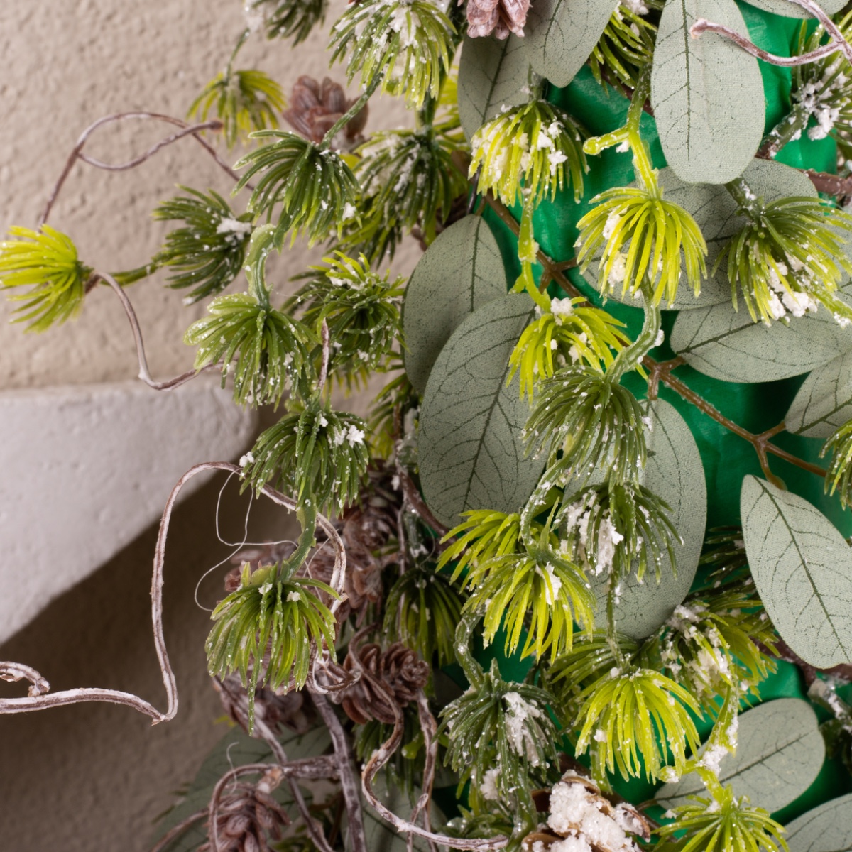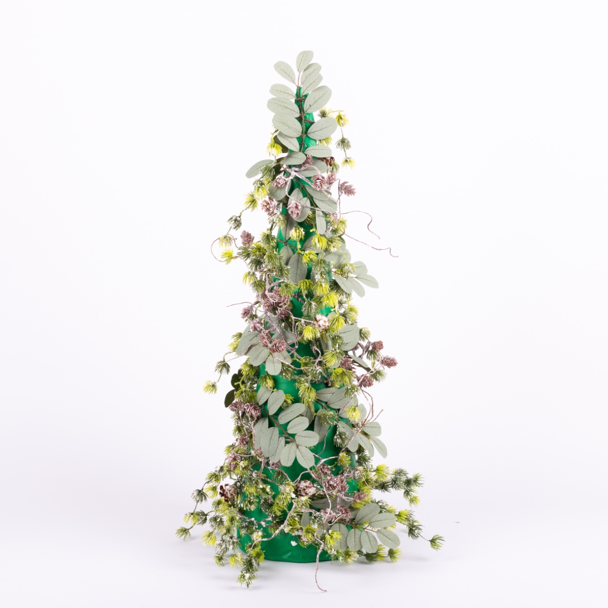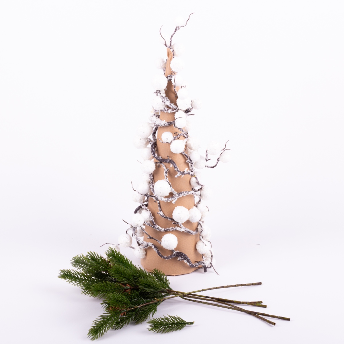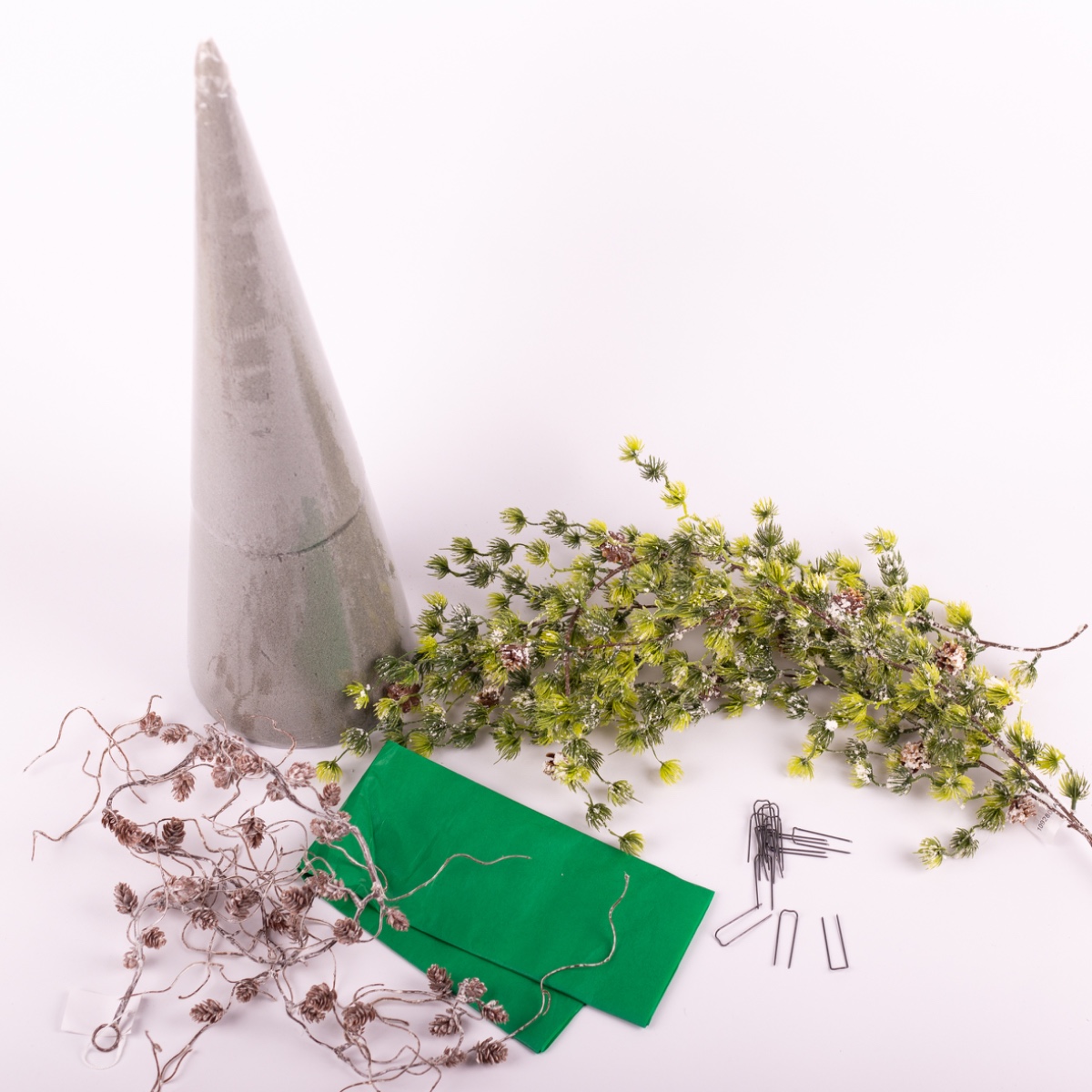 2. Separate the individual branches of the larch hanger and attach them to the cone. Start at the bottom and work your way up evenly. Every 10–12 cm, attach the delicate branches to the cone with a staple. The top can be slightly longer than the cone.