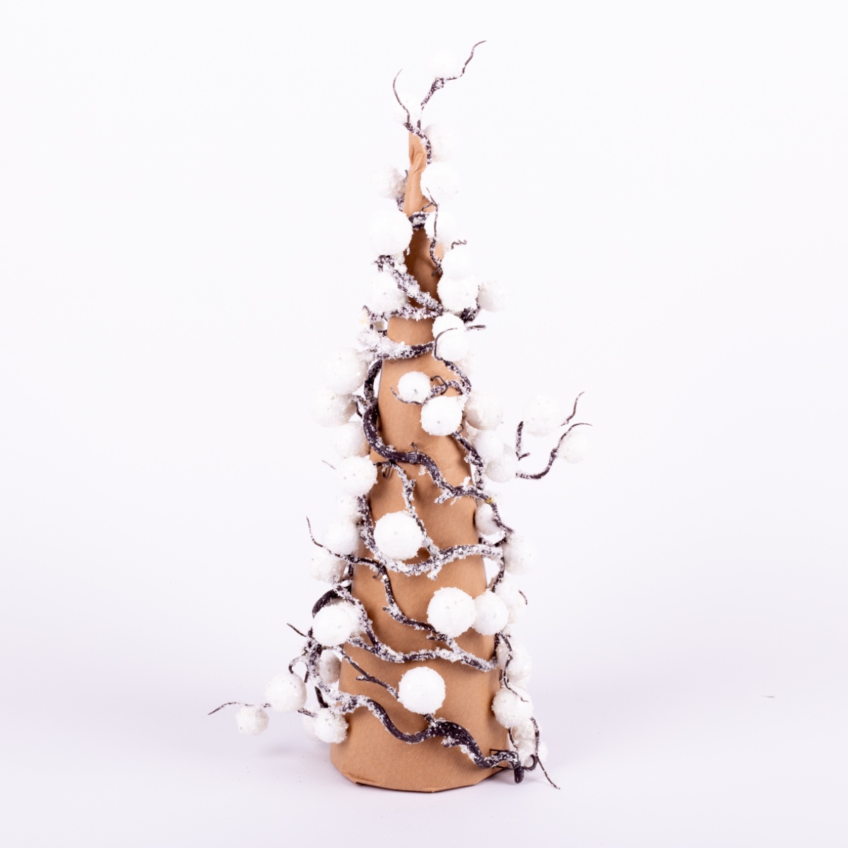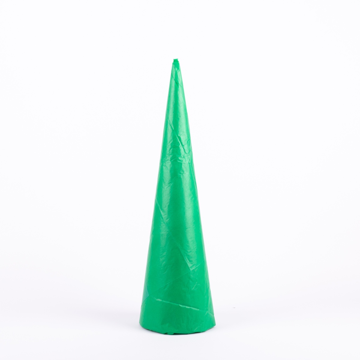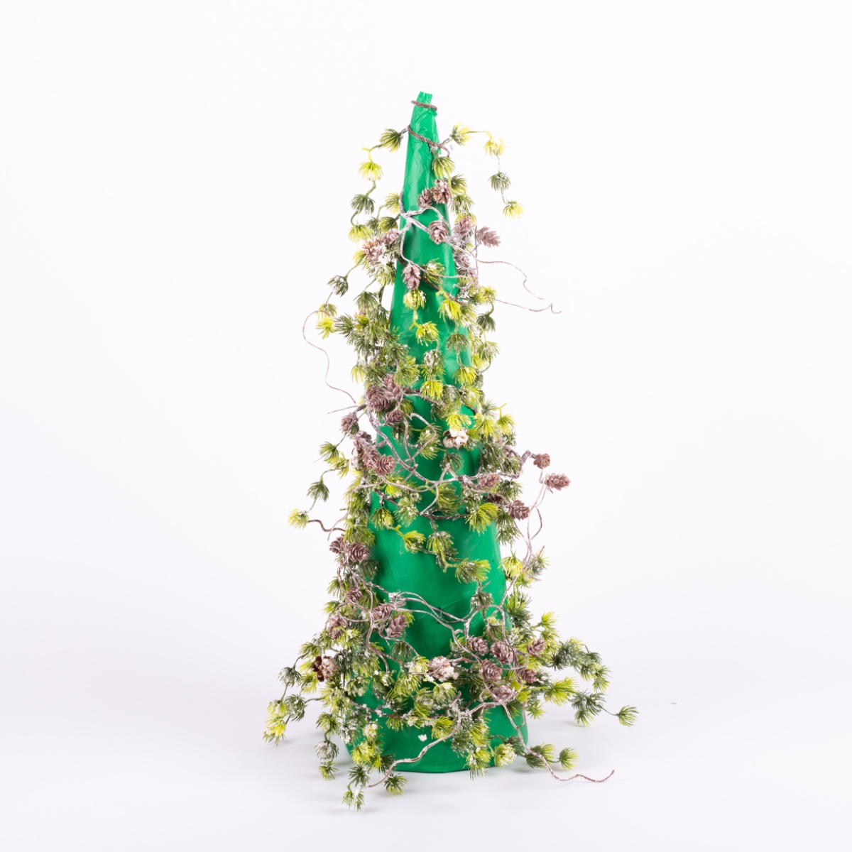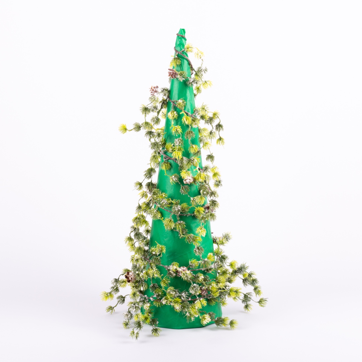 2. Wrap the cotton garland around the cone from bottom to top. Attach a staple every 10–12 cm to secure it in place. The end of the garland can be a little longer at the tip of the cone.
