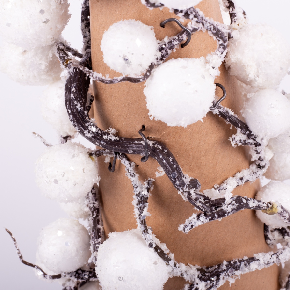 3. Now it's time to use the fir branches. First, separate the branches from the thick stems and then simply insert them into the gaps in the cotton garland. Only small pieces of the brown wrapping paper should be visible. The ends of the small branches can simply be inserted into the floral foam. If you like, you can also attach them with a hot glue gun.