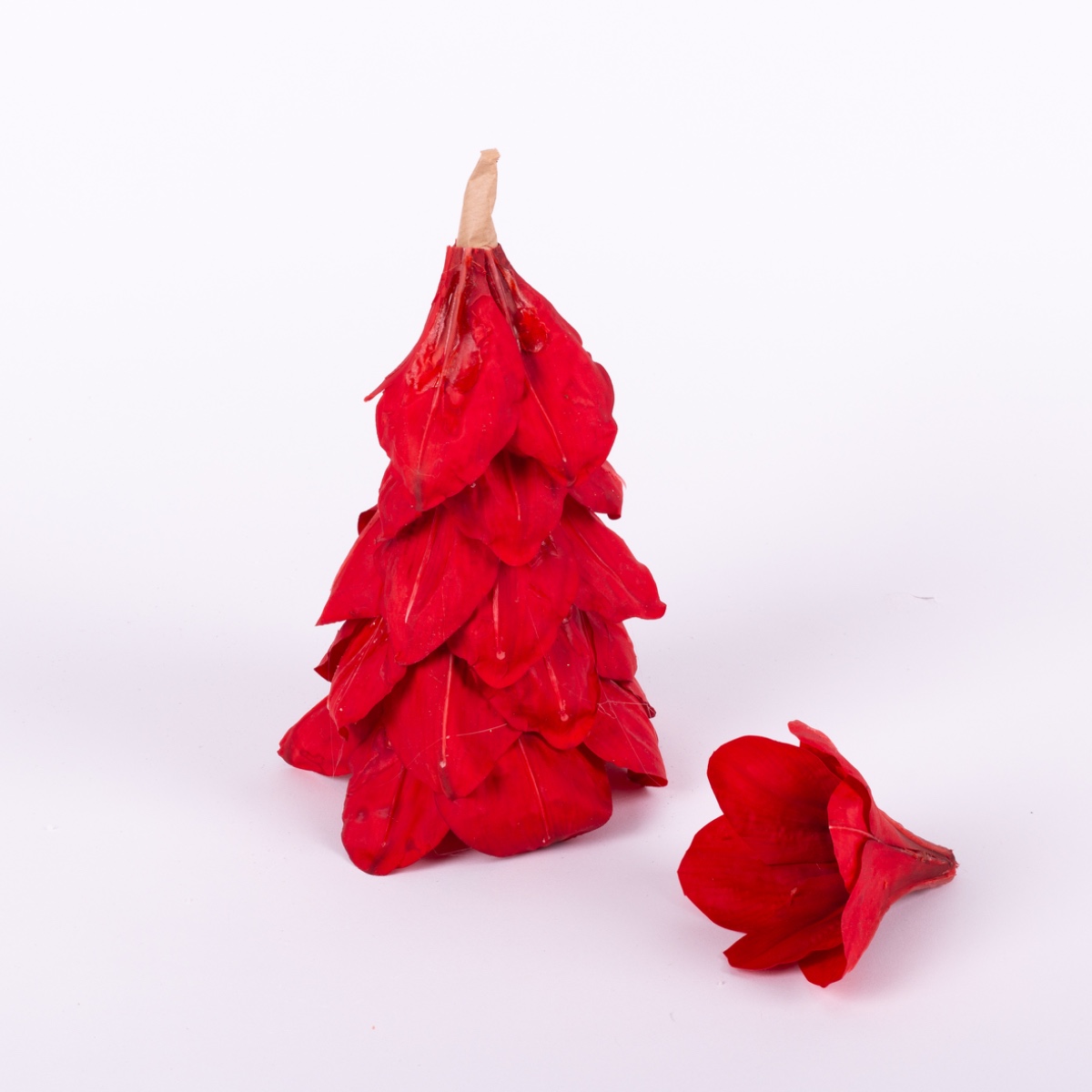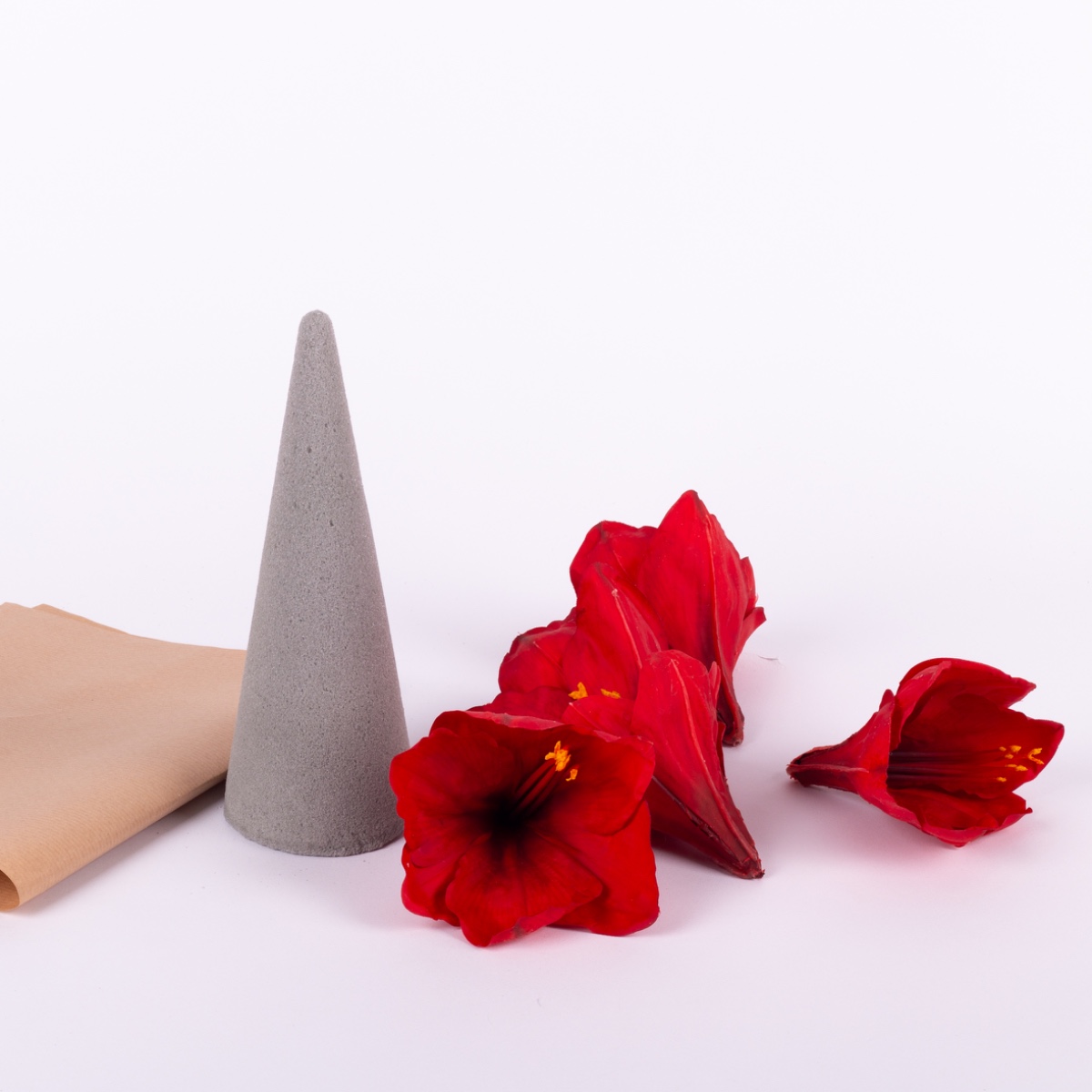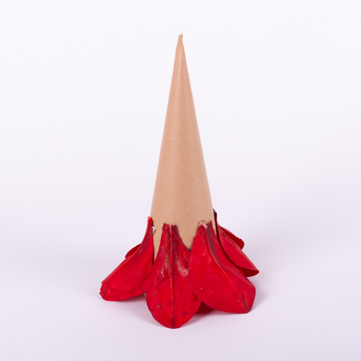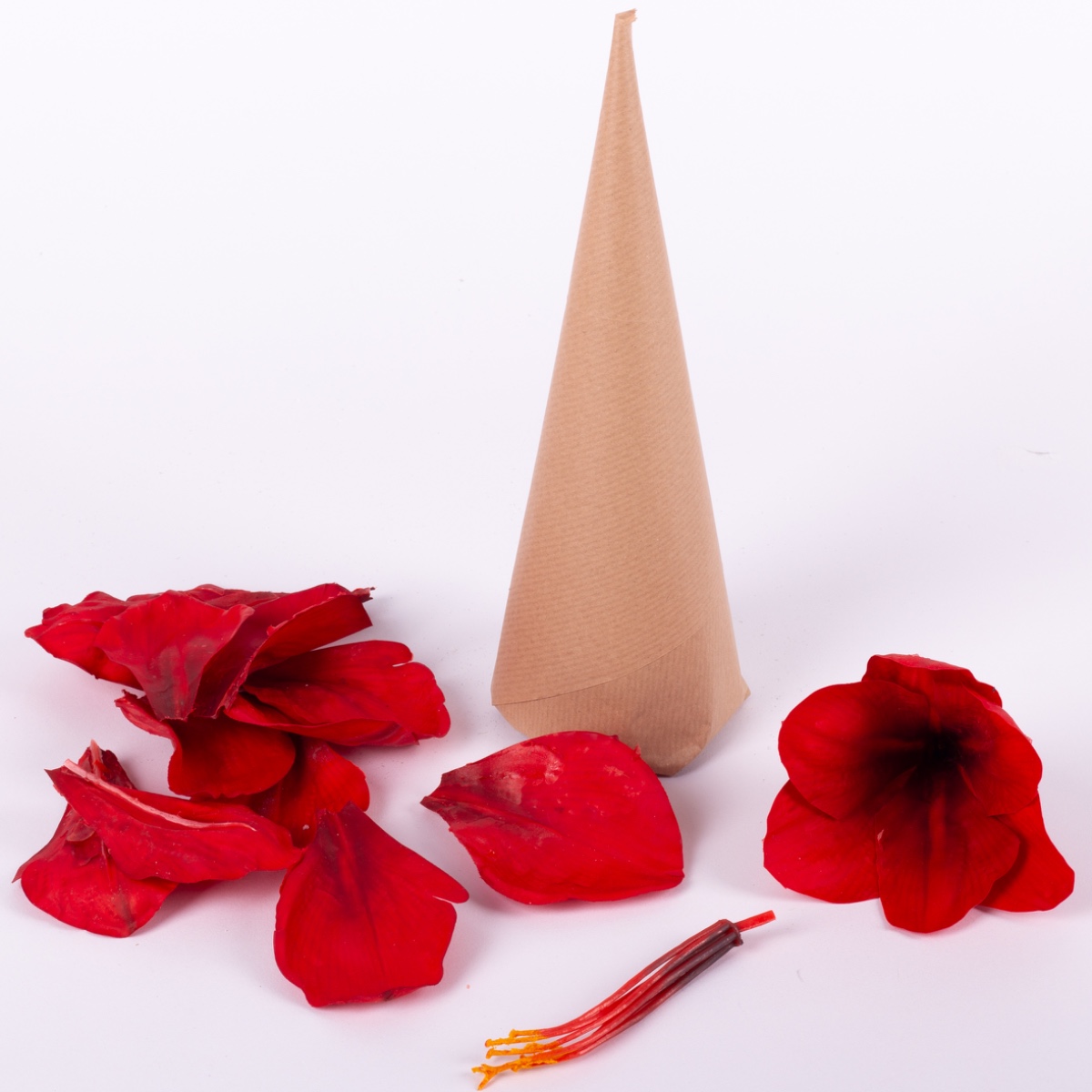 1. Wrap the cone with the paper and secure it with adhesive tape. Separate the petals of the amaryllis. Keep the centre part of each flower, which will later serve as the tip.