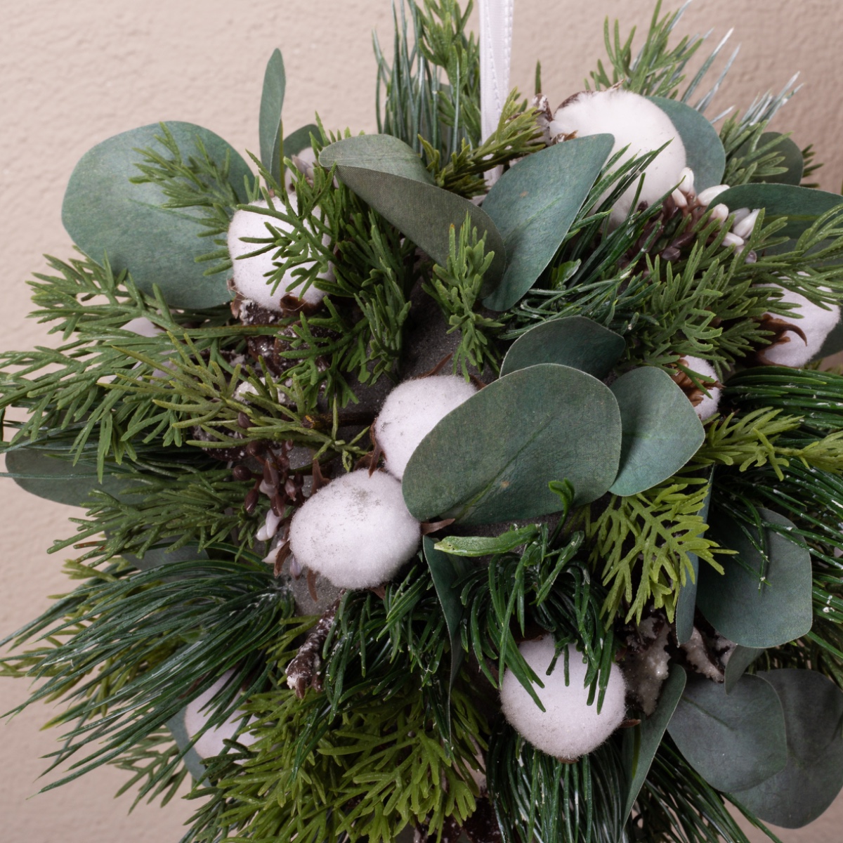 1. First, wrap the satin ribbon around the bauble, tie it tightly and secure it with 2-3 staples or pins. The ends of the satin ribbon should be at least 40 cm long, as these will later be used as hangers.