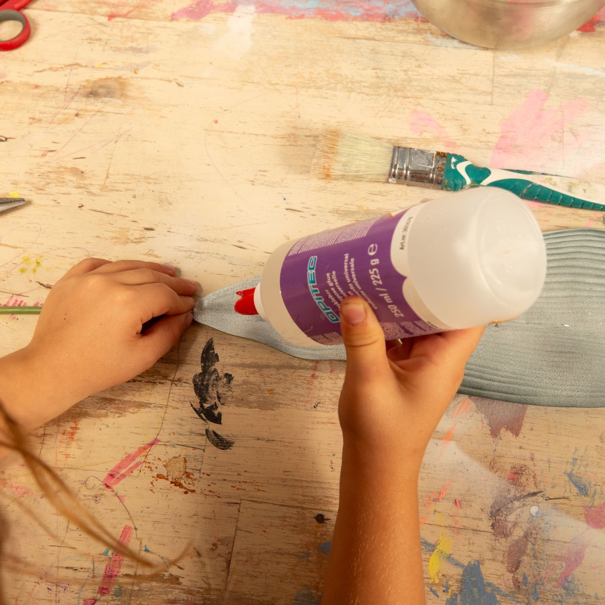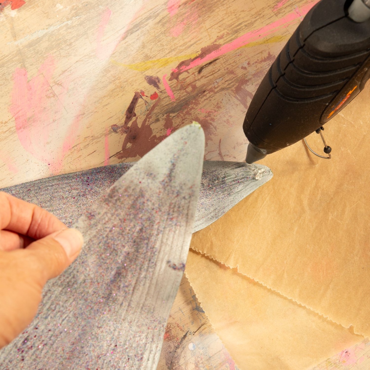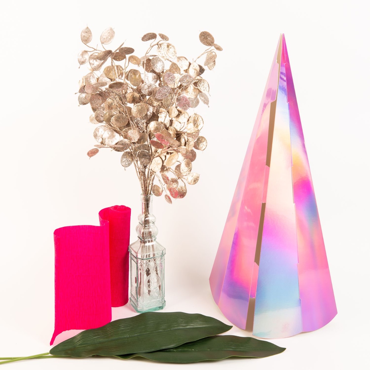 Additional materials required: a blank school cone, liquid glue, crepe paper, glitter and a paintbrush