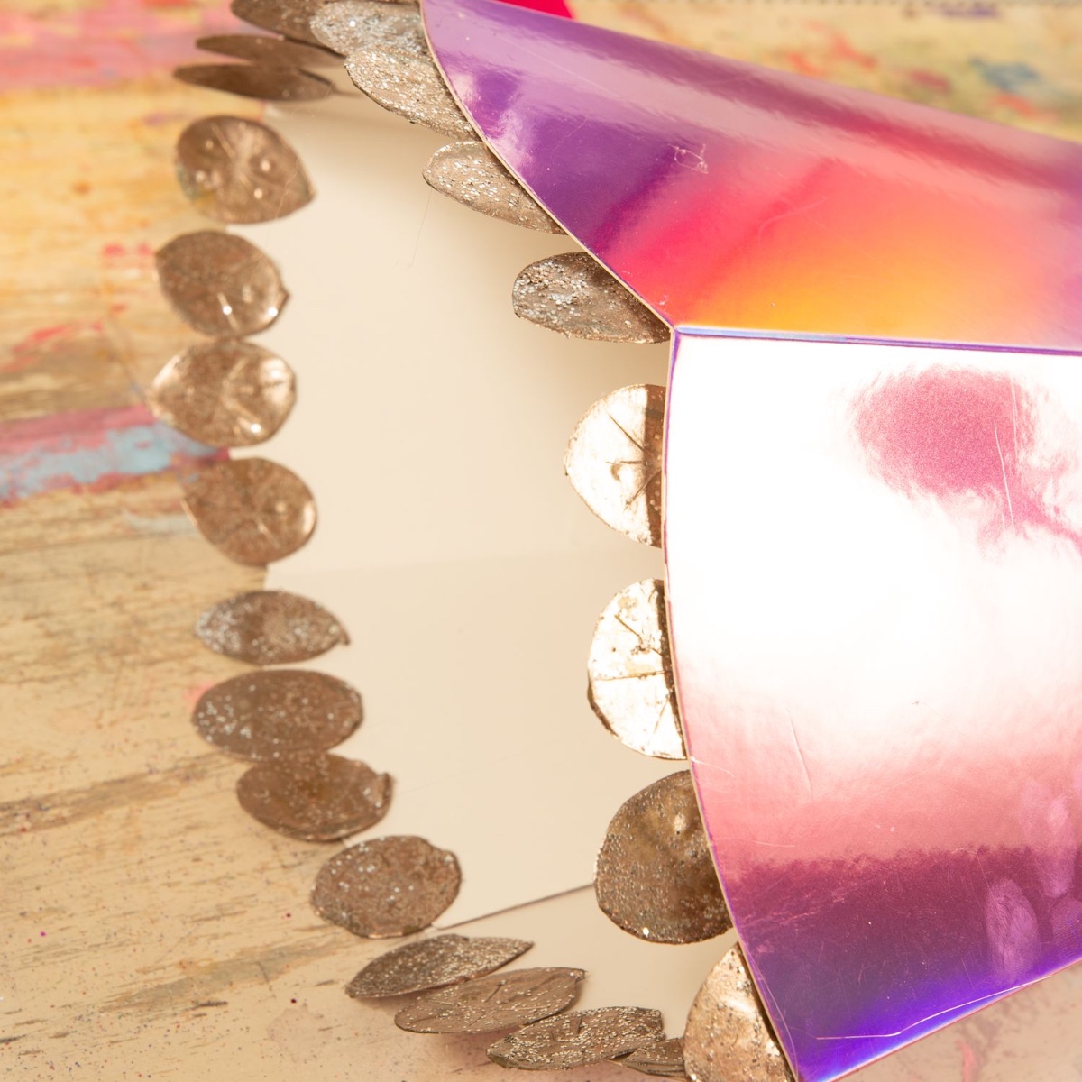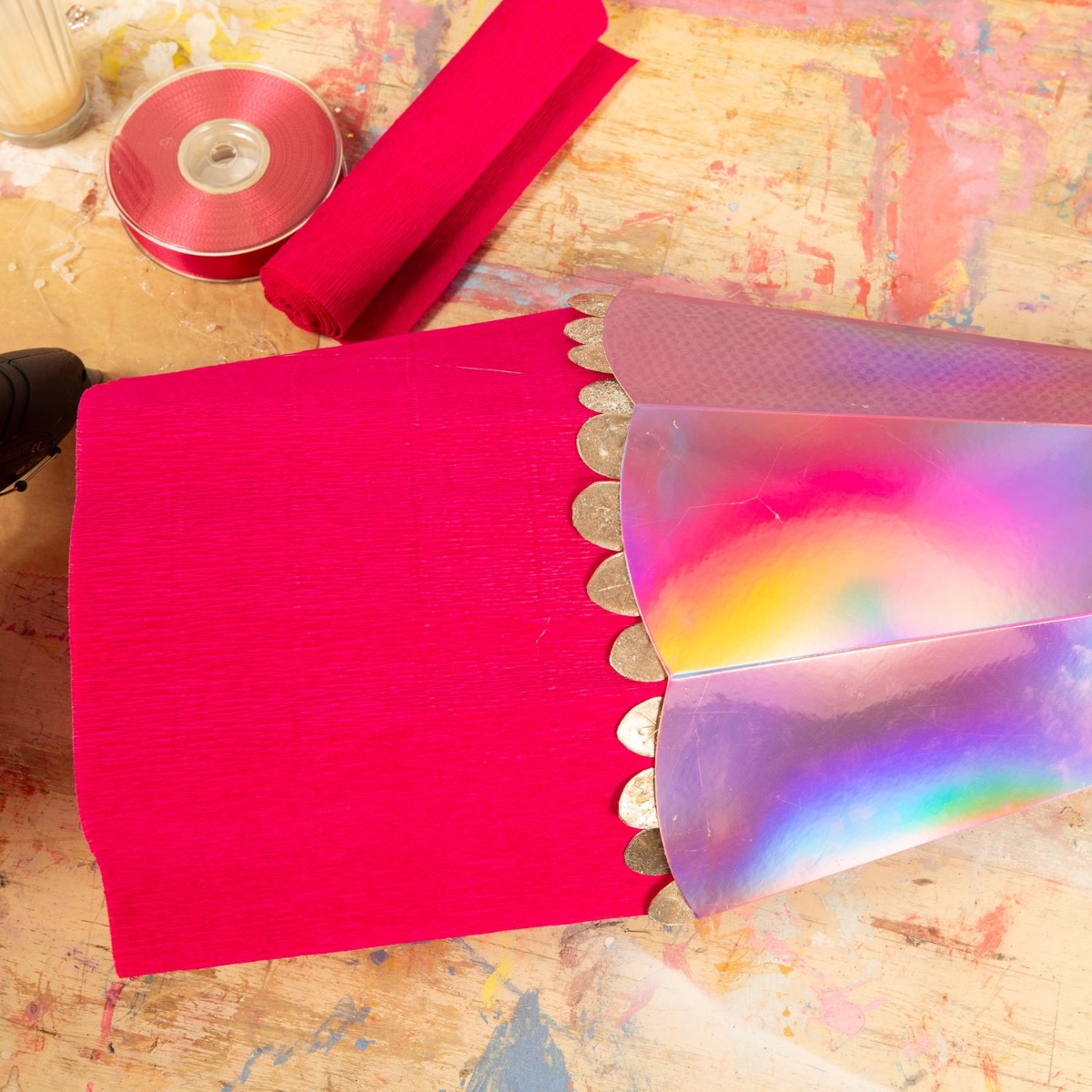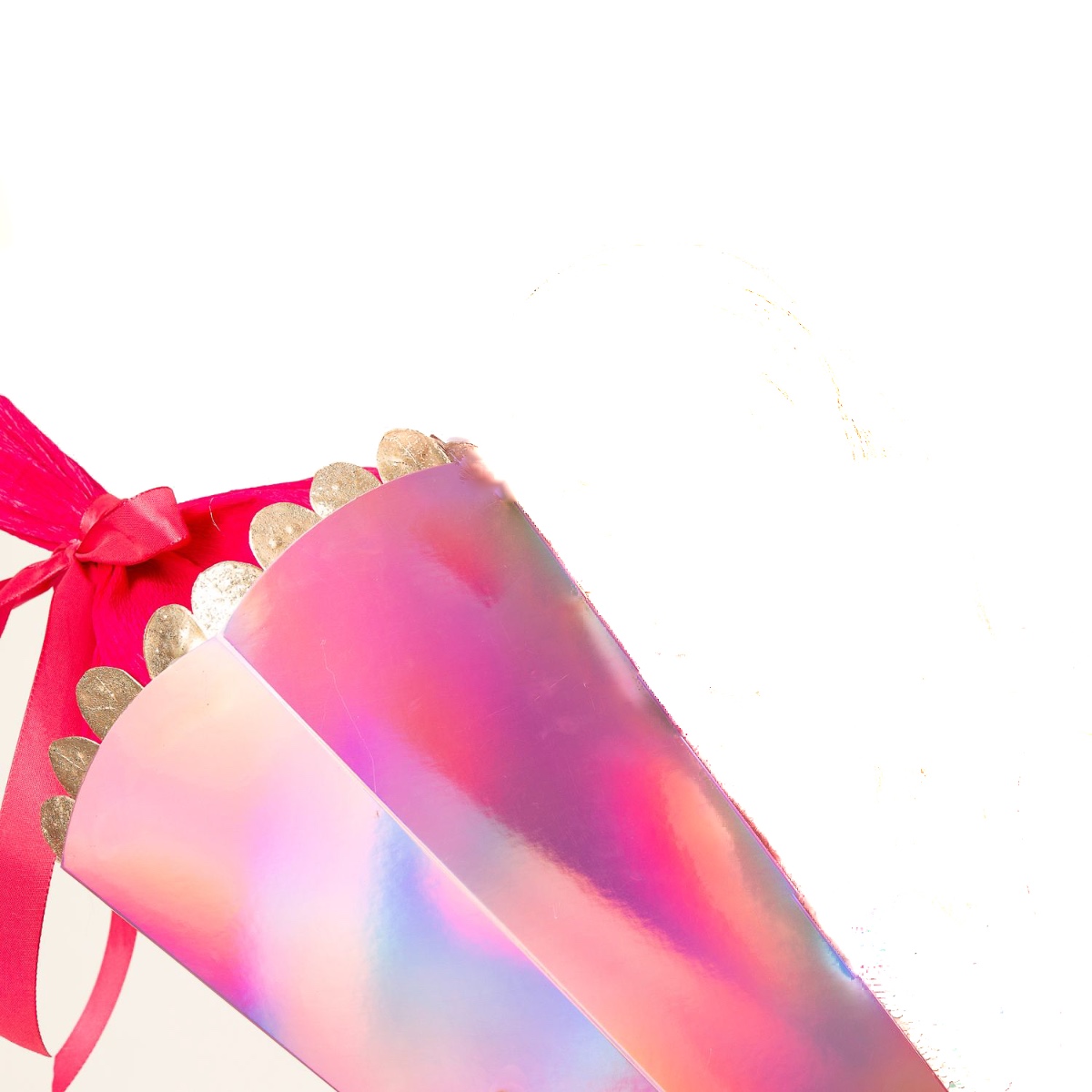 8. The crepe paper is now attached to the inside edge. We don't want all the sweets to fall out. Now add a piece of satin ribbon to tie it up and the mermaid school cone is finished.