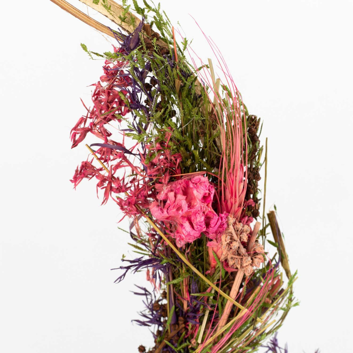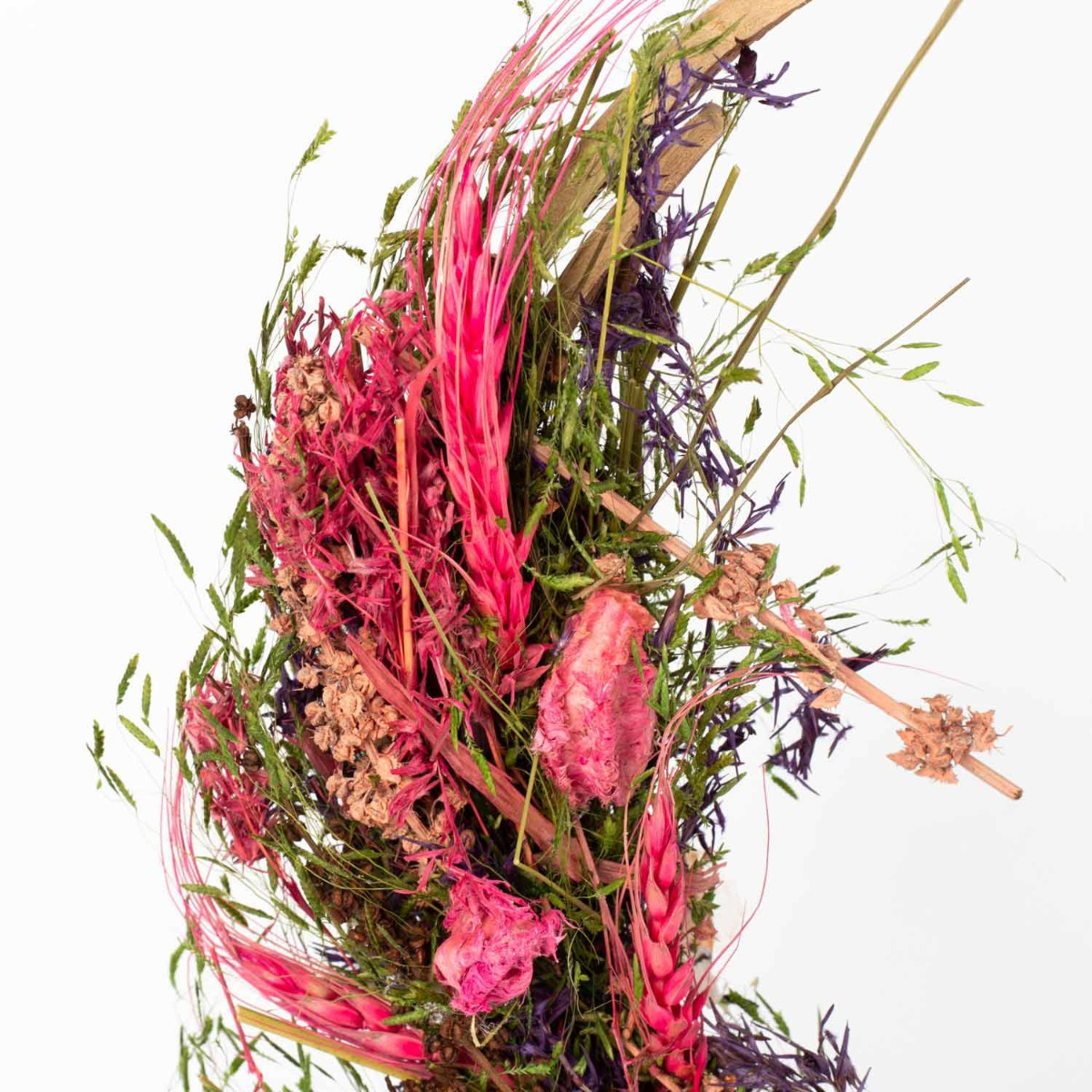 - The arrangement consists of various dried flowers in light pink-fuchsia colour