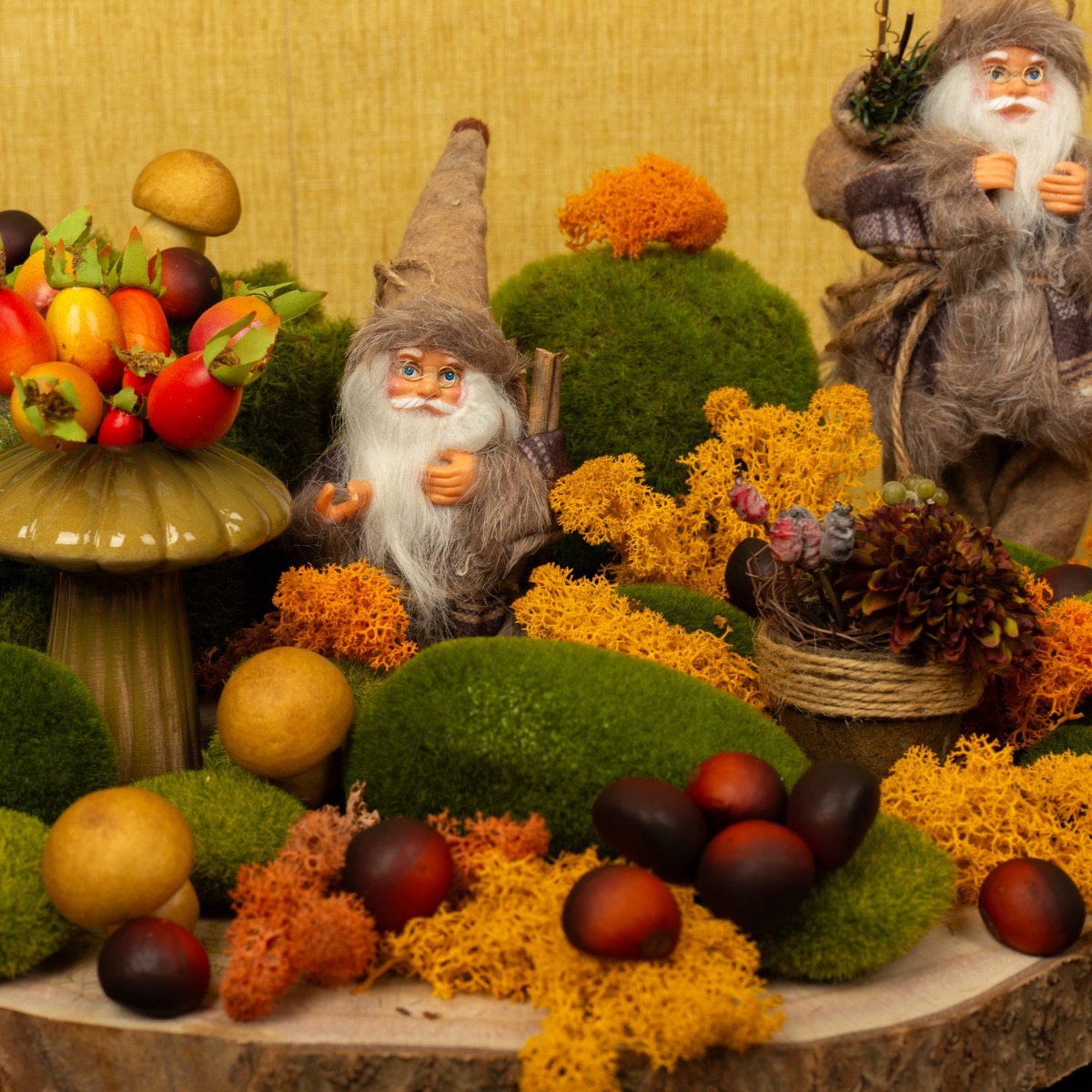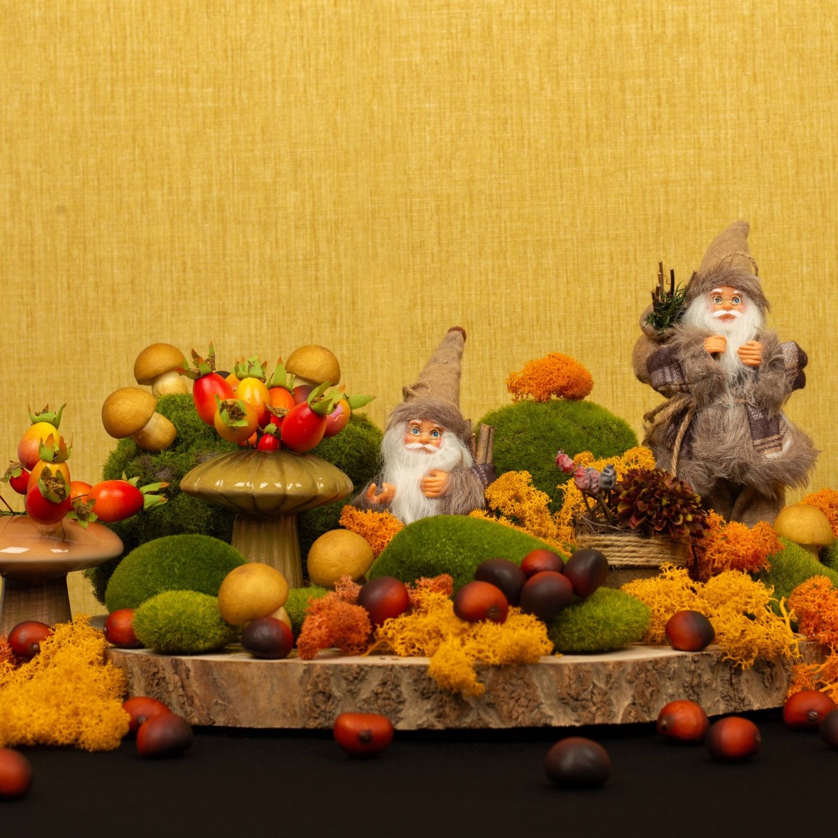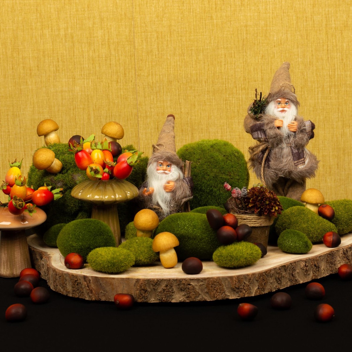 Moss, gnomes and mushrooms! With this look, we have created a wonderful autumn world that invites children and adults to dream. The highlight of this autumn decoration are our ceramic mushrooms, which can be used as a small vase. The large wooden disc is the perfect base for our world, which has been decorated with small and large moss stones. A magical hilly landscape comes to life, waiting for the industrious gnomes to move in and collect the delicious mushrooms and chestnuts. Shop the look!