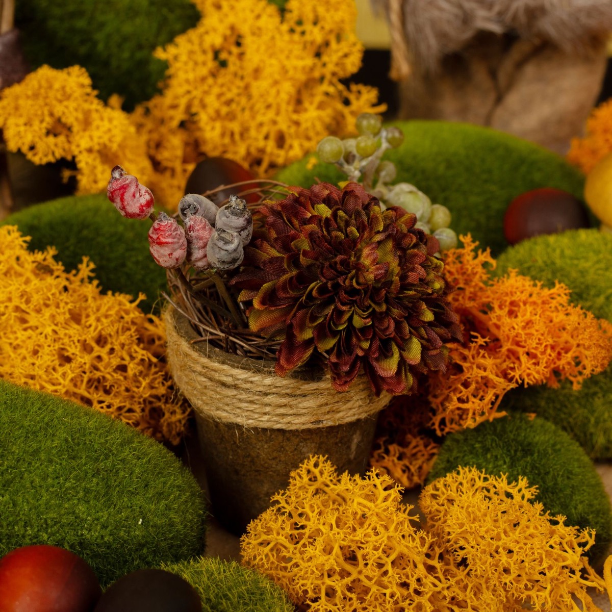 Design tip: We have decorated the mushroom vases with rose hips, which are easy to bend, because they are attached to a wire. The mushrooms also have a wire at the bottom. We stuck some of these into the moss balls. Now it looks as if the mushrooms are growing directly on the moss.