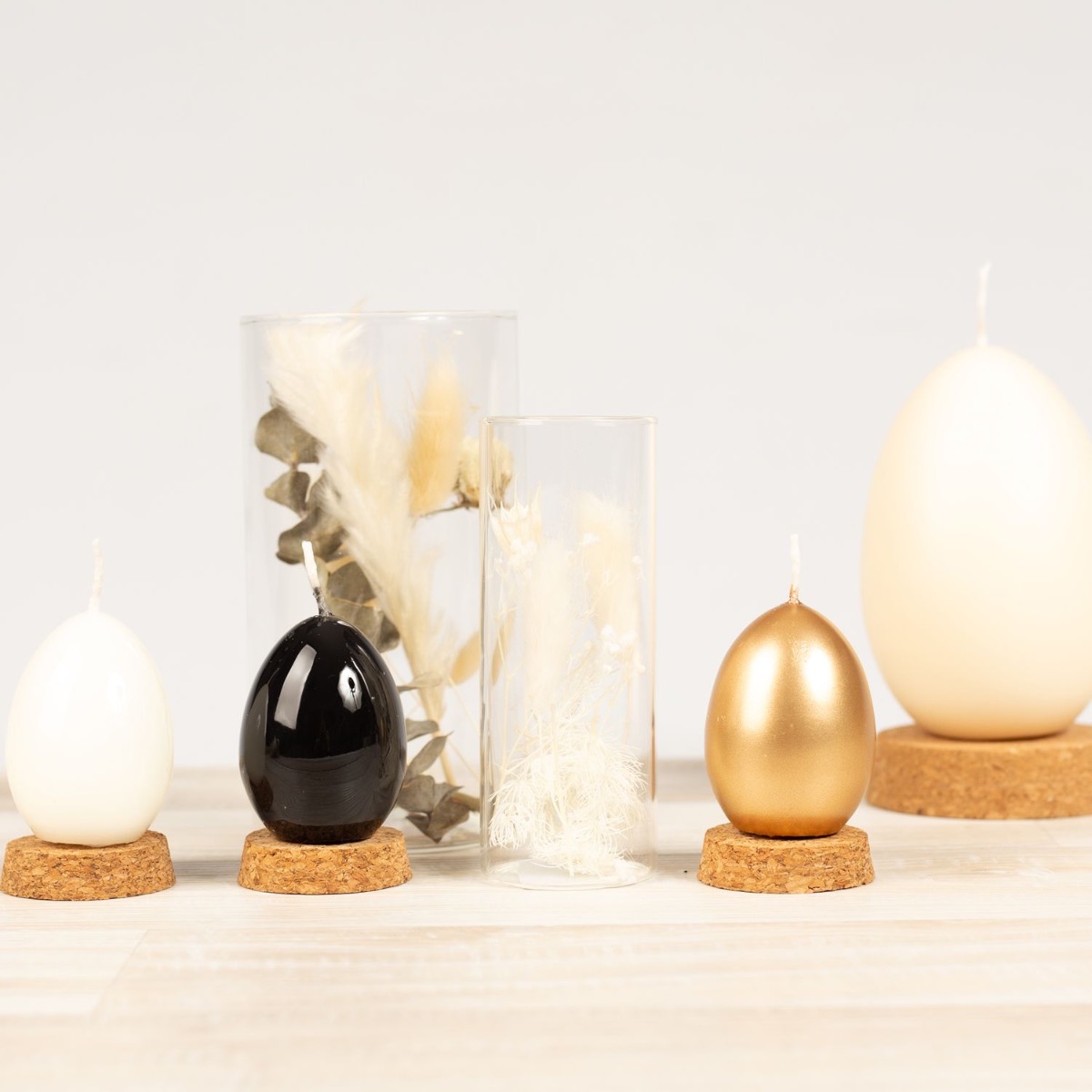 Gold and black! With these colours, you don't first think of Easter and spring. In view of the noble look, you really feel like going on the annual egg hunt. Different sized Easter egg candles in a noble design with a gold lacquer or an incredibly shiny black lacquer. To match, we have selected two products from our dried flower range. Tubular glasses, filled with dried flowers, are totally modern at the moment and underline the noble look of the egg candles. Have a wonderful Easter time! Shop the Look!