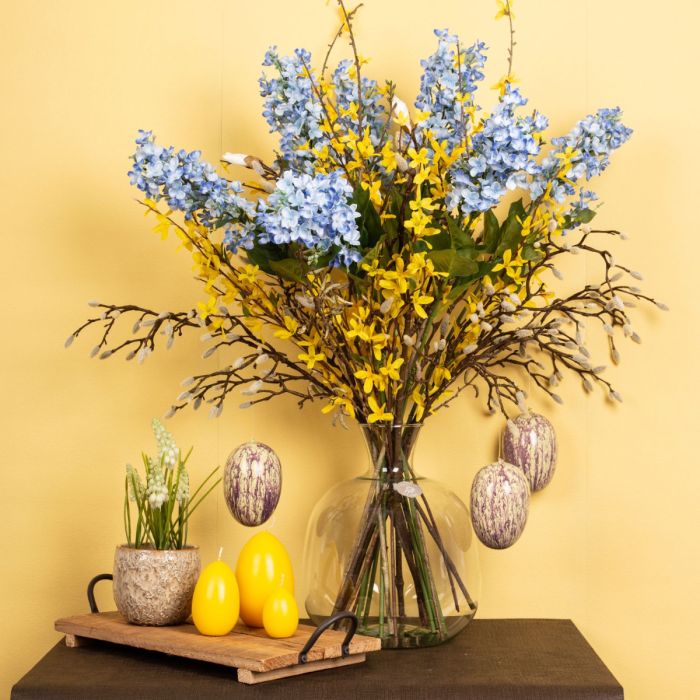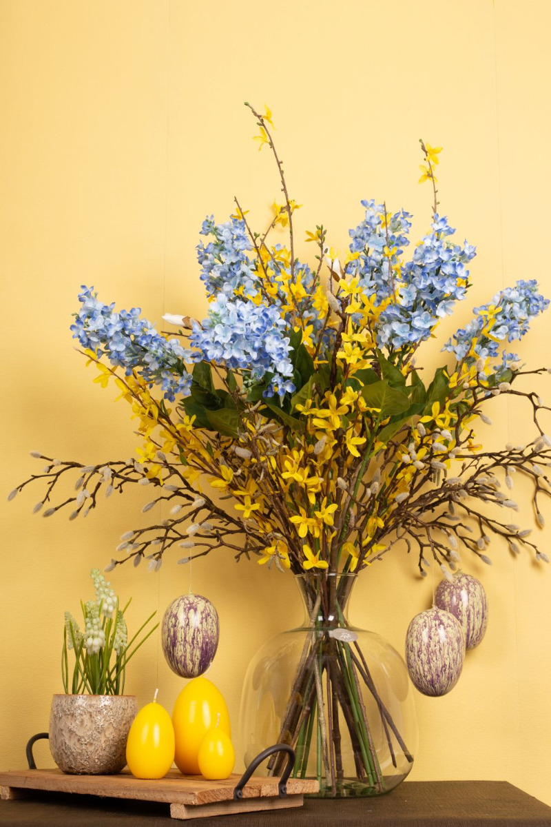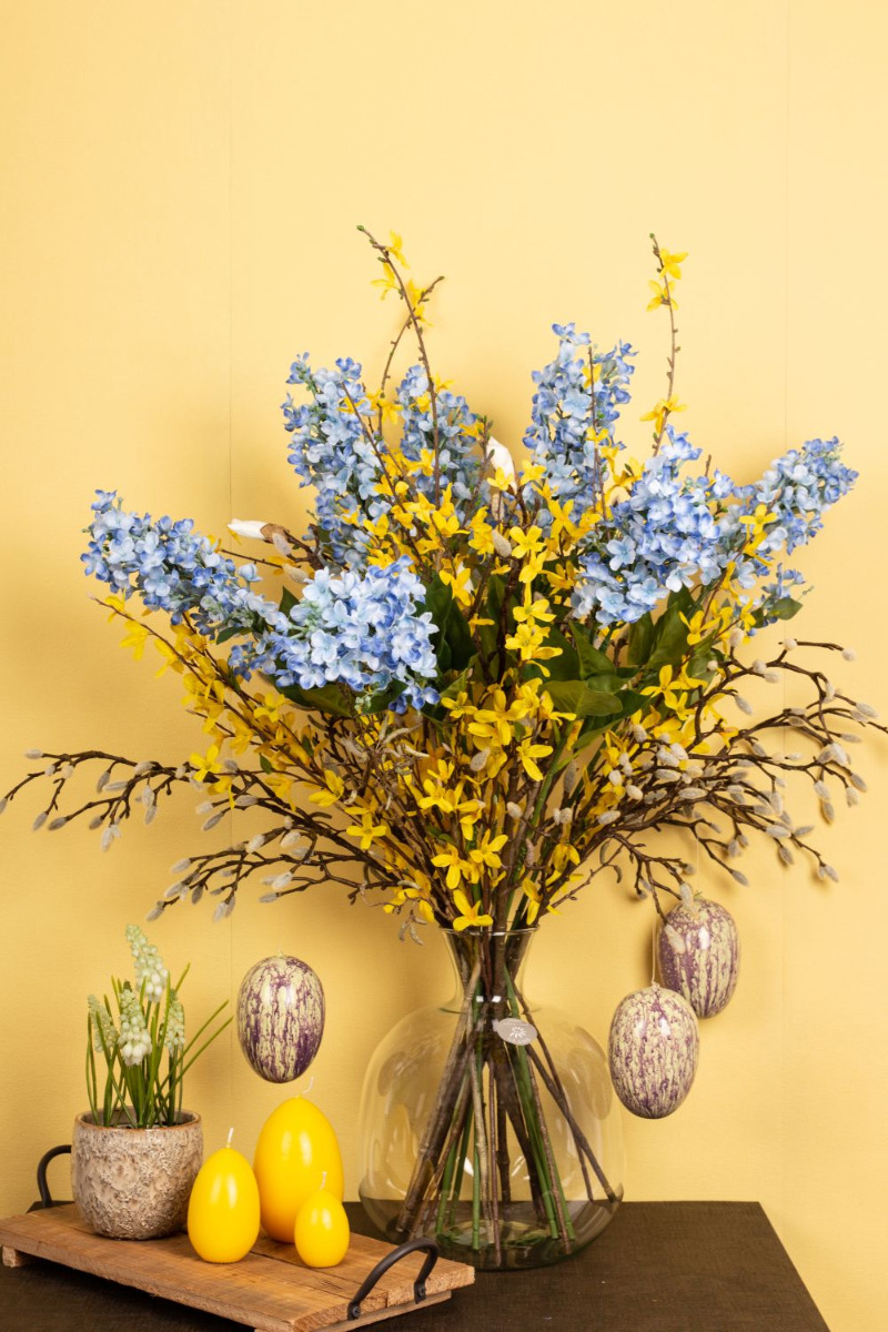 Plain and natural! The long winter is finally over and the first rays of sunshine conjure up the first blossoms in nature. At last it is getting warm again! The magnolias and birch twigs look like they were picked by hand and are perfect for hanging a few Easter eggs on. White hyacinths are really rare to see in nature. Here they go particularly well with the white fluffy buds of the magnolia. We have extended this look with 5 yellow forsythia branches and blue lilac. Let the Easter egg hunt begin! Shop the look!