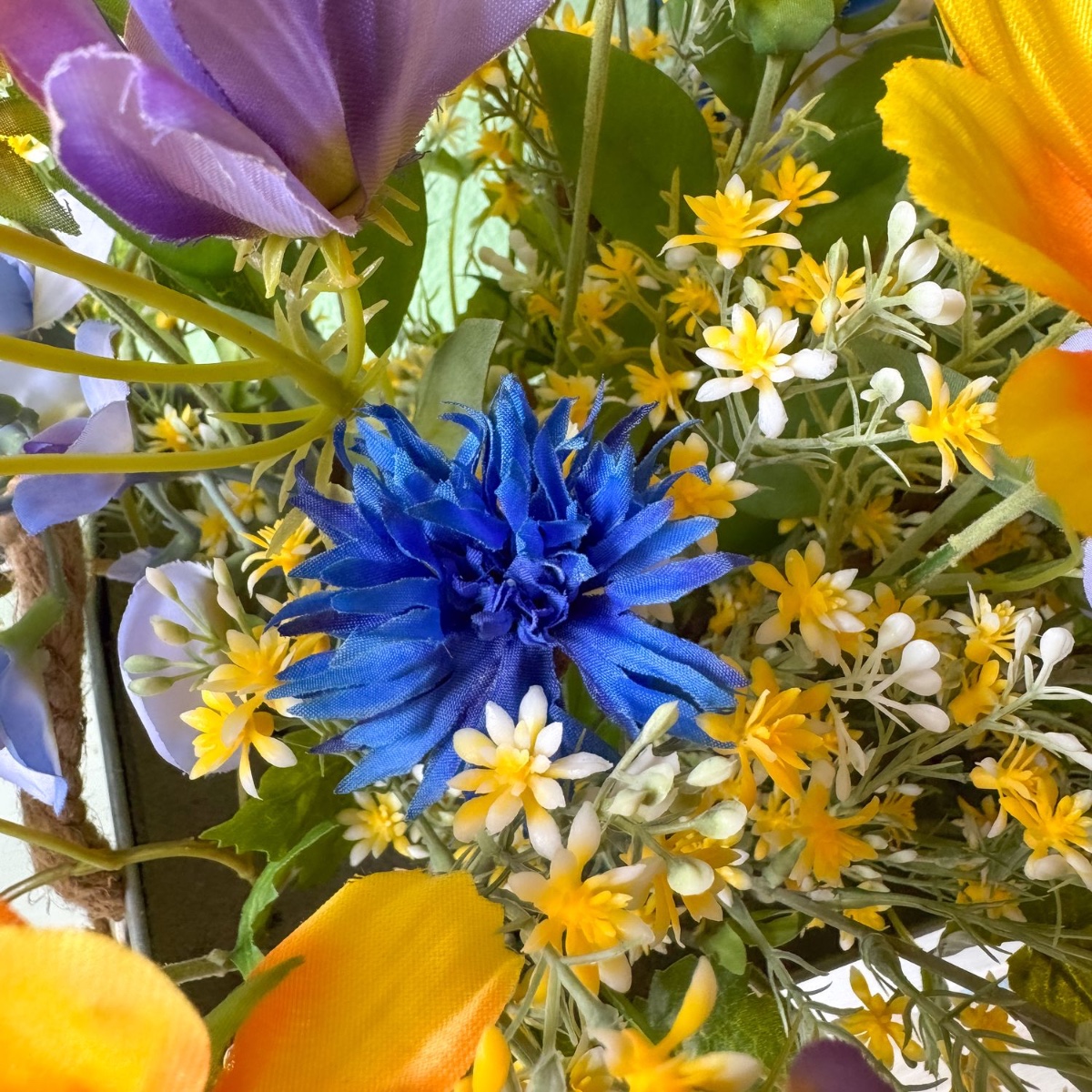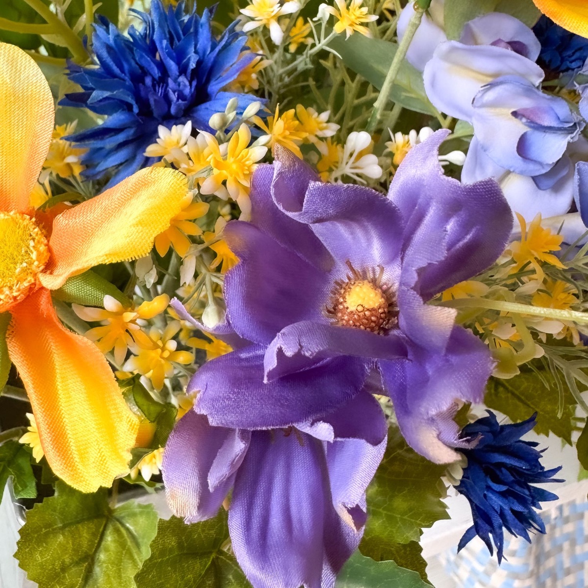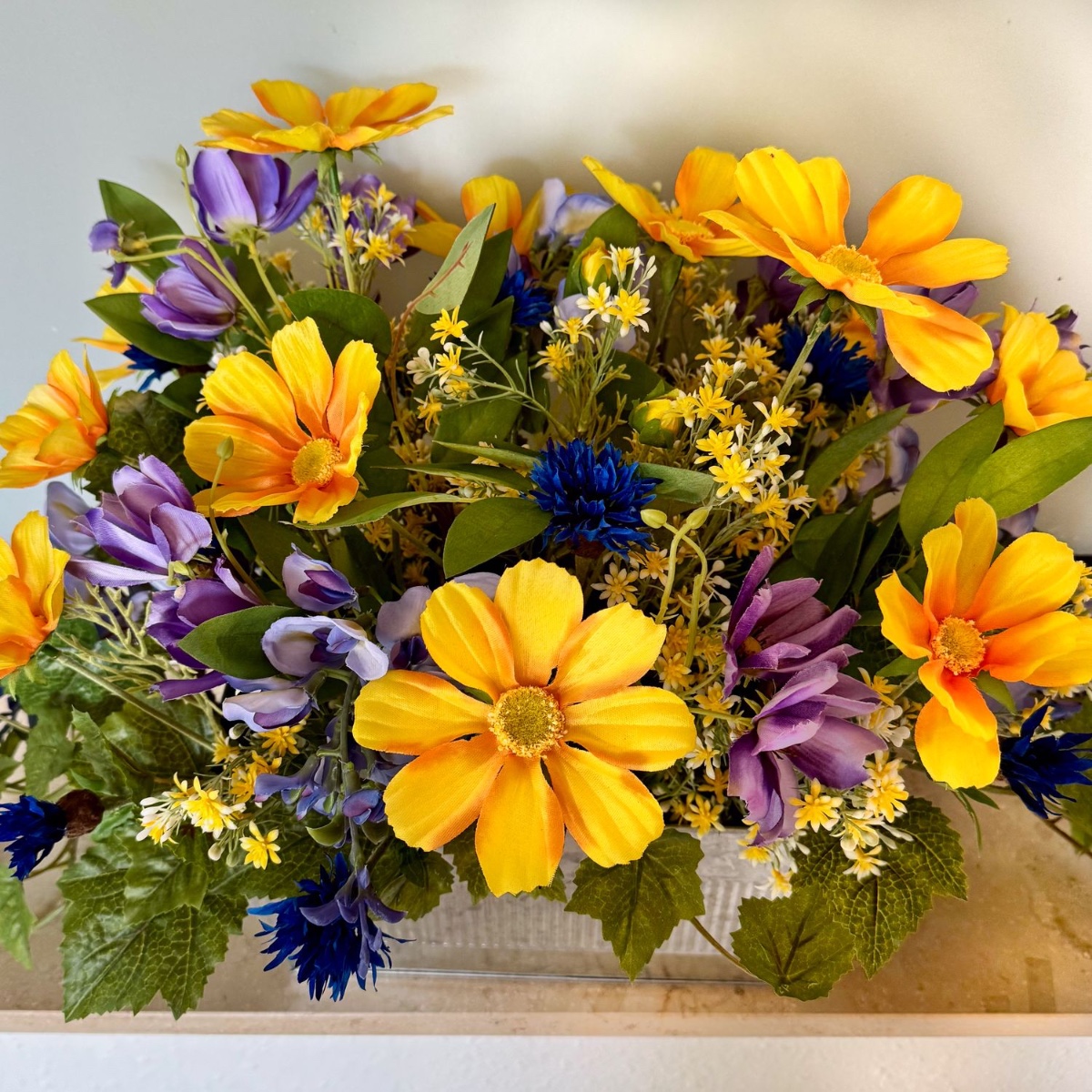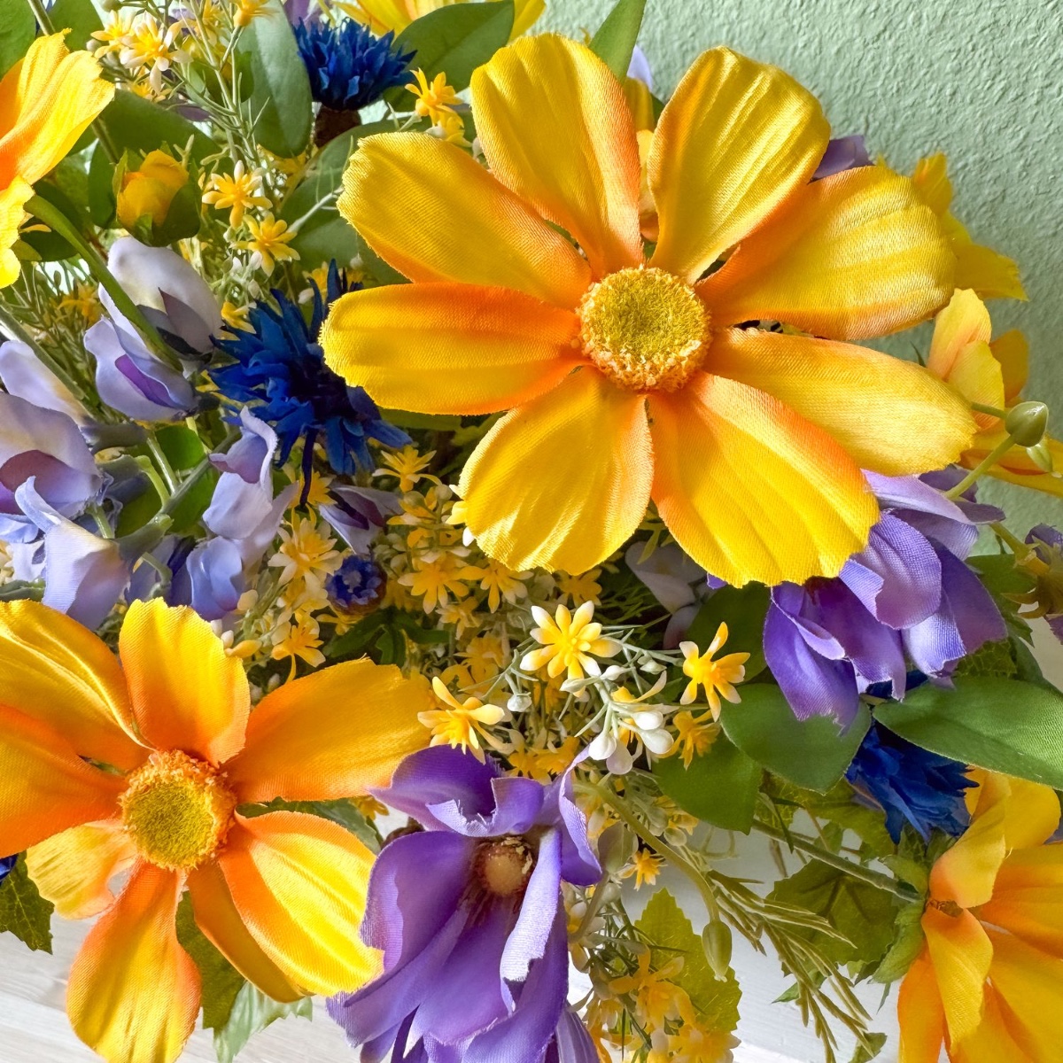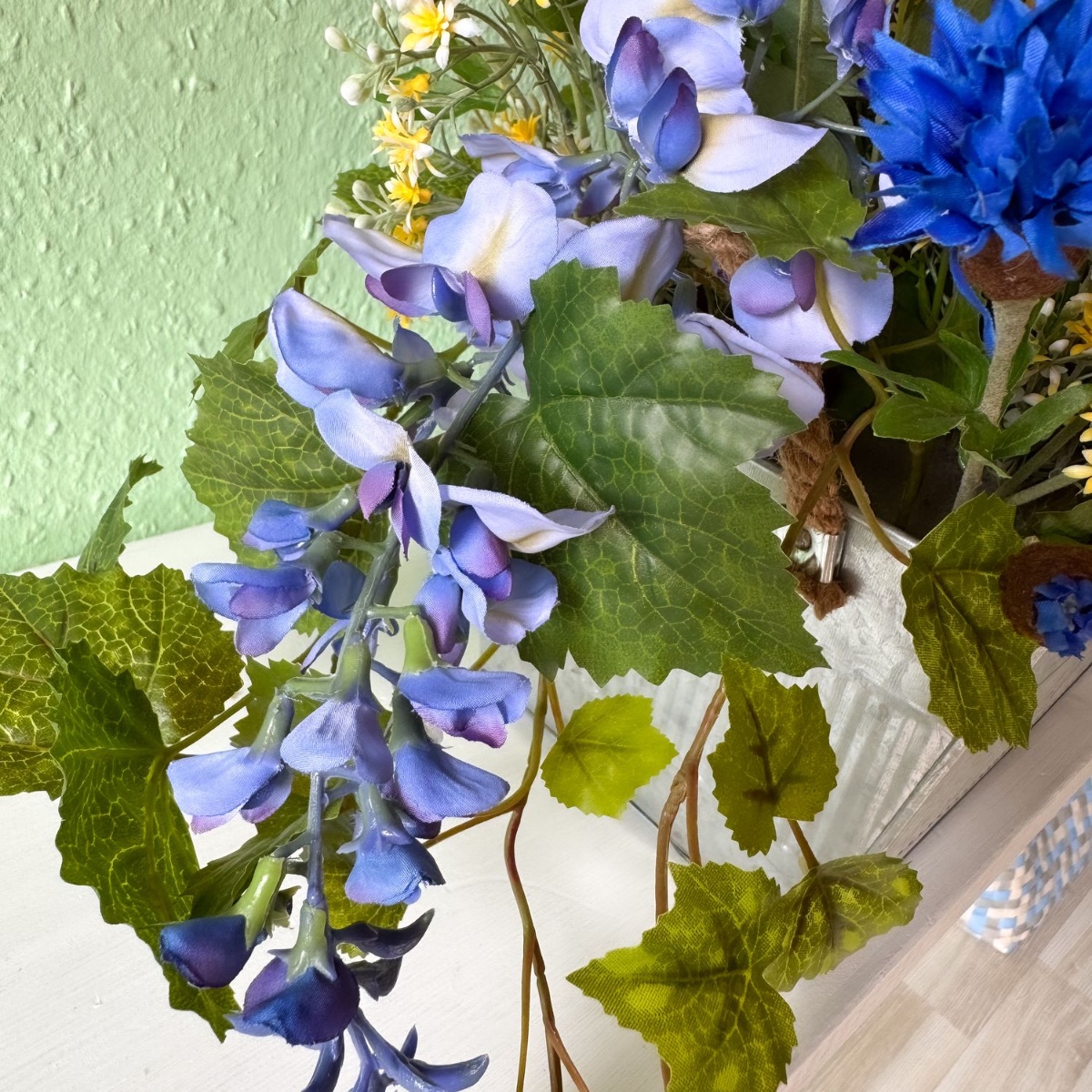 Wildflower love! We received a second request from our customer Hans-Peter. This time, he needed a flower arrangement for a baroque golden centrepiece with stylised flowers. He wanted blue cornflowers and other bright yellow and purple flowers, as well as matching vine leaves for the centrepiece. To ensure perfect results, he sent us the insert of the container again so that we could anchor the floral foam precisely inside it. We complemented the cornflowers with cosmos, dill and wisteria branches. Each branch was shortened and divided into several flower stems. We inserted these synchronously from the inside to the outside into the floral foam for even distribution. The grapevine and wisteria were hung on the short sides of the container. We sent our customer a few pictures of our first creation. Hans Peter was thrilled and ordered it right away. Would you also like an extravagant artificial arrangement? Shop the look!