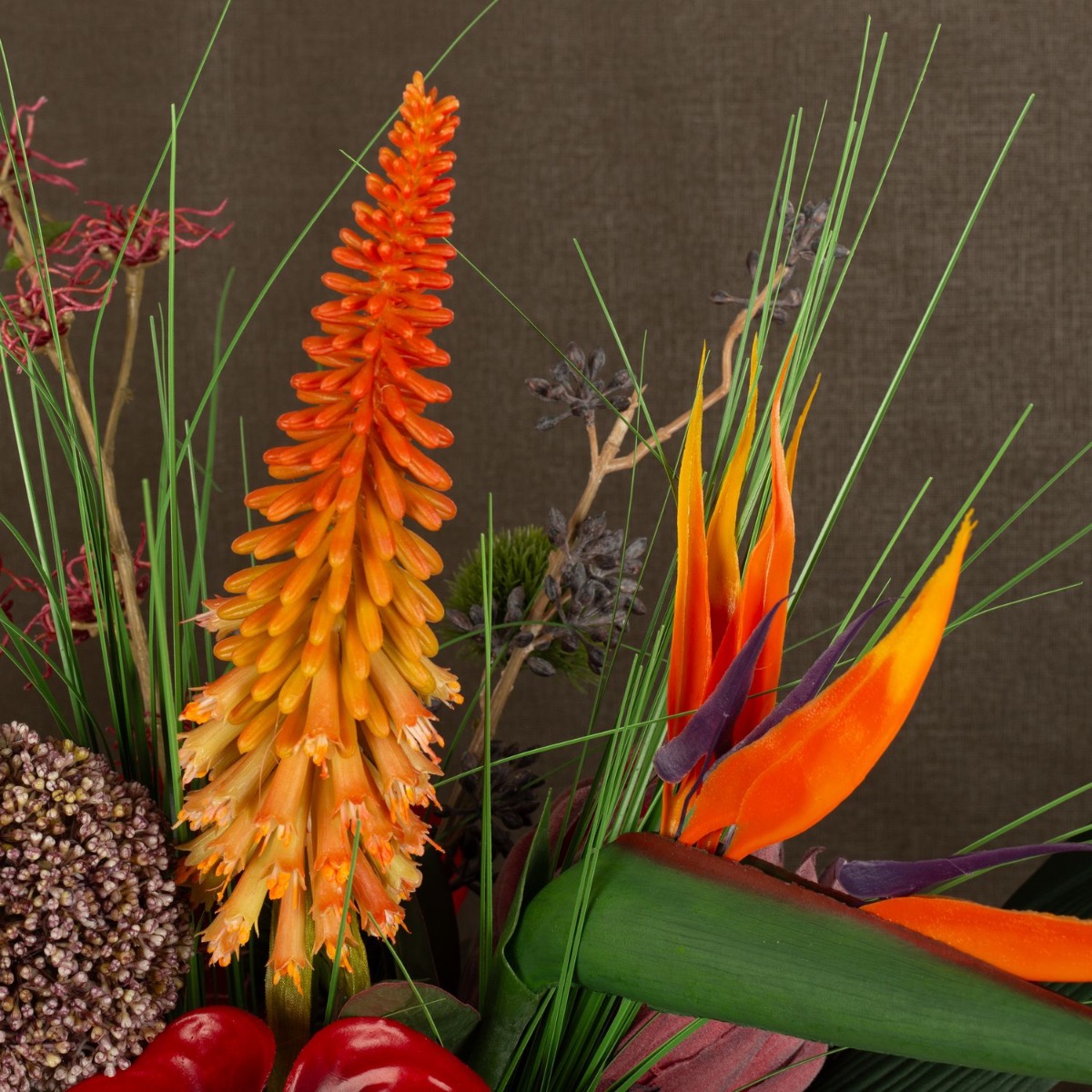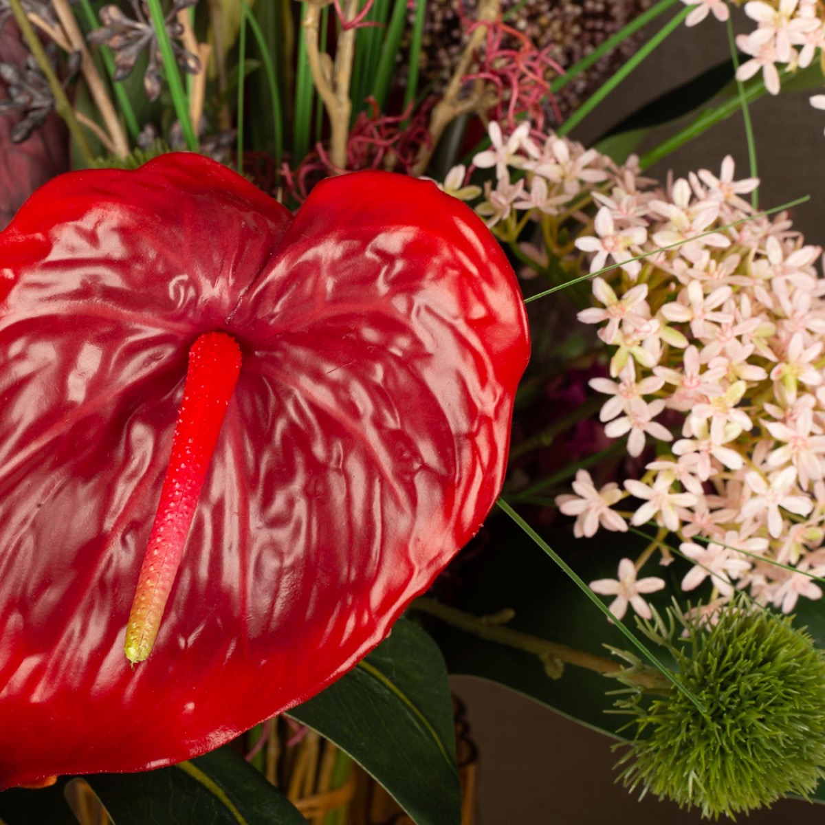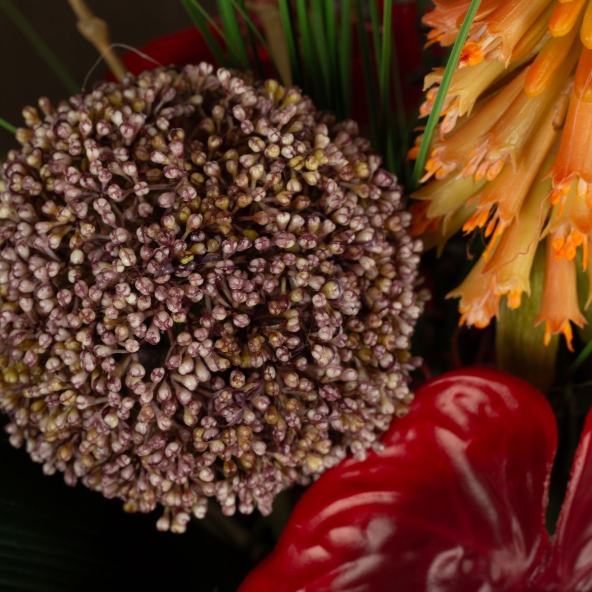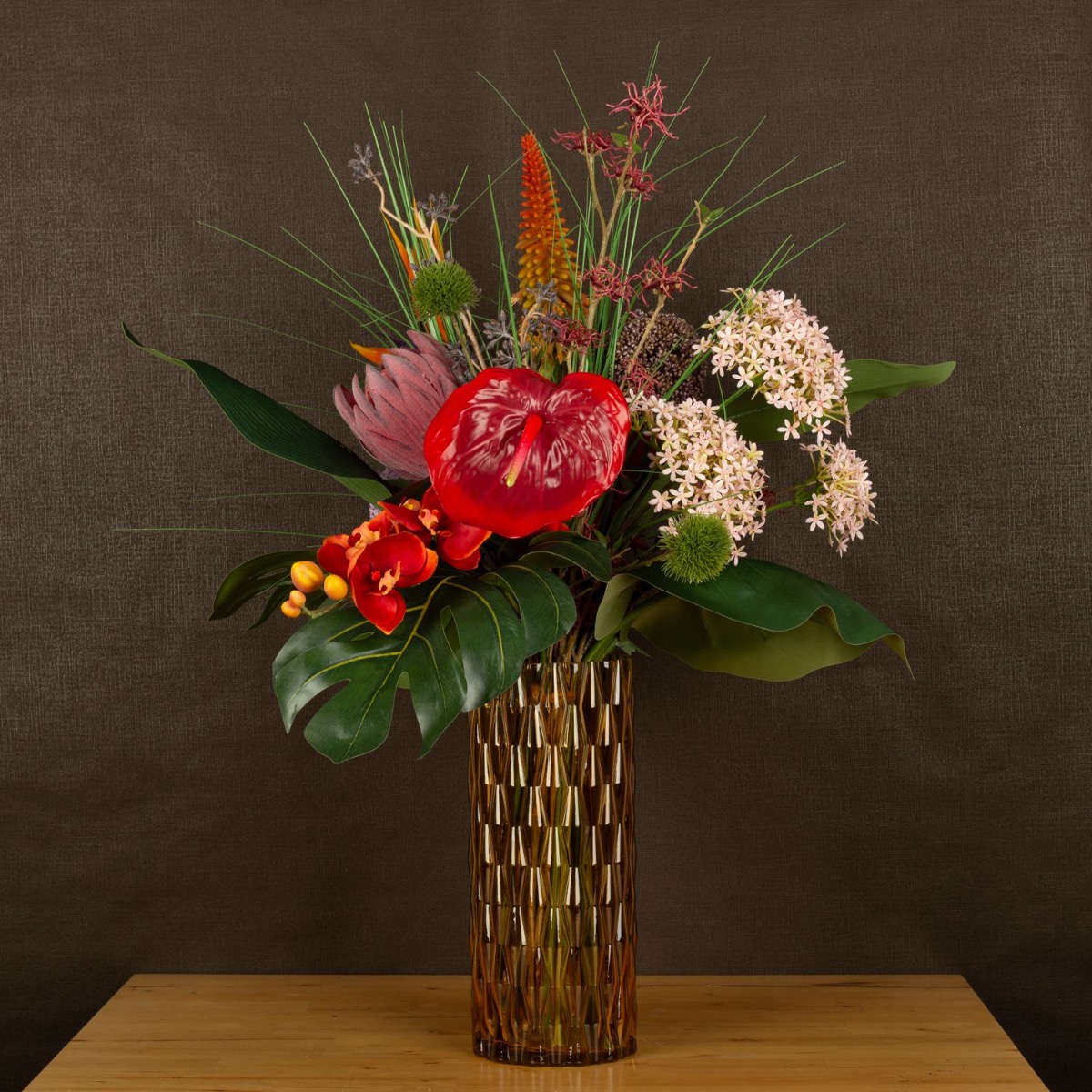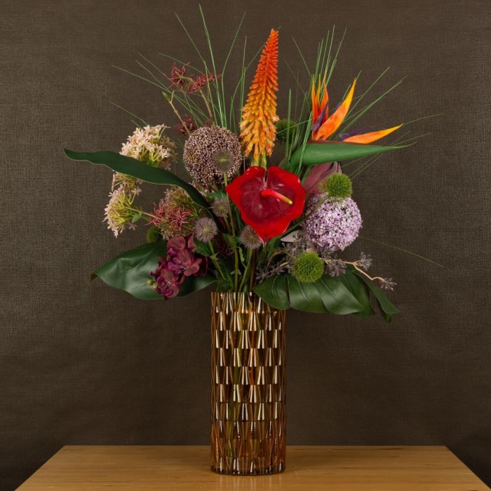 Strelitzia and monstera! A combination that makes every bouquet look exotic. Anthurium, orchids and a red-hot poker shine in vibrant shades of red and orange and bring colour to life. The yellow-orange coloured vase creates an extraordinary play of light with its structure and makes the bouquet shine. Shop the look!